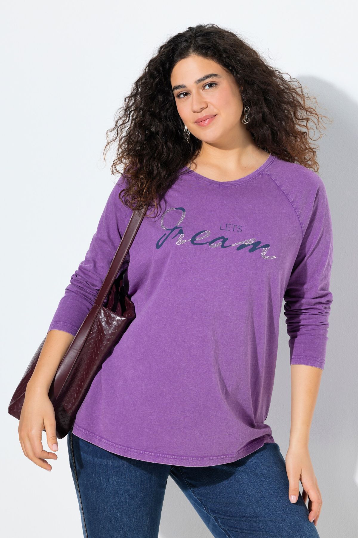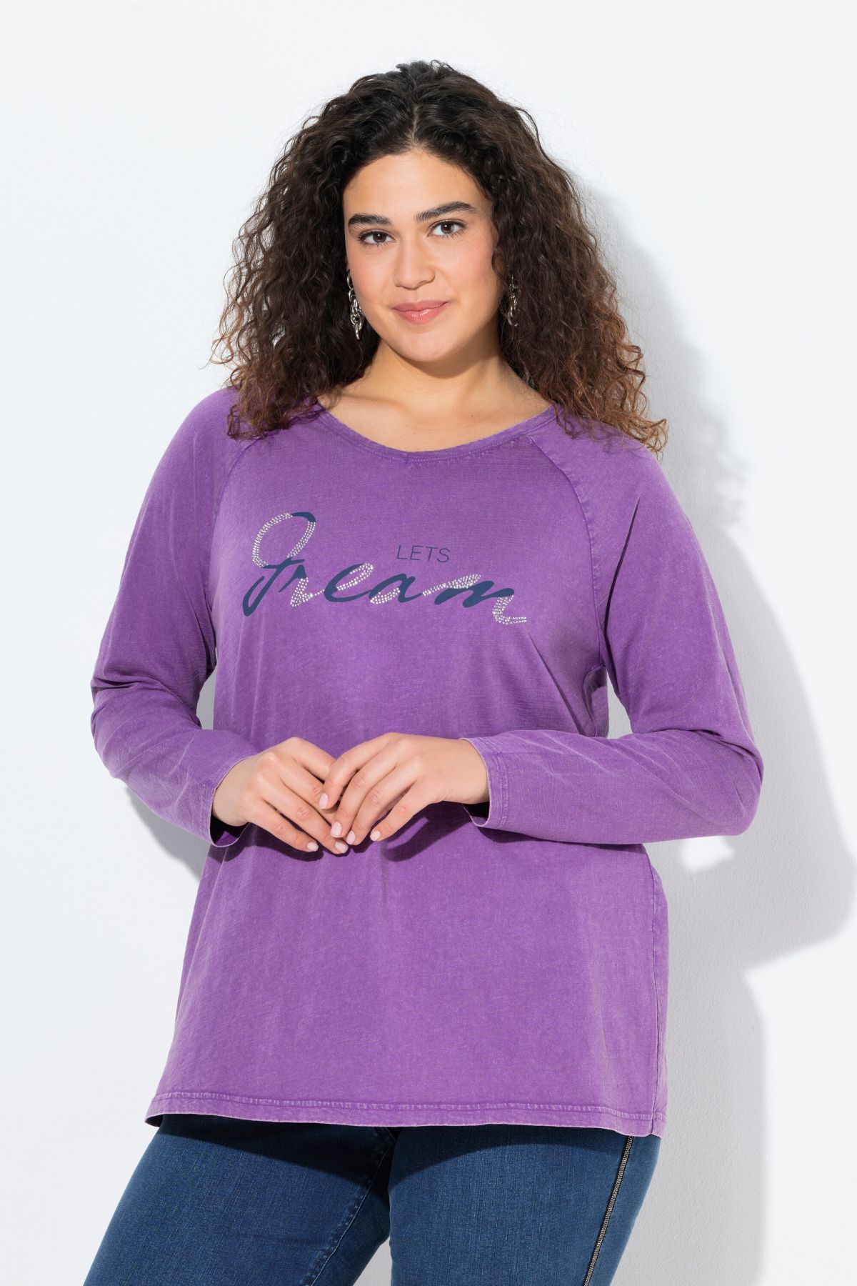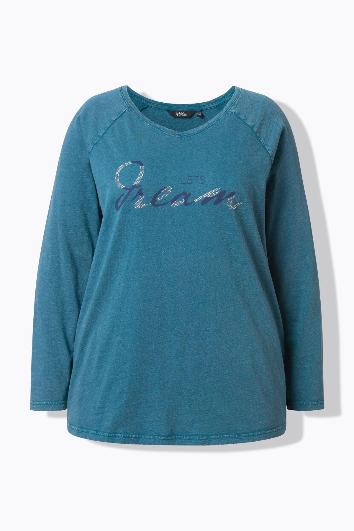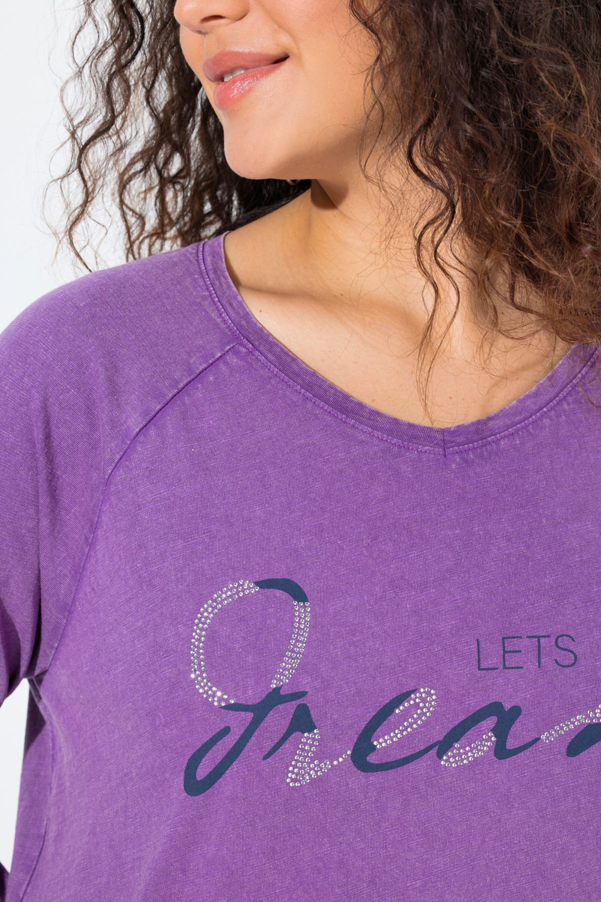 Тениска с надпис с декоративни камъчета. С кръгло деколте и дълги ръкави. От мека, памучна материя.