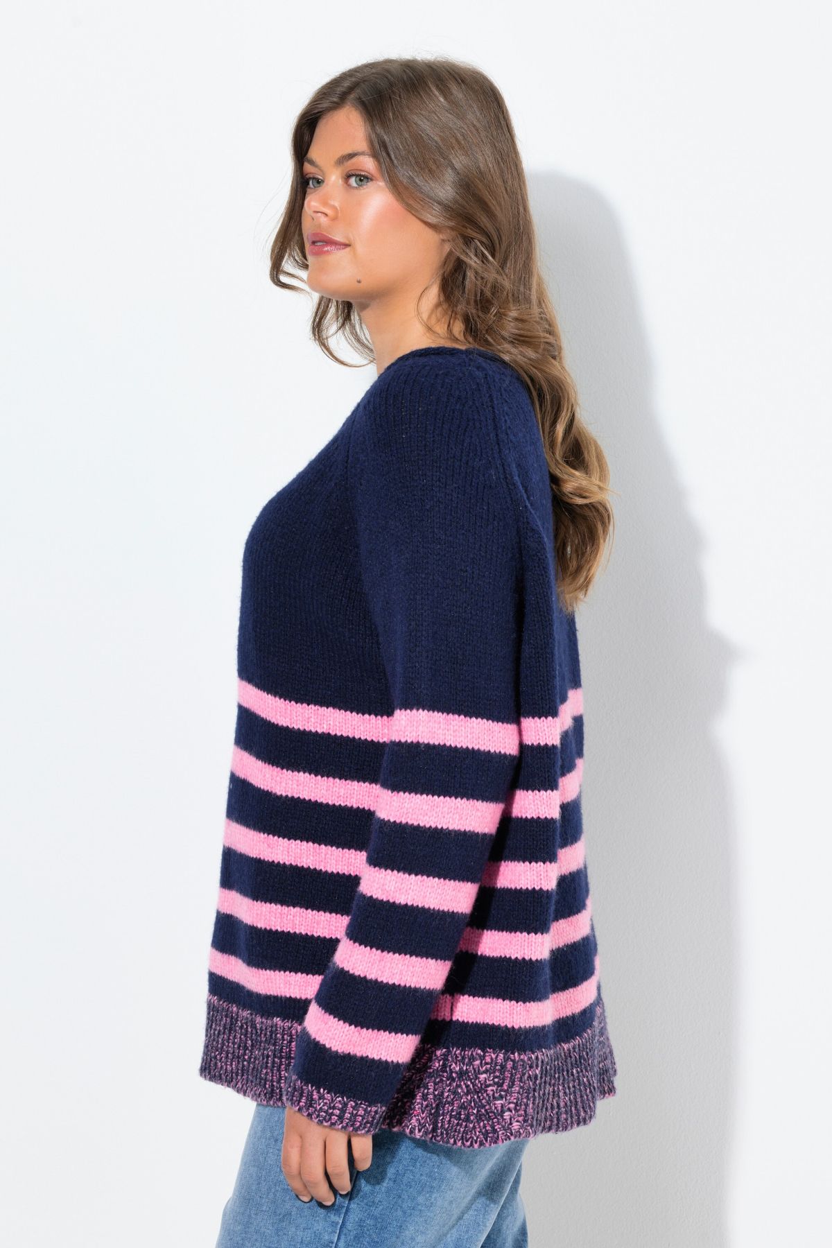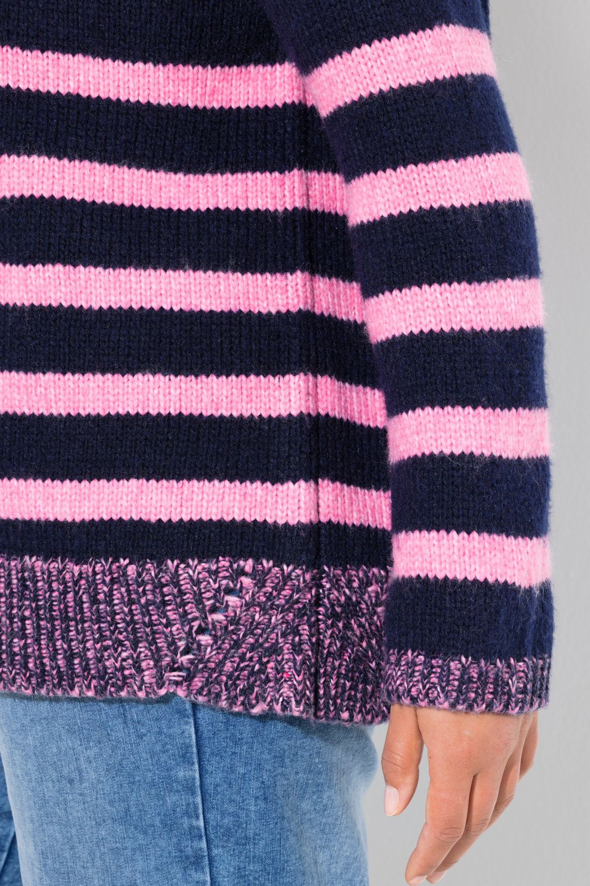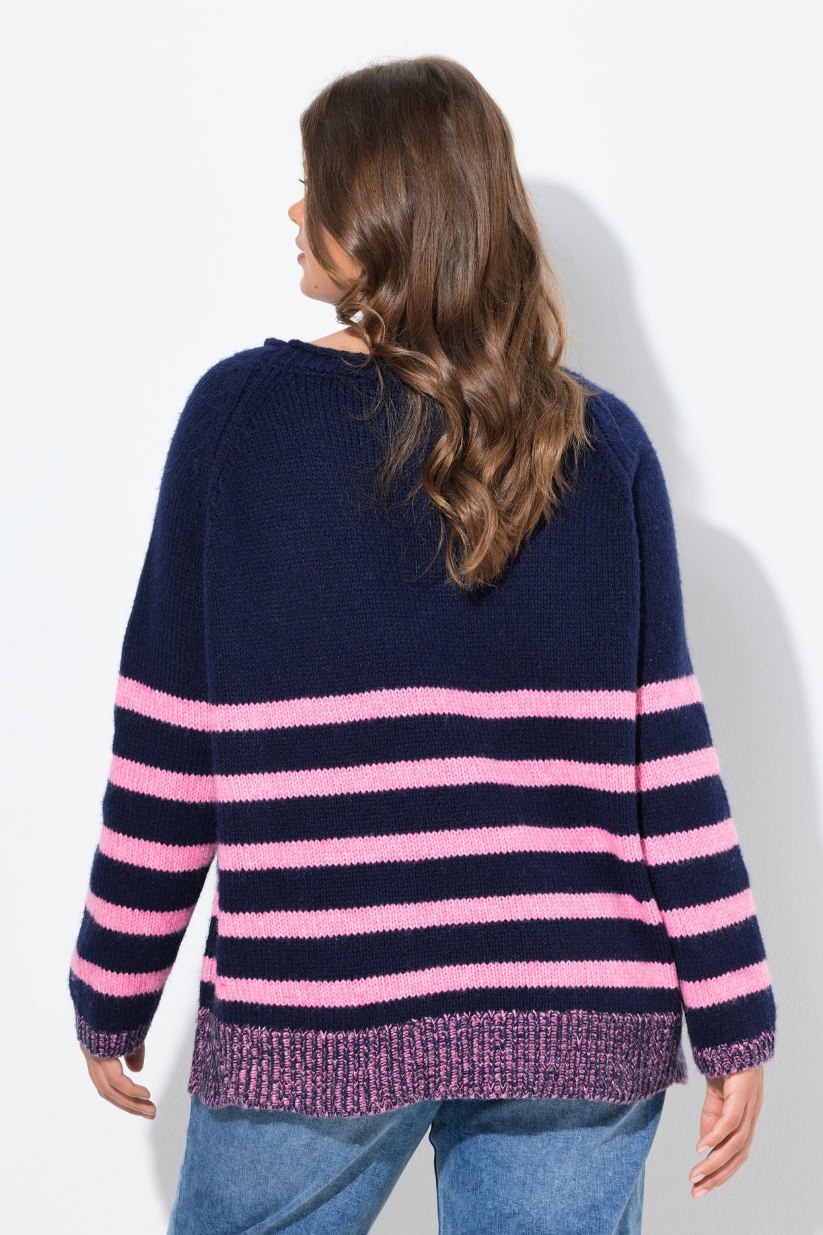 Пуловер от мека фина плетка с раирани акценти в контрастен розов цвят. С кръгло деколте и дълги ръкави. Перфектен за комбиниране с дънки или панталон