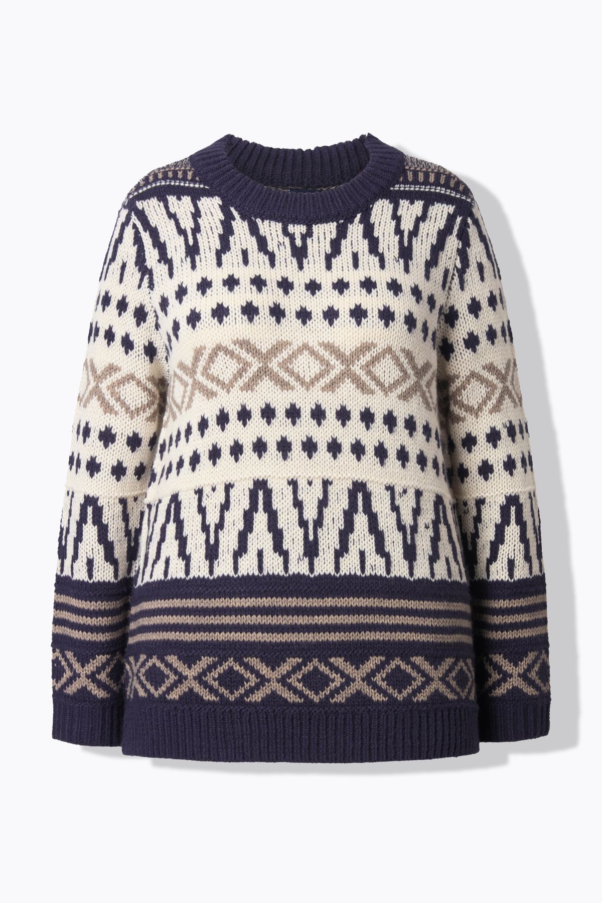 Пуловер с принт на норвежки райета. Идеалният избор за студените, зимни дни. С кръгло деколте по врата и дълги ръкави. От мека, плетена материя.