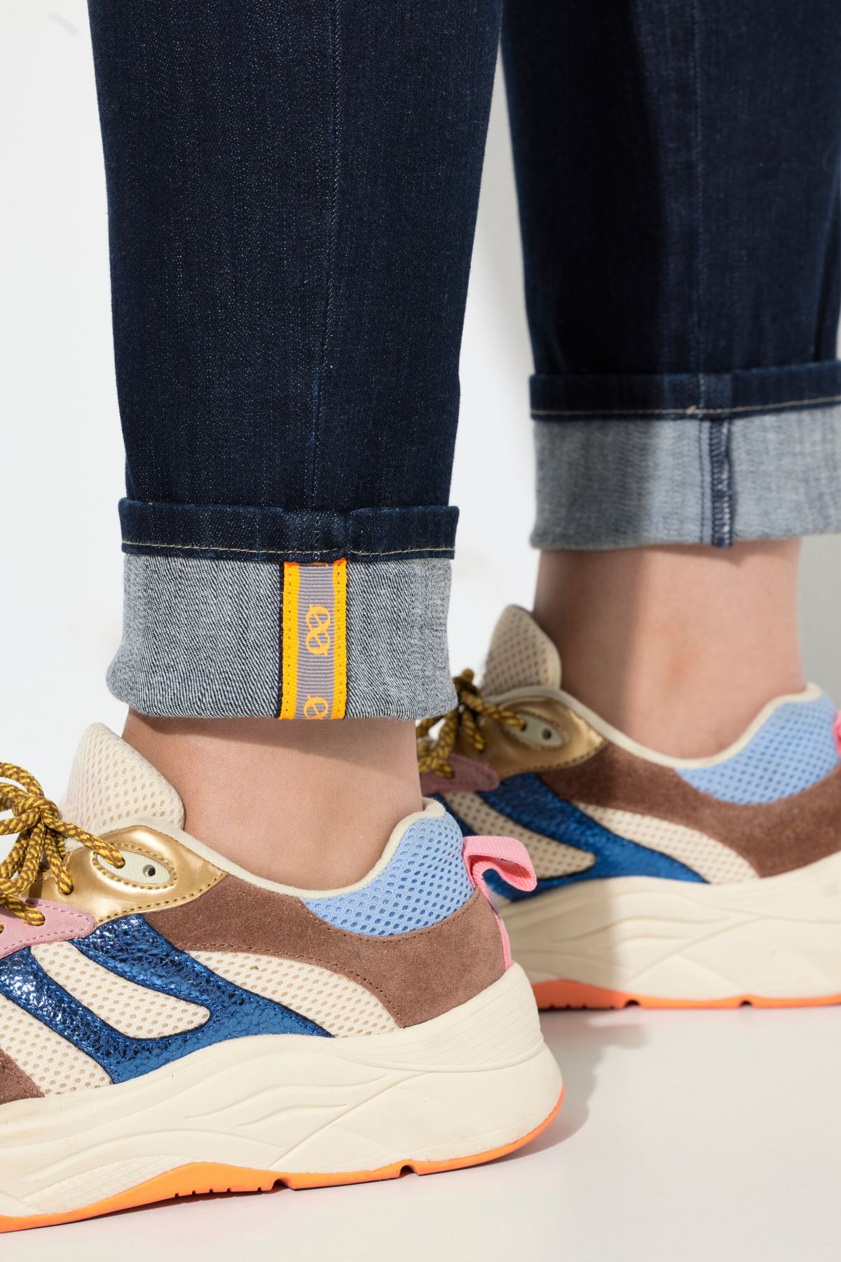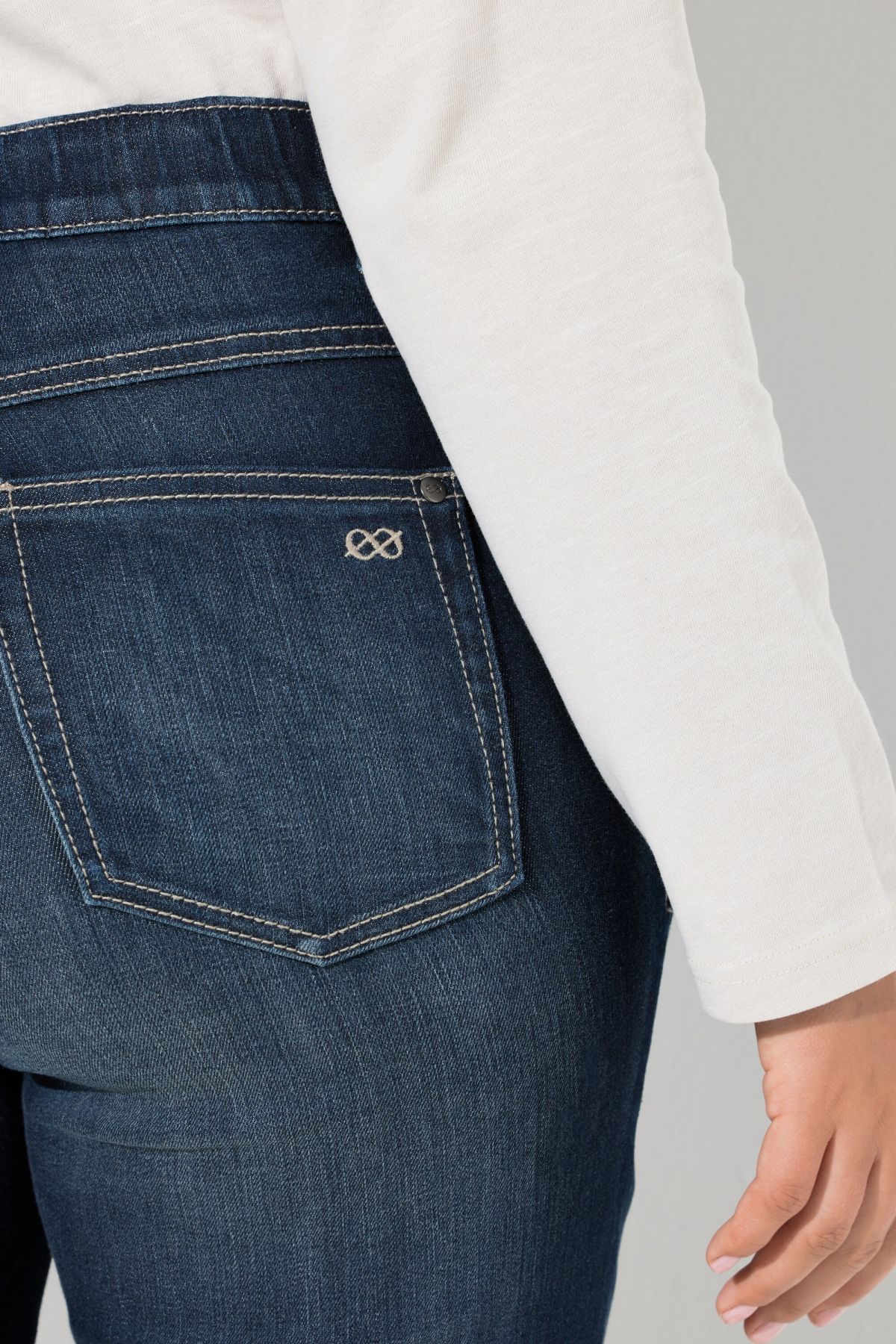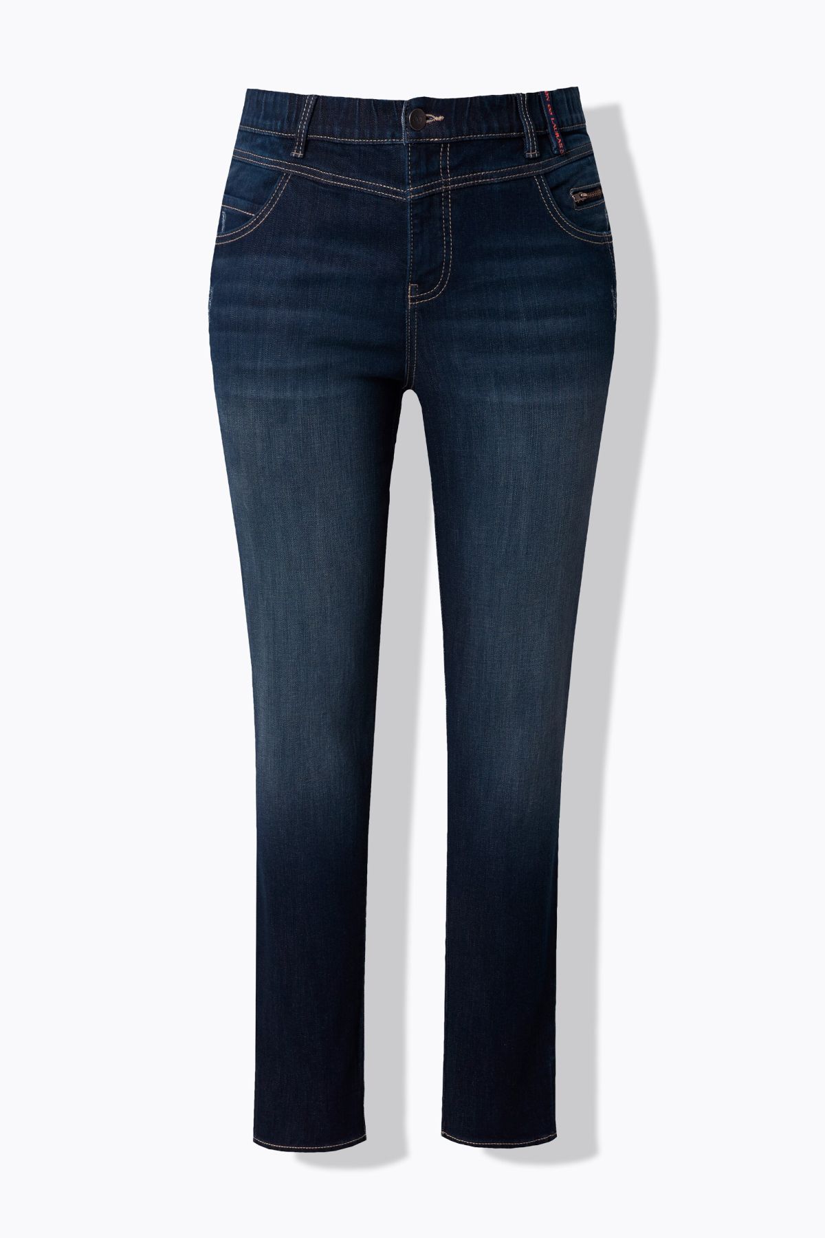 Тесни дънки от мека еластична материя. Дизайн с фиксирана талия с гайки за колан, копче и цип отпред. С висока талия и комфортна кройка за ежедневието.