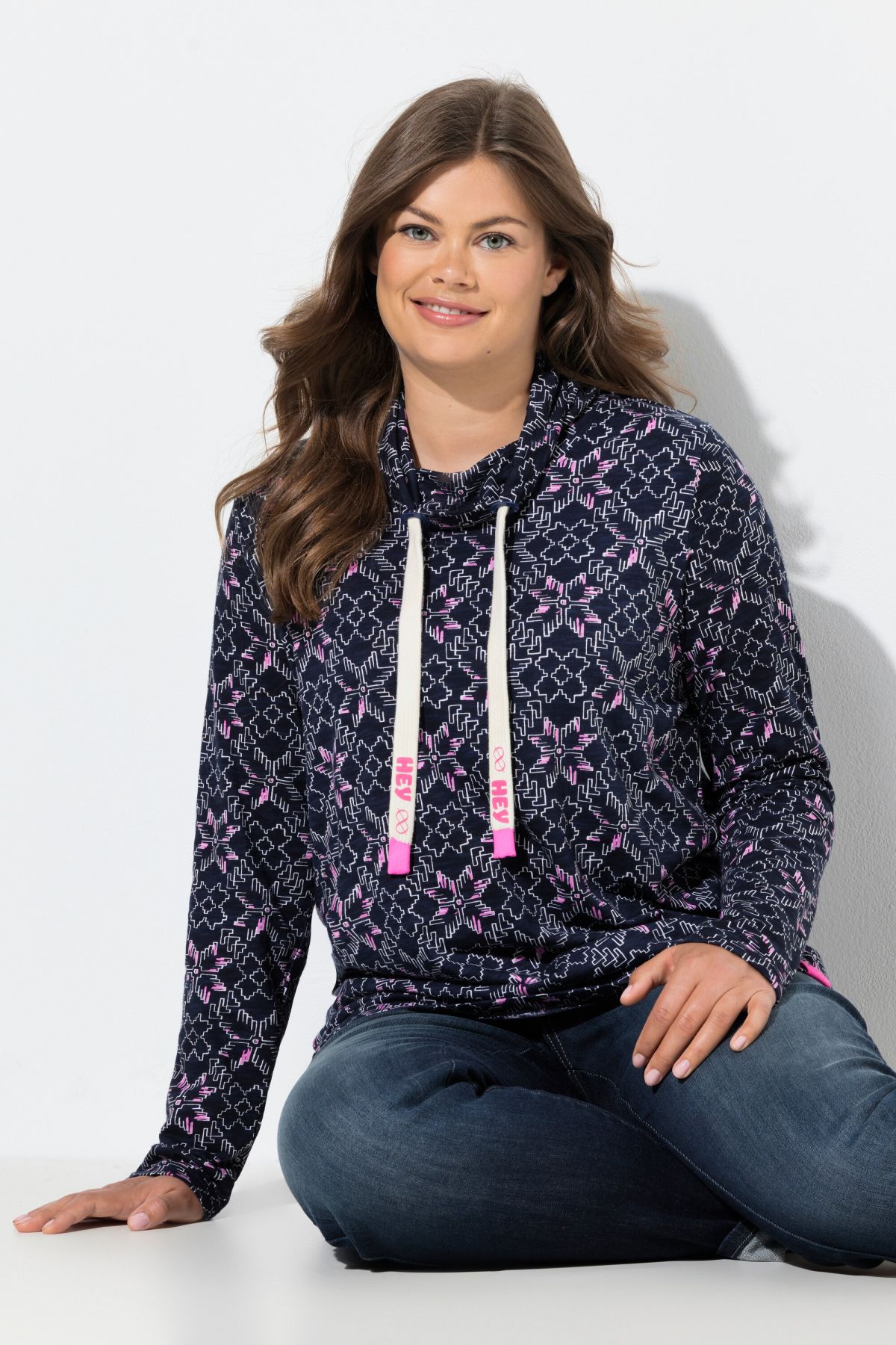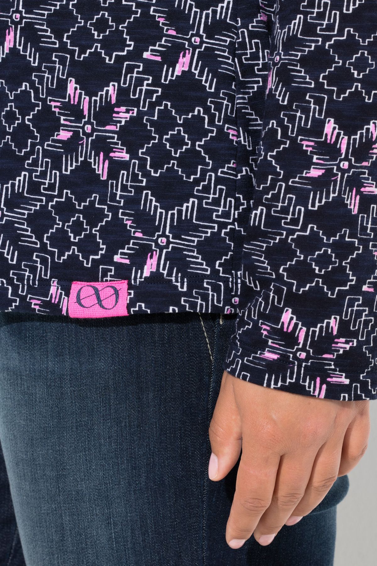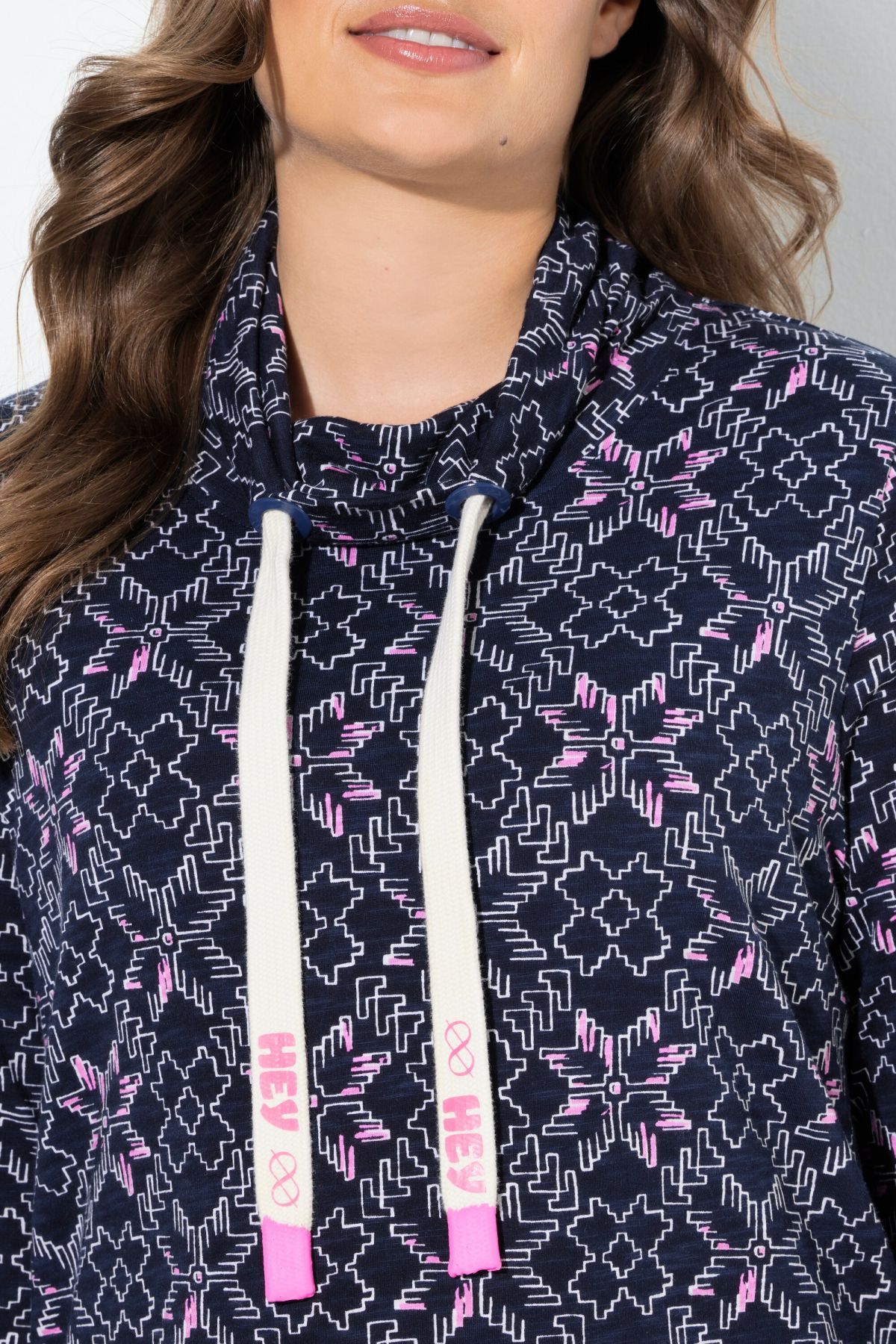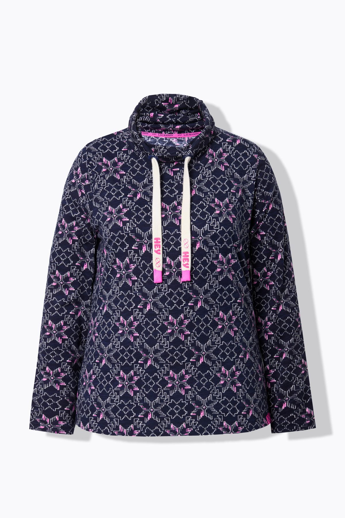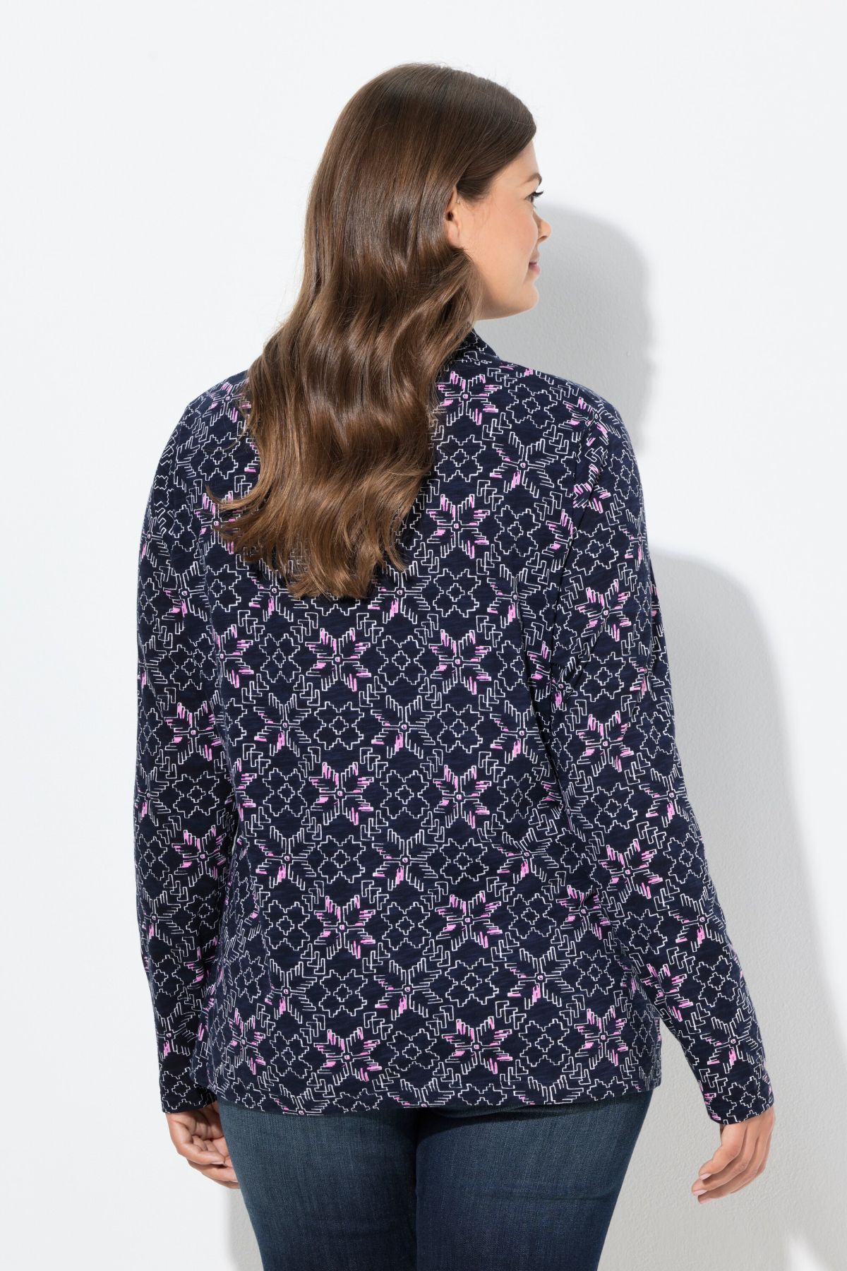 Блуза с модерен принт на снежинки. Перфектният избор за любителите на зимните дни. С изправена яка с контрастни връзки. С дълги ръкави.