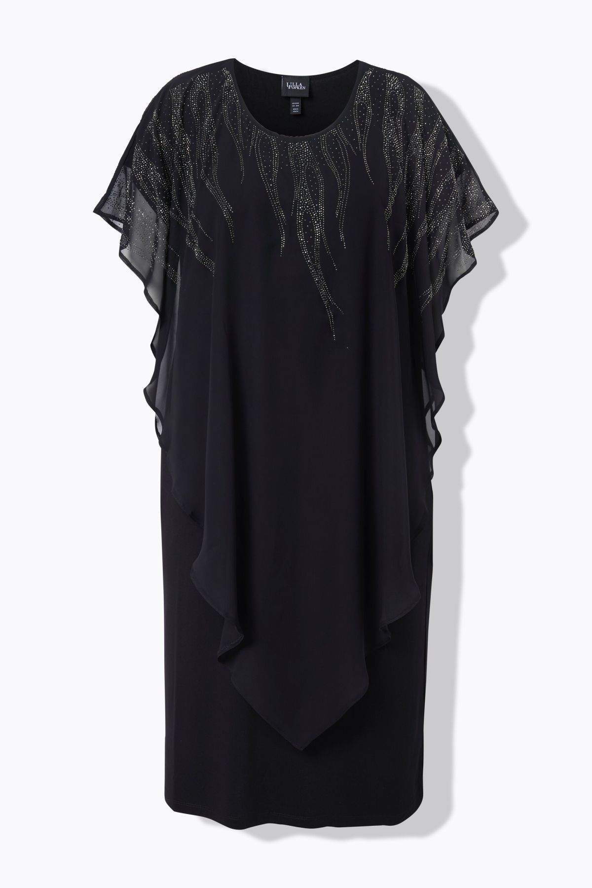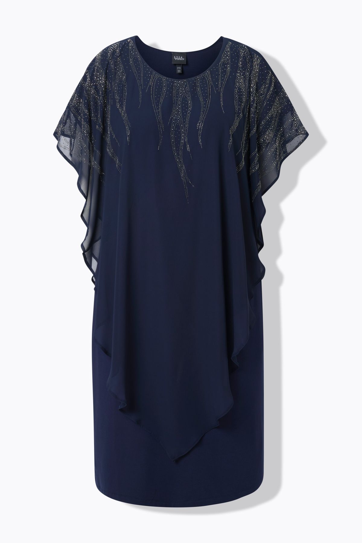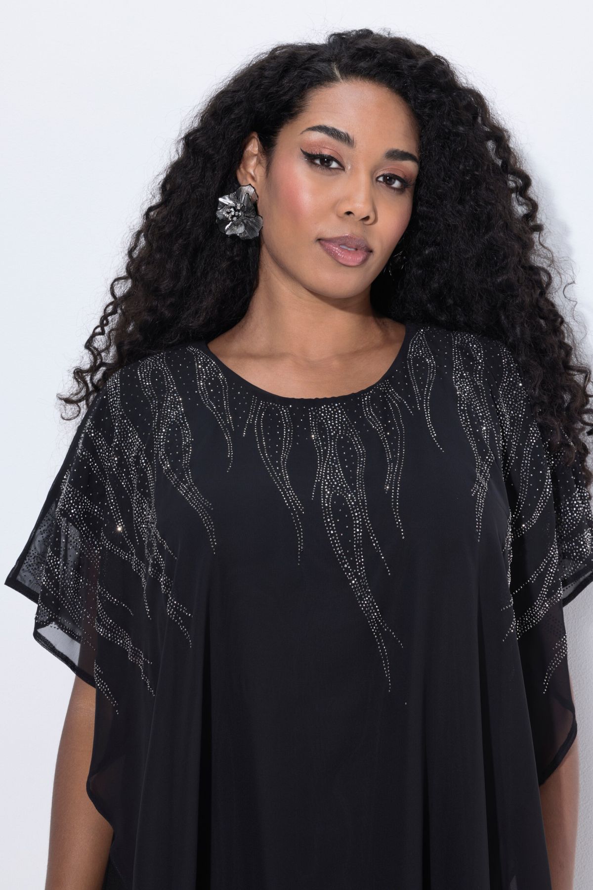 Рокля с шифон с акцент от бляскави камъчета. С кръгло деколте и къси ръкави. С непрозрачна подплата.