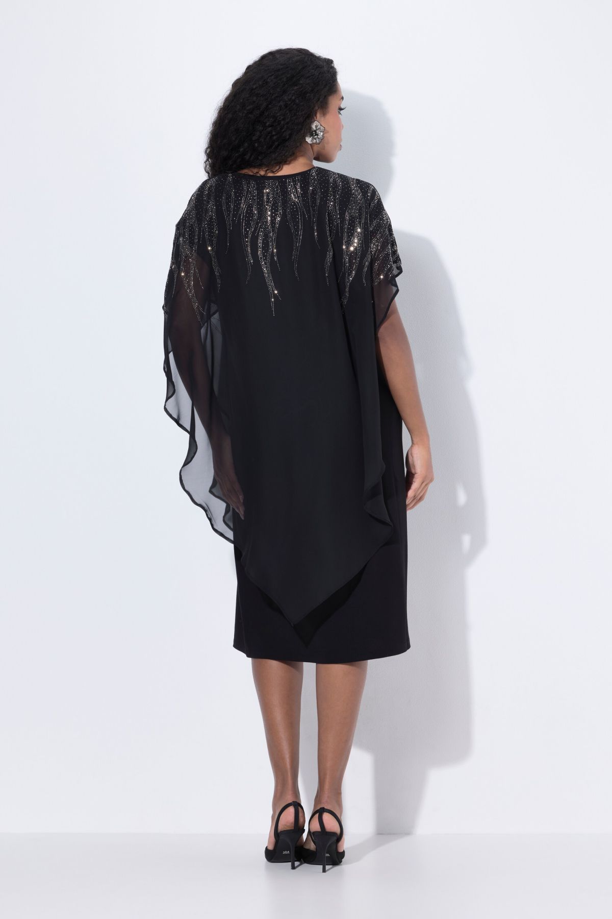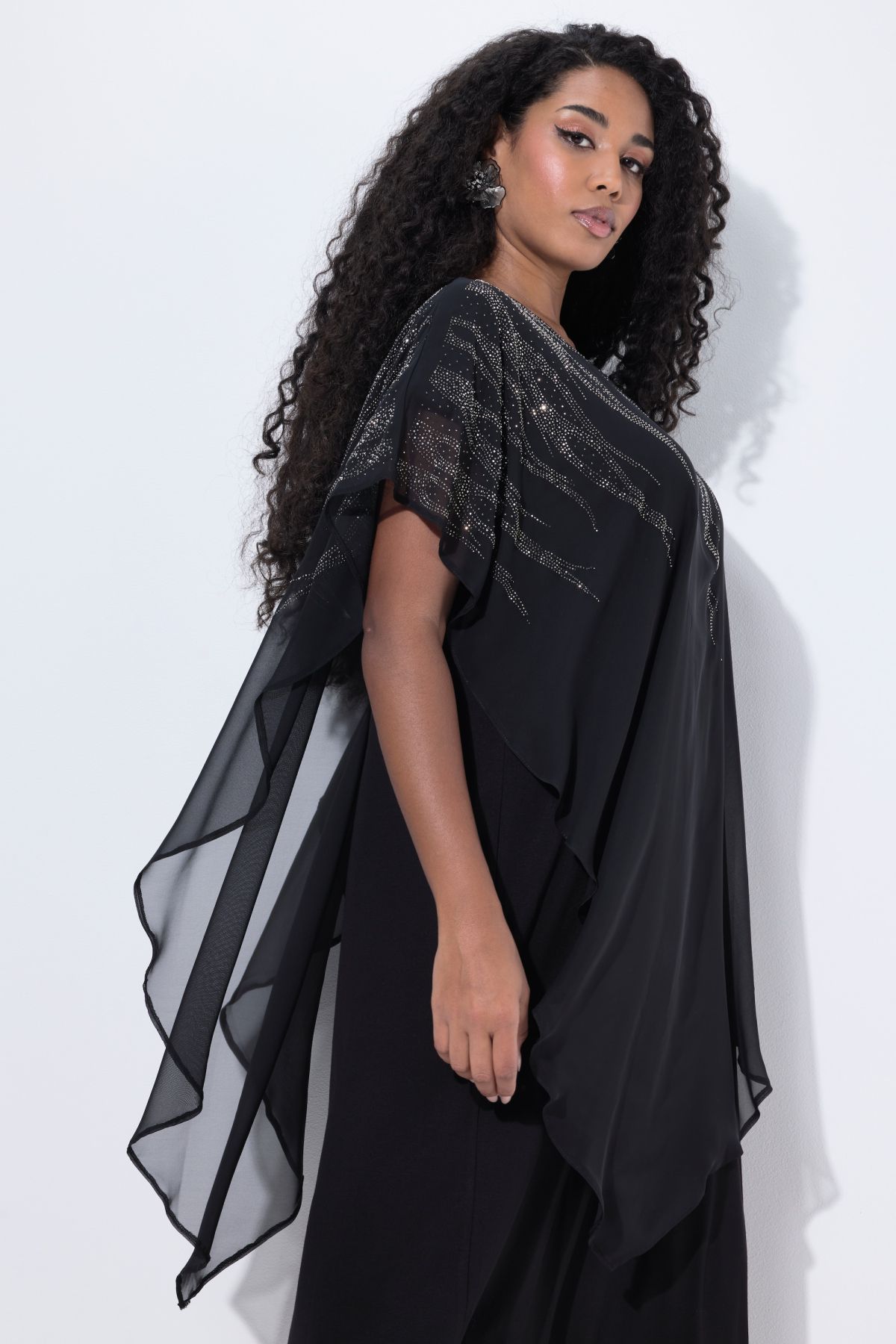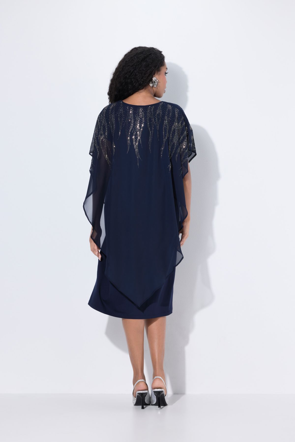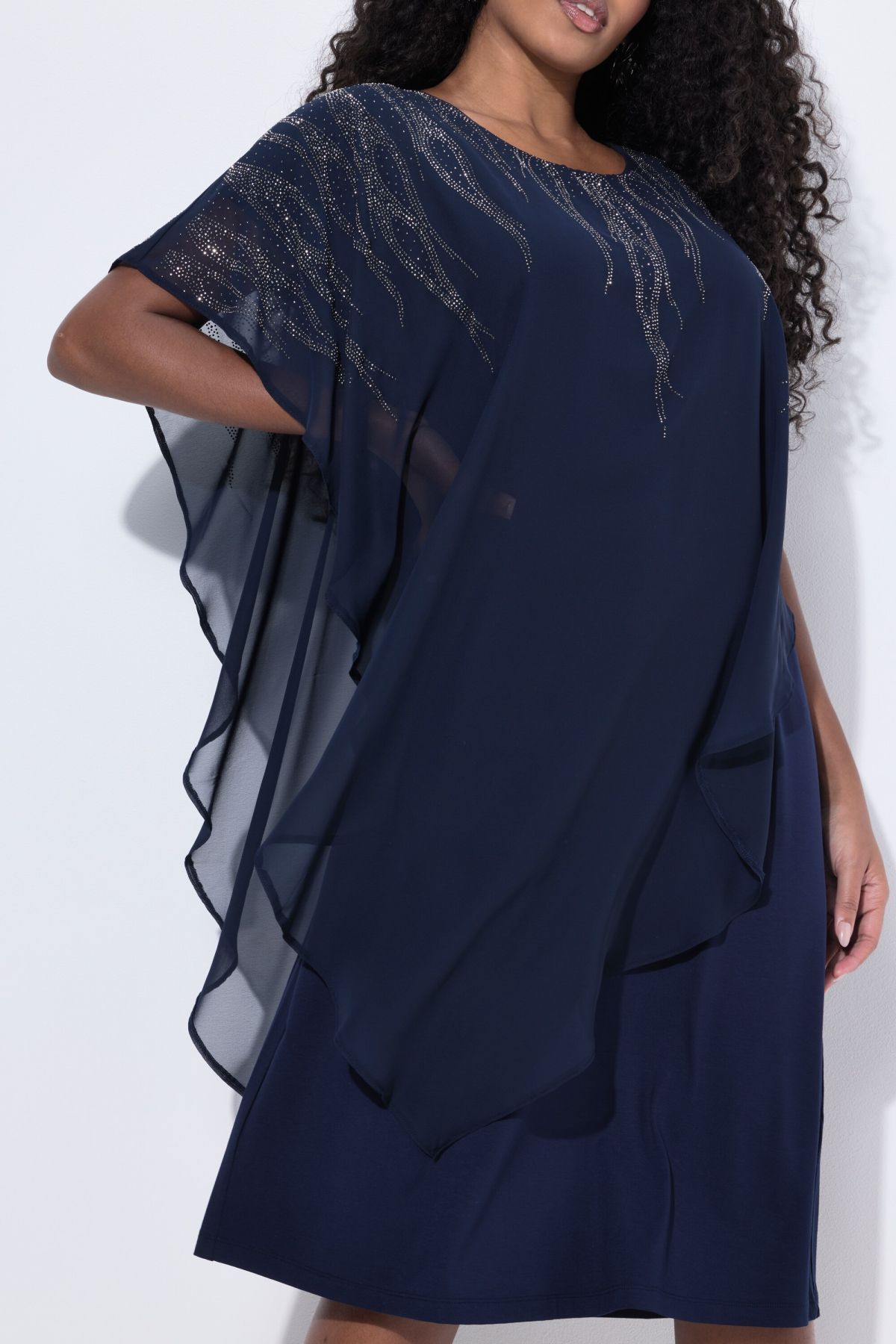 Рокля с шифон с акцент от бляскави камъчета. С кръгло деколте и къси ръкави. С непрозрачна подплата.