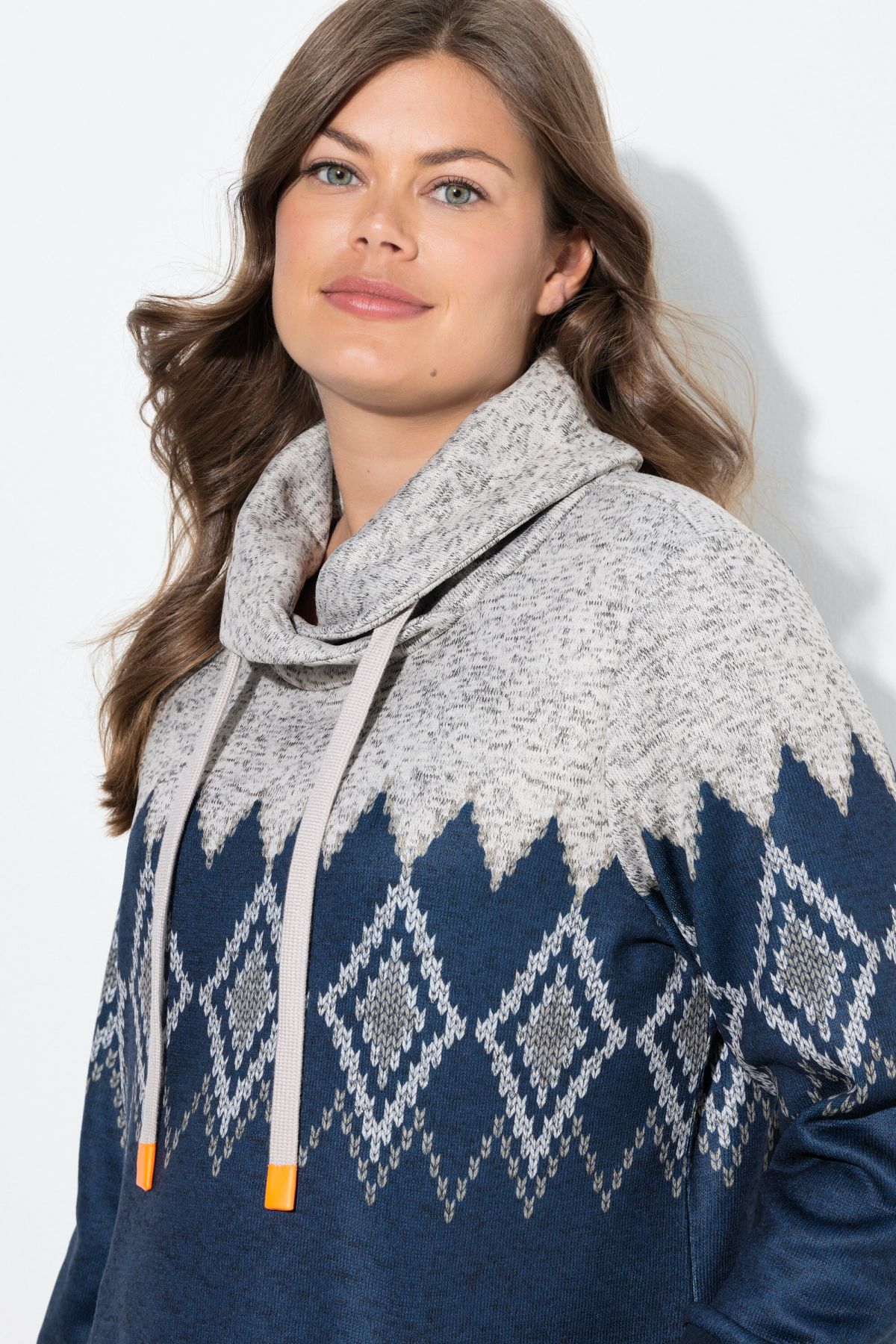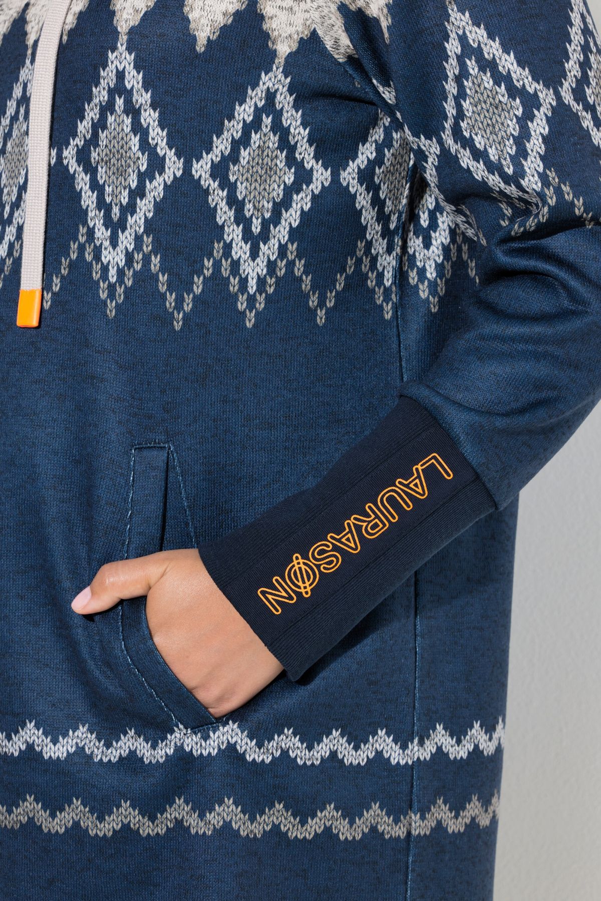 Плетена рокля с принт на норвежки райета с поларена подплата. С качулка с връзки, странични джобове и дълги ръкави. Мека, топла и приятна за прохладните дни