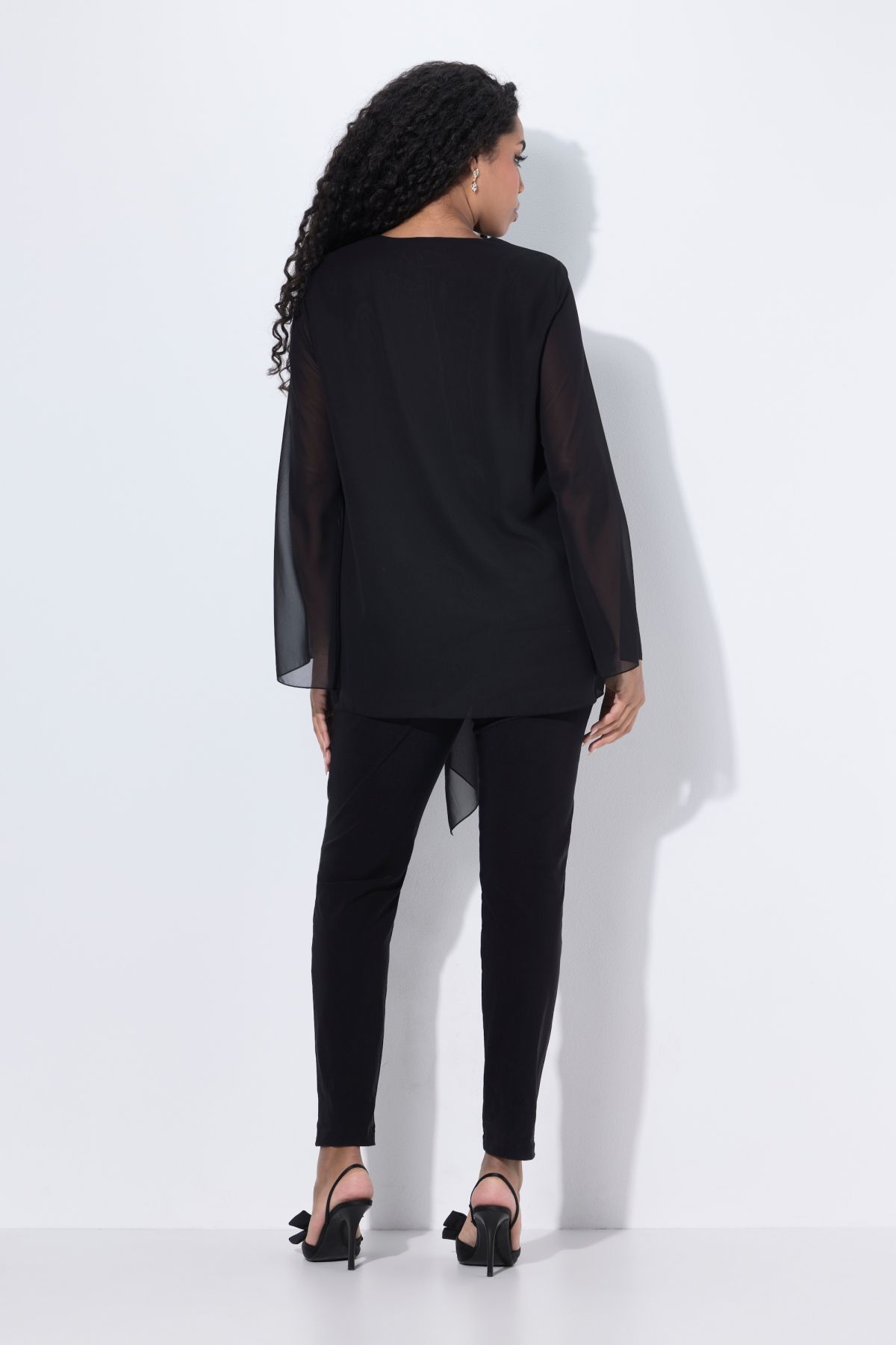 Блуза с шифон с асиметричен подгъв. С елегантна кройка. С V - образно деколте и дълги ръкави с разкроени маншети. Стил във всяка ситуация.