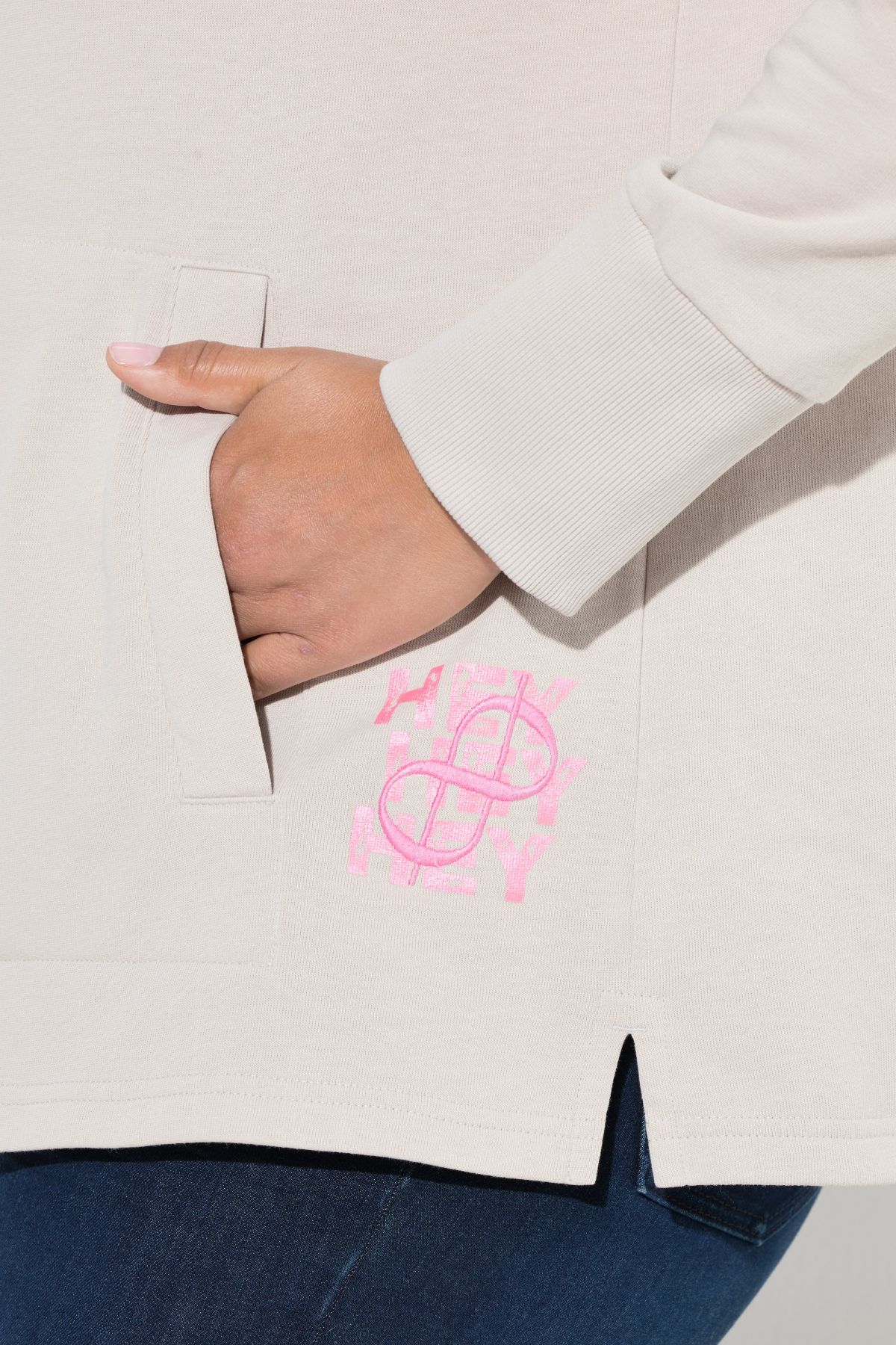 Суитчър с качулка с контрастен принт. Със странични джобове и дълги ръкави. От мека, топла материя.