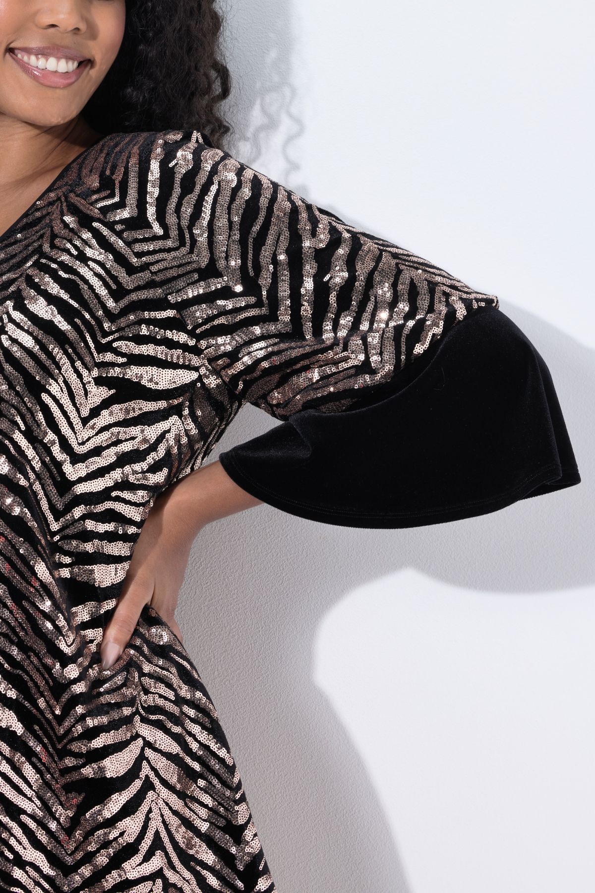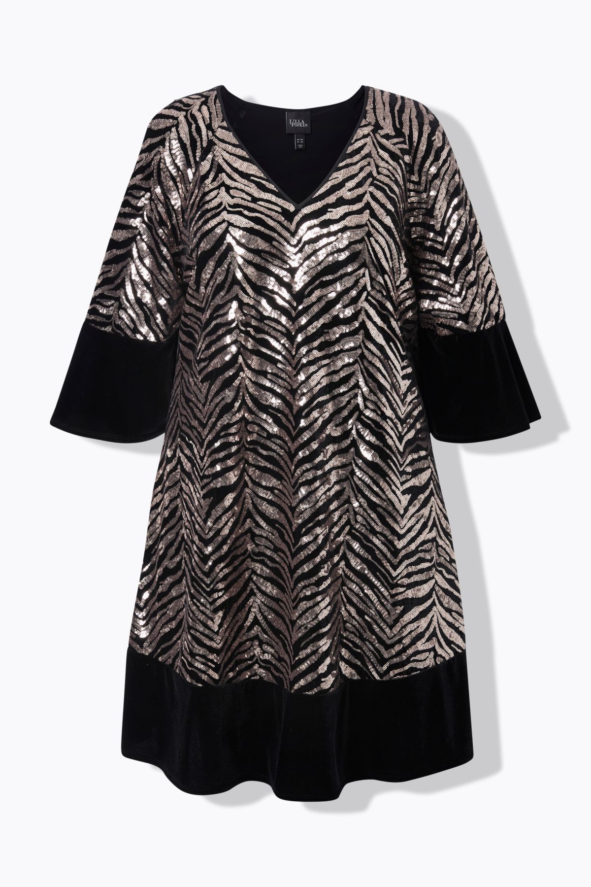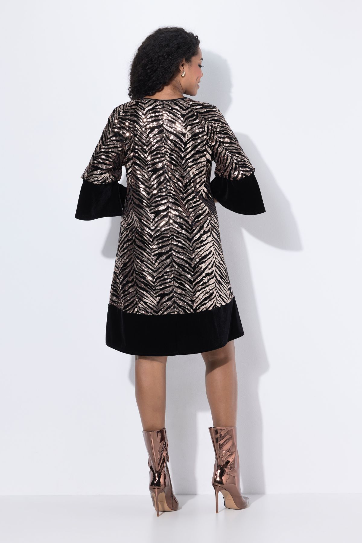 Пайетена рокля с тигрови райета. С 3/4 ръкави с контрастен маншет и подгъв с акцент. С А - линия на силуета. Елегантност на всеки повод.