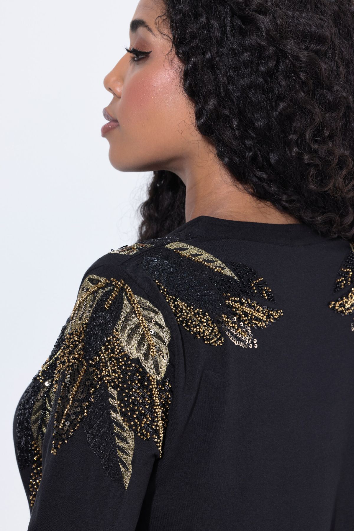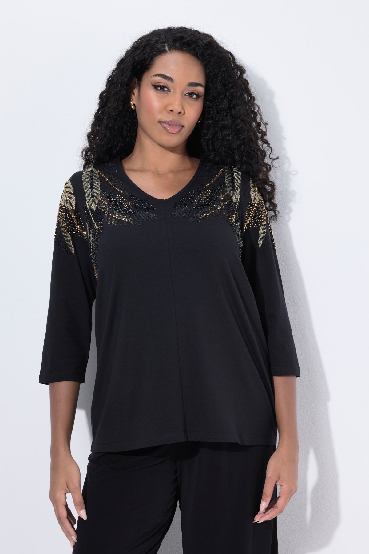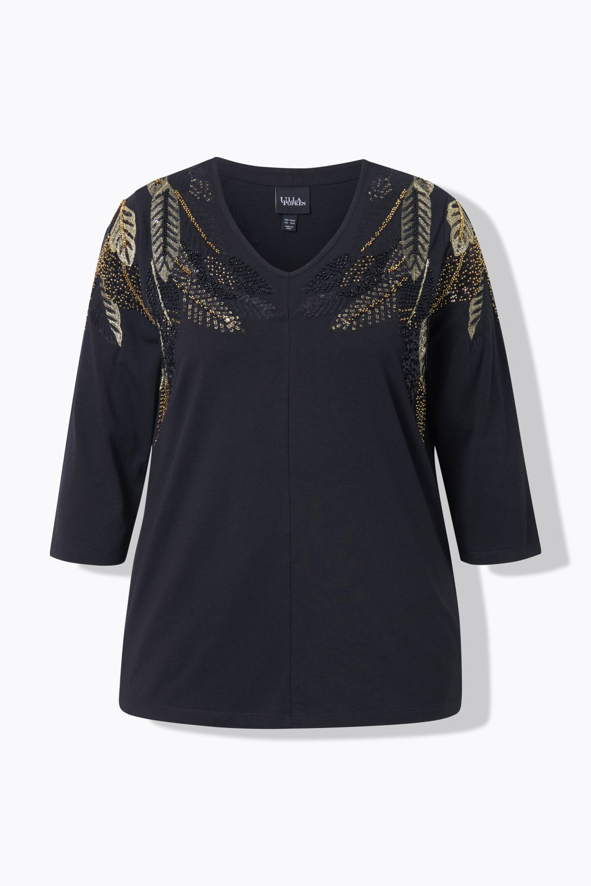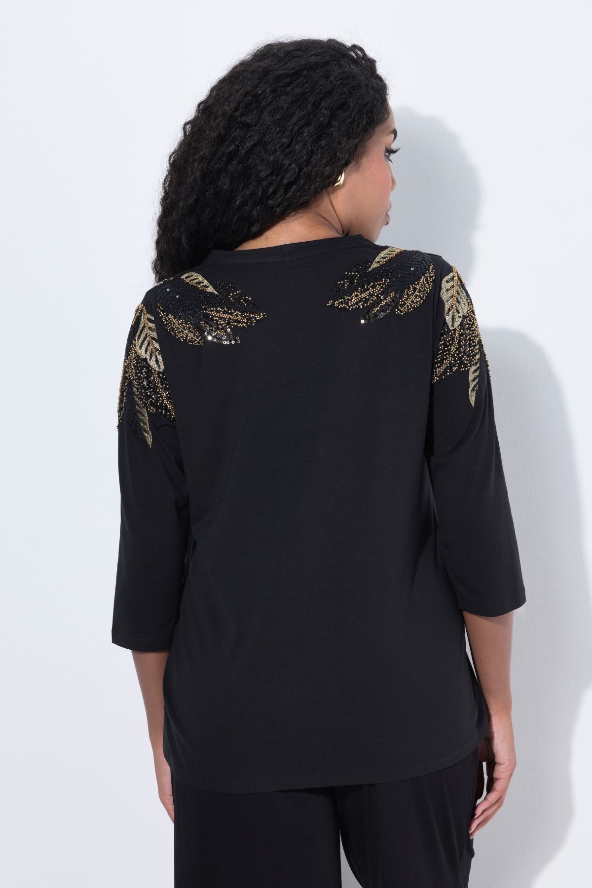 Блуза с цветя на раменете. От мека, трикотажна материя. С кръгло деколте и 3/4 ръкави.