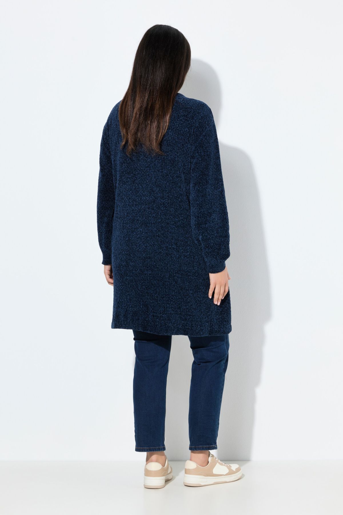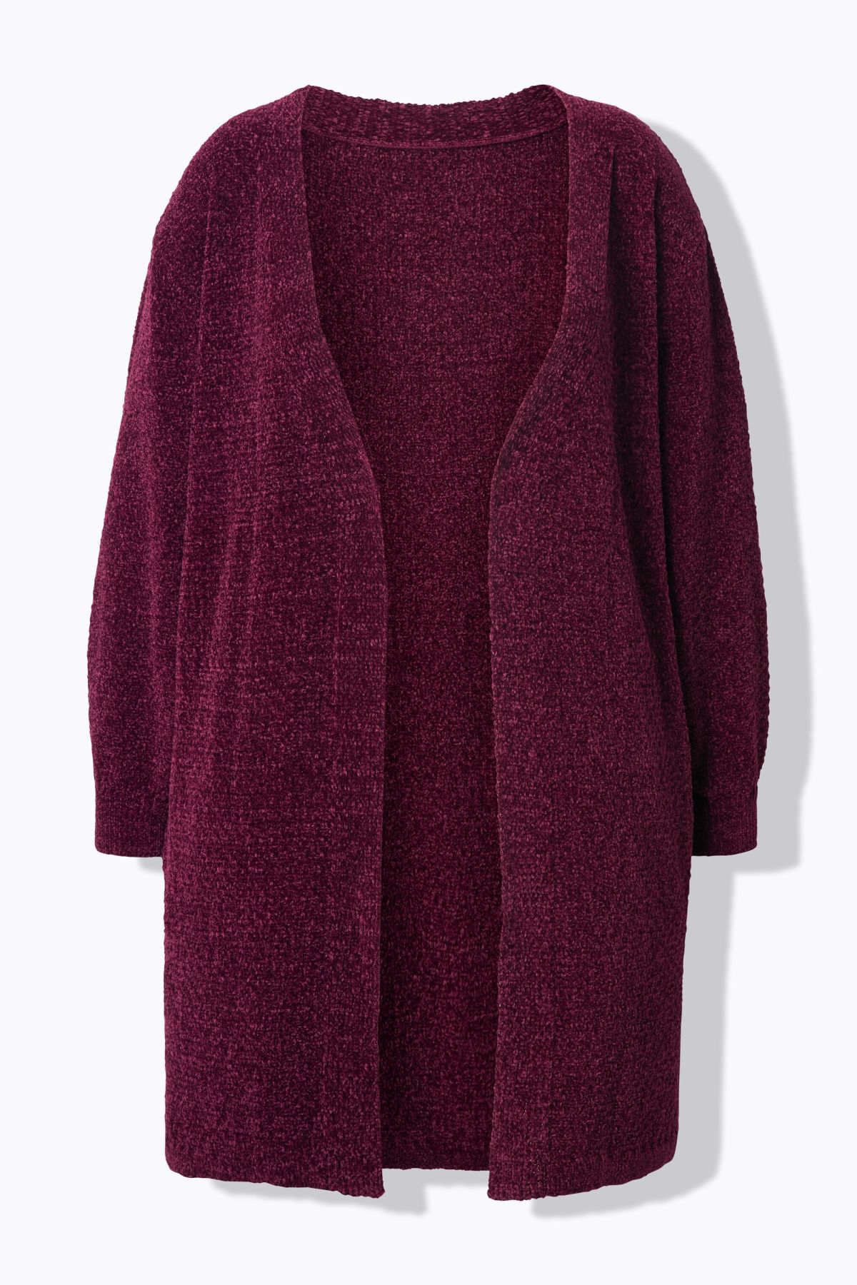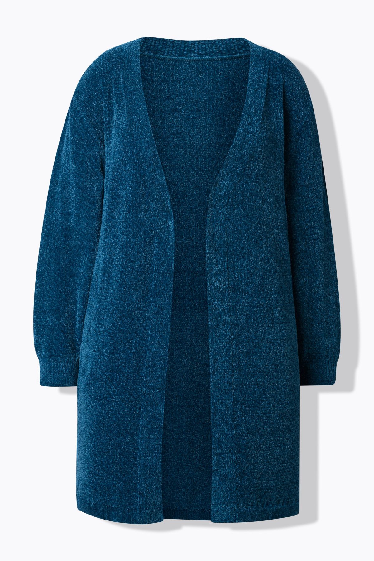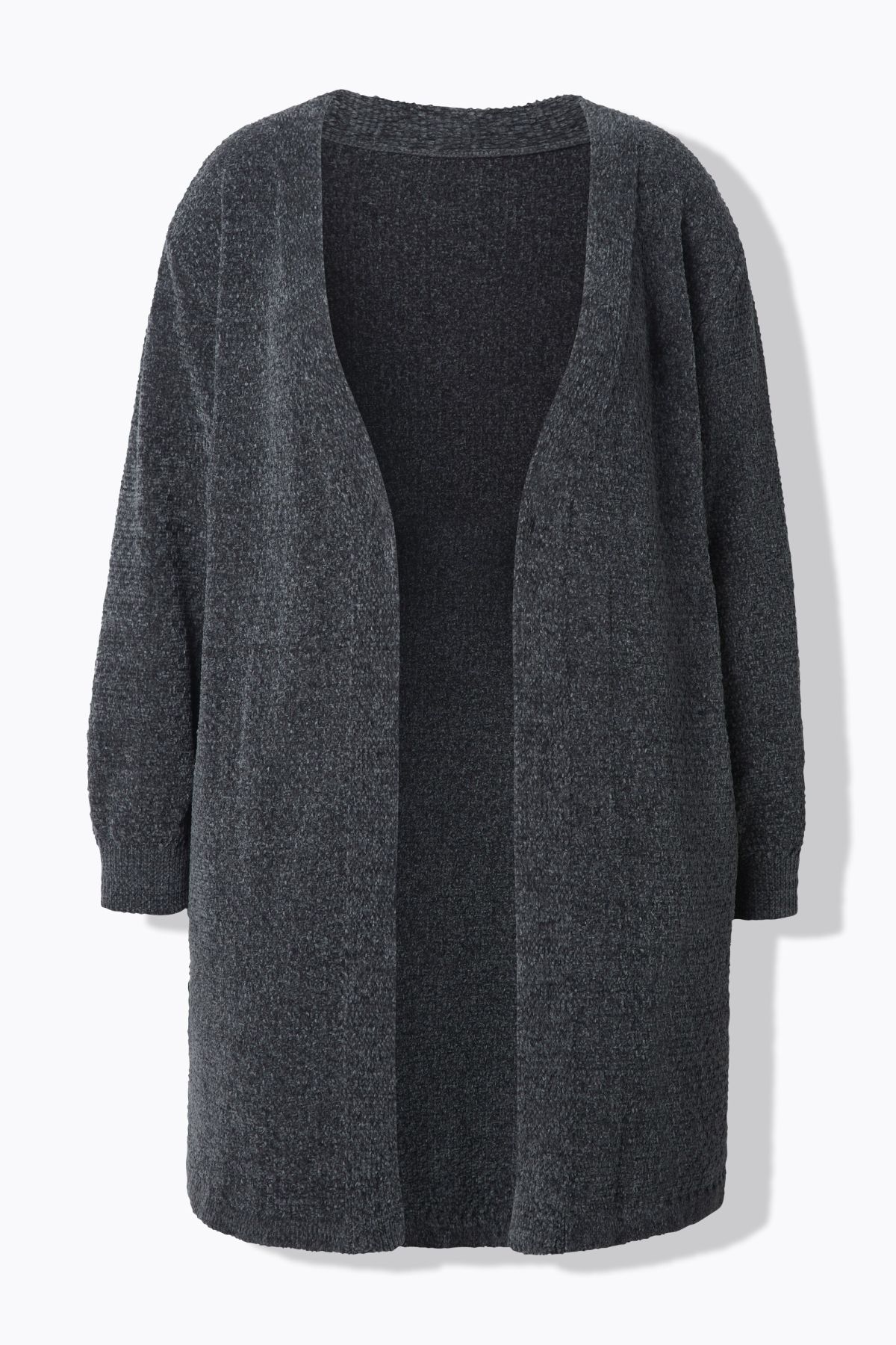 Пухкава жилетка с отворена кройка отпред. С издължен силует и дълги ръкави. Мека, топла и с комфортни странични джобове