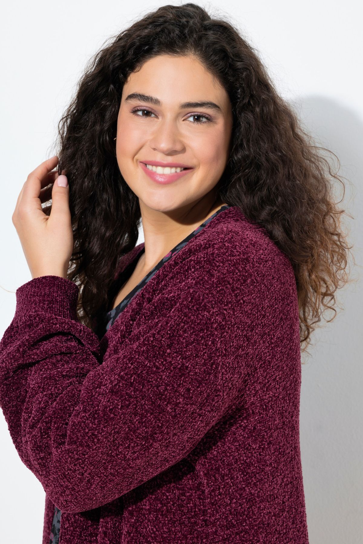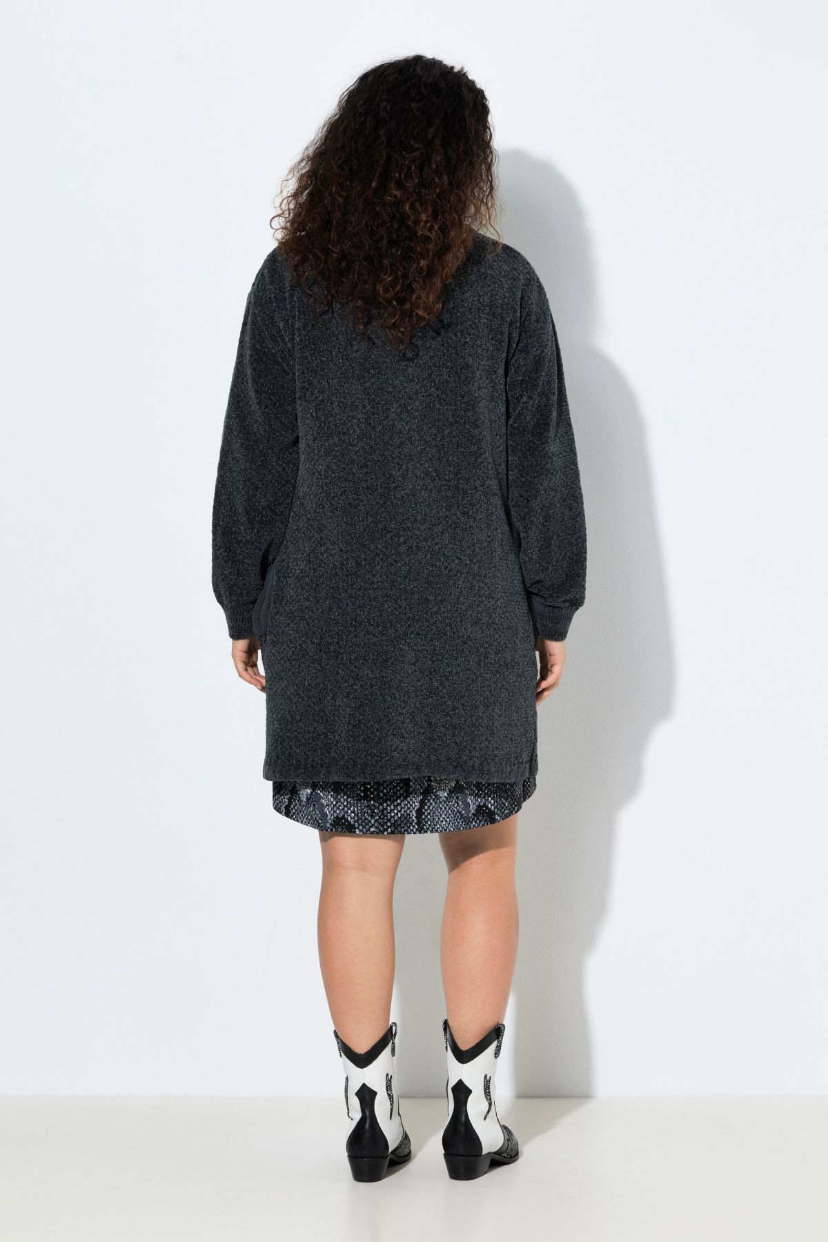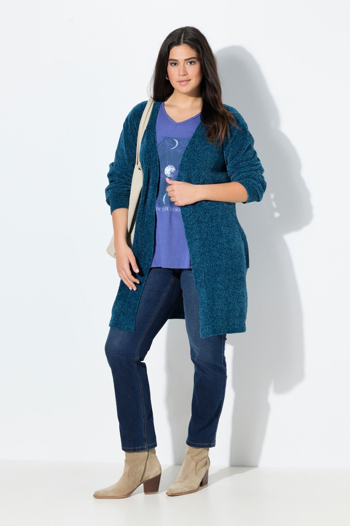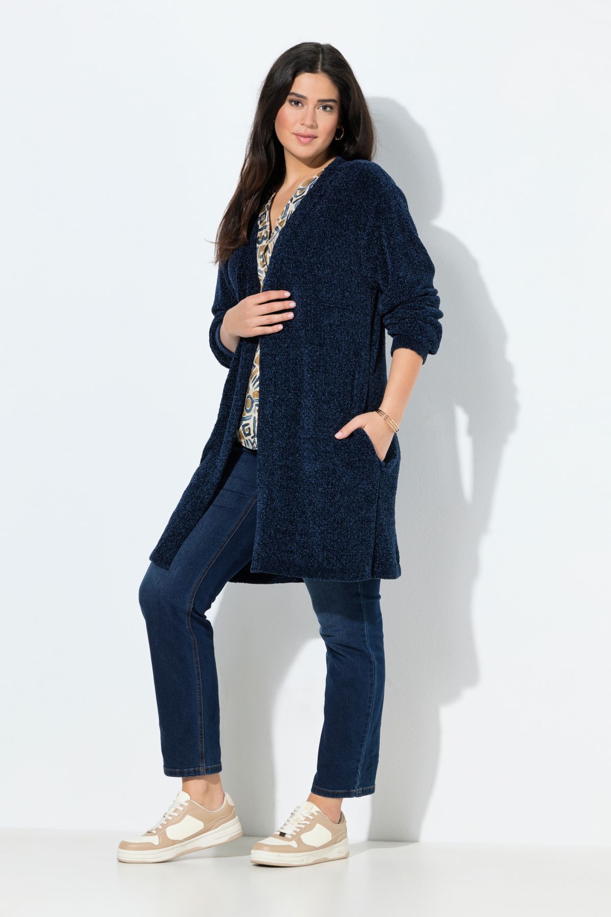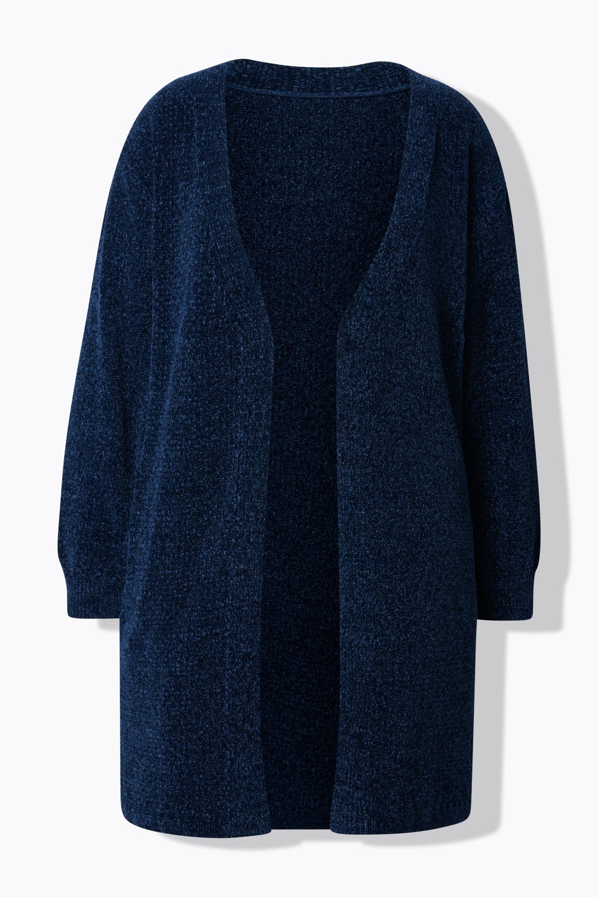 Пухкава жилетка с отворена кройка отпред. С издължен силует и дълги ръкави. Мека, топла и с комфортни странични джобове