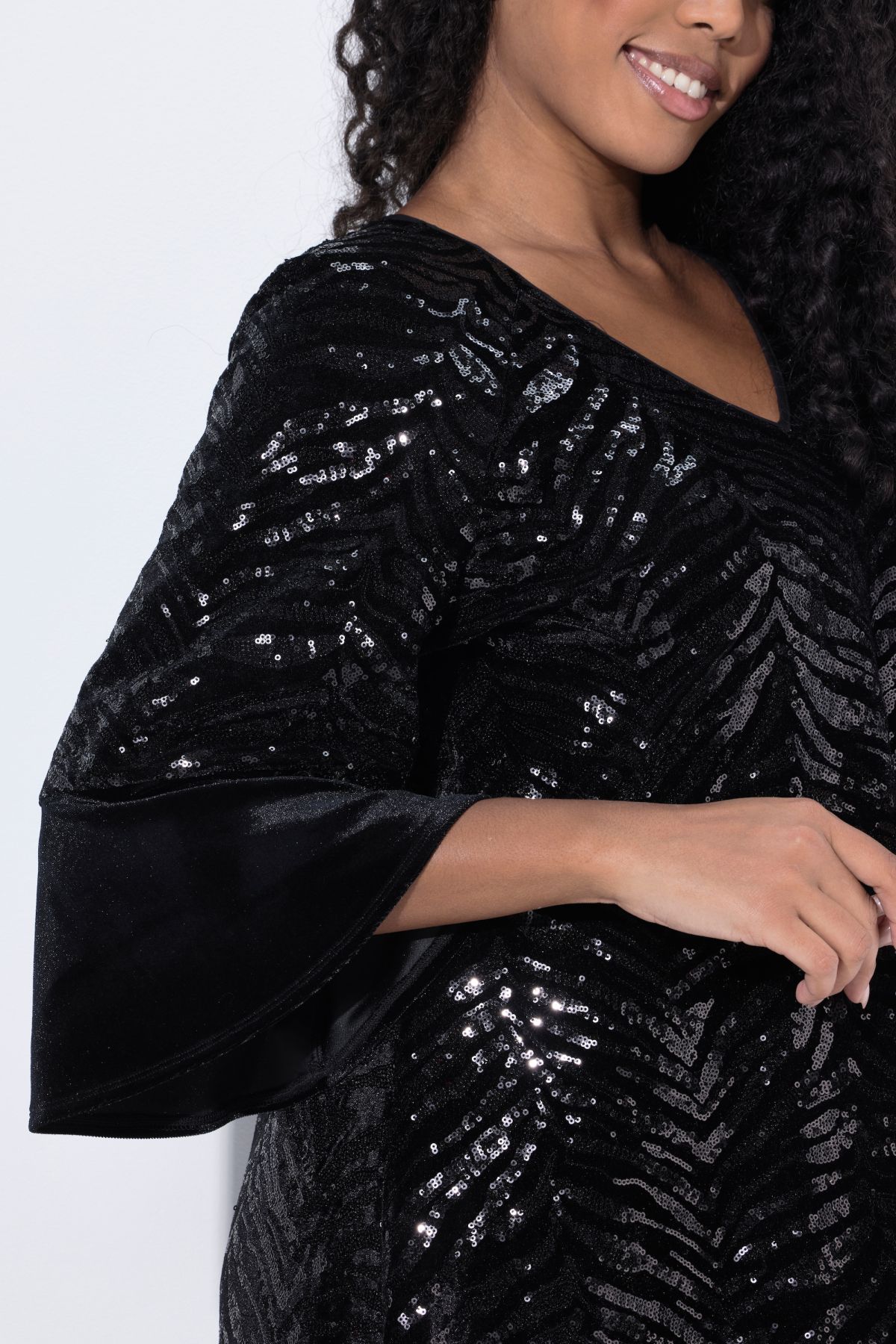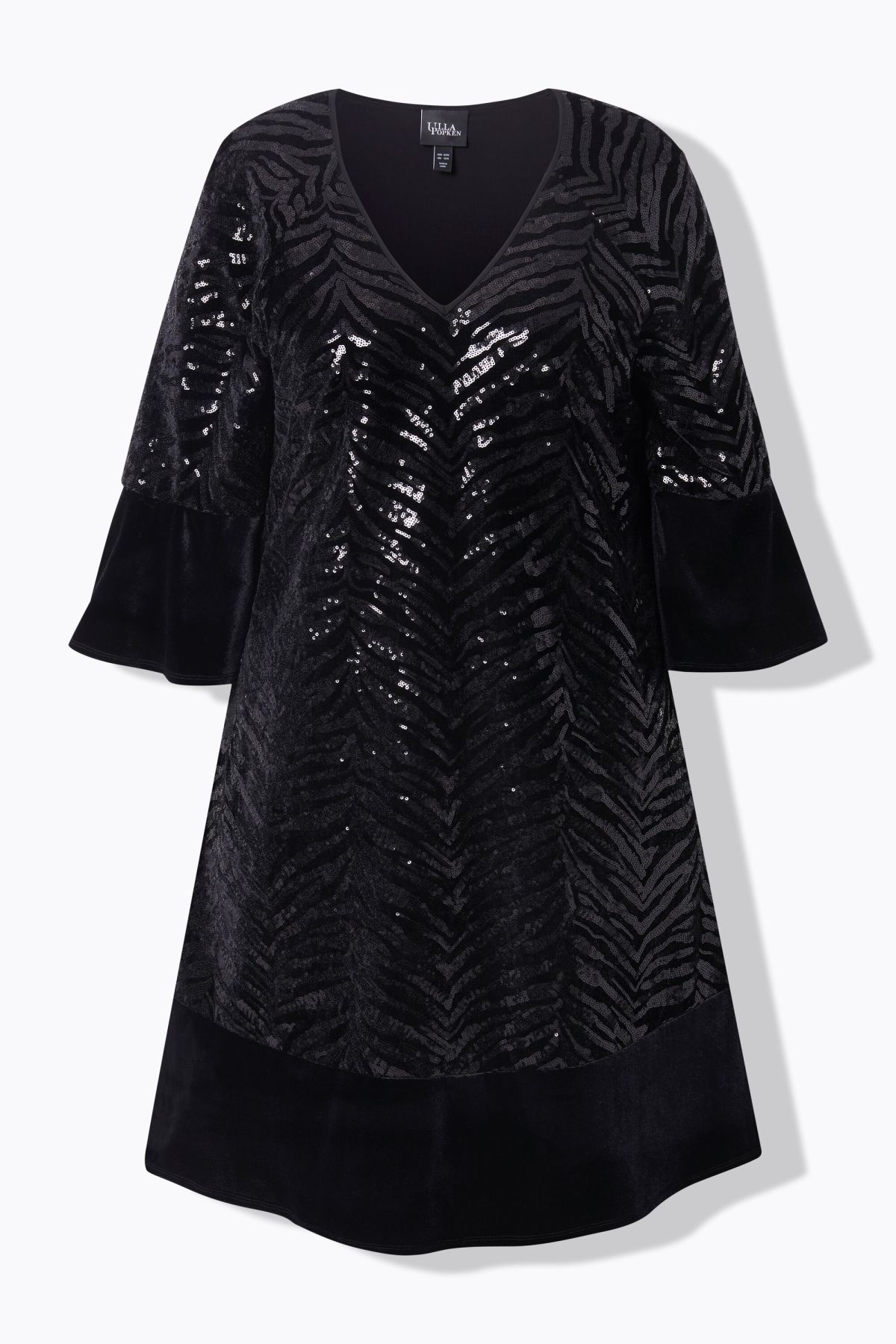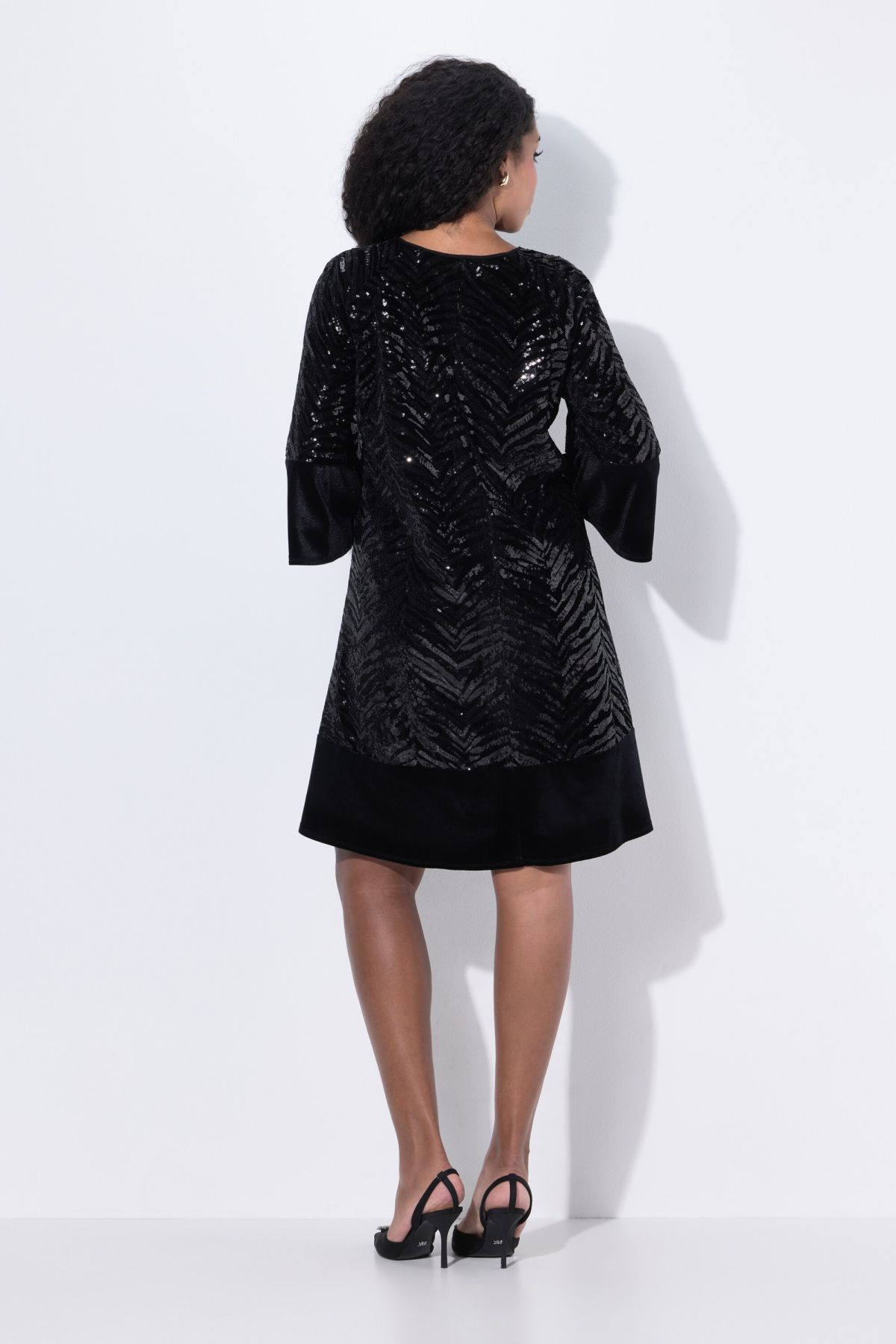Рокля с тигрови райета от пайети в тонални цветове. С кръгло деколте, контрастни акценти на 3/4 ръкави с широки маншети и подгъва.