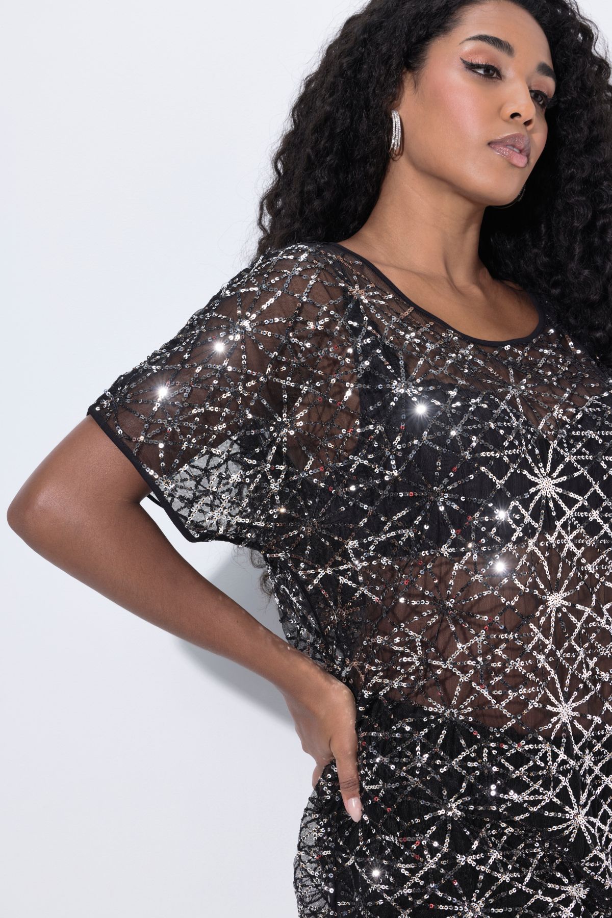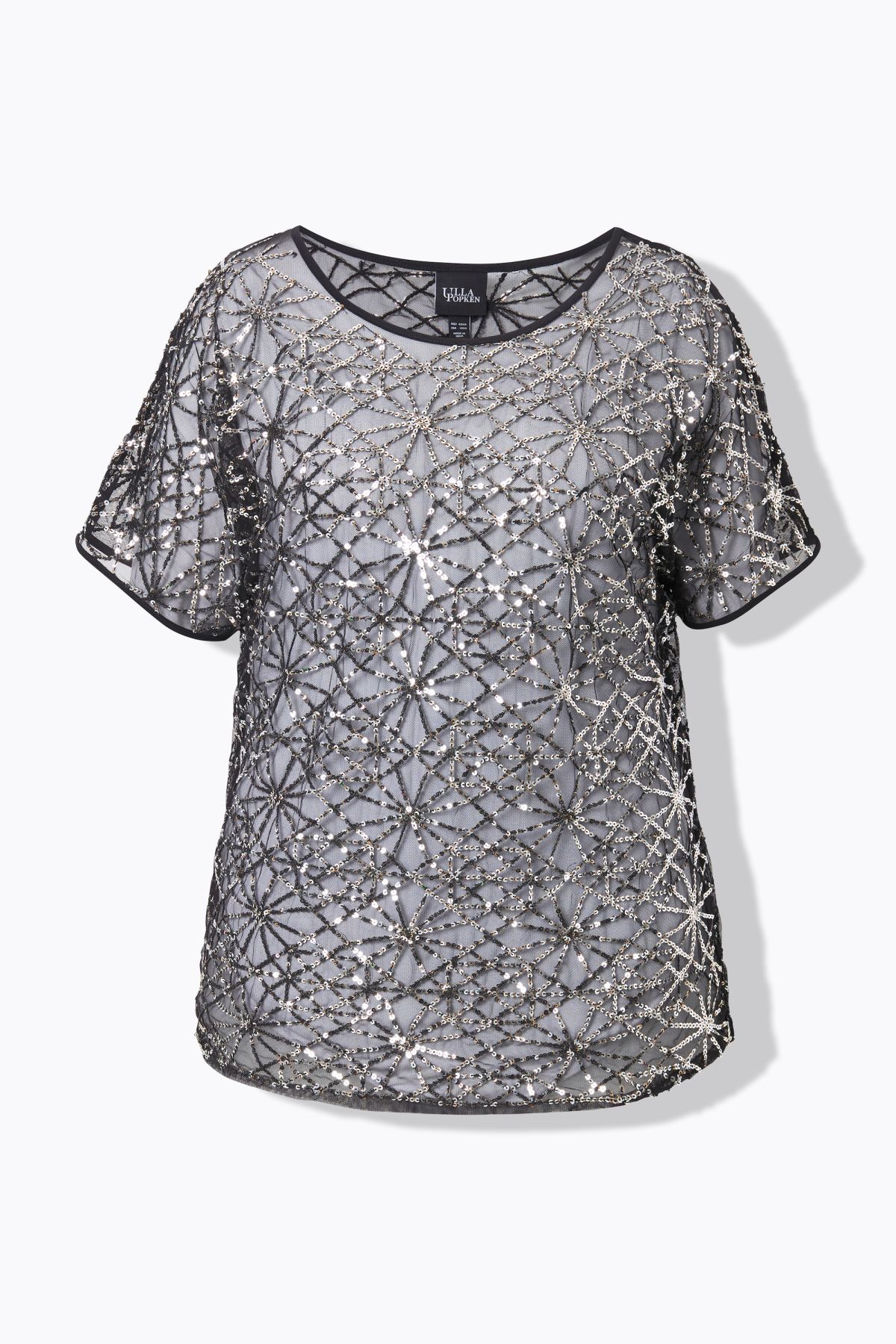 Блуза с геометричен принт с пайети от прозрачна бляскава материя. Фаворит на сезона. С кръгло деколте и къси ръкави. Стил и комфорт
