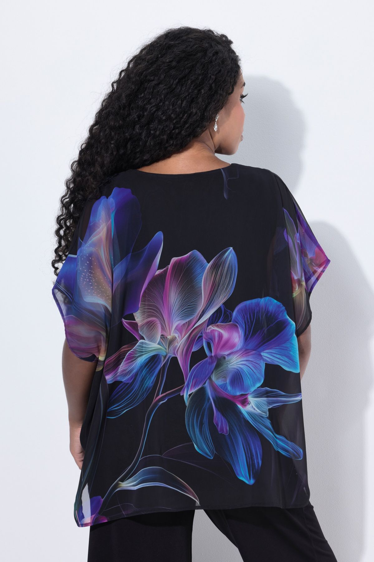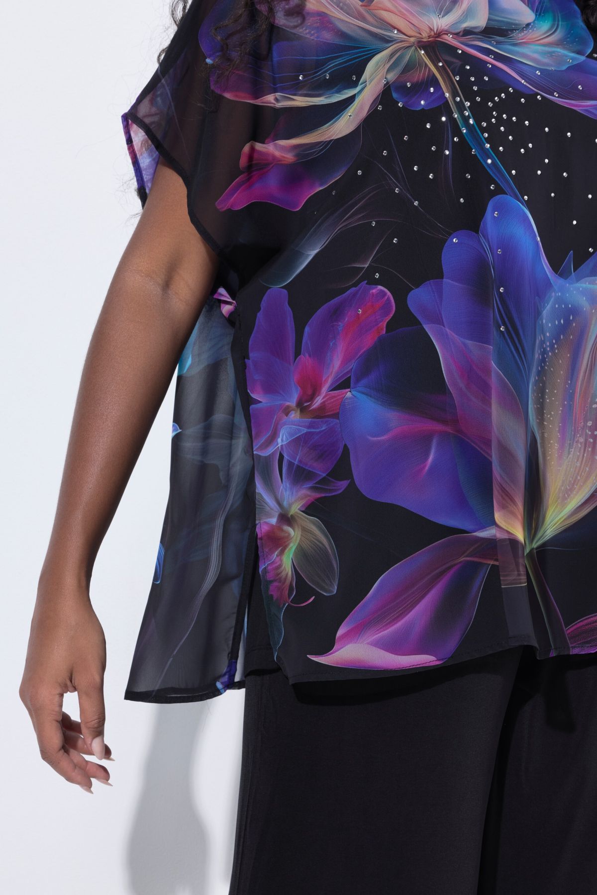 Блуза с шифон и принт на цветя. С точки и бляскави камъчета. С кръгло деколте и 3/4 ръкави. С непрозрачна, трикотажна подплата.