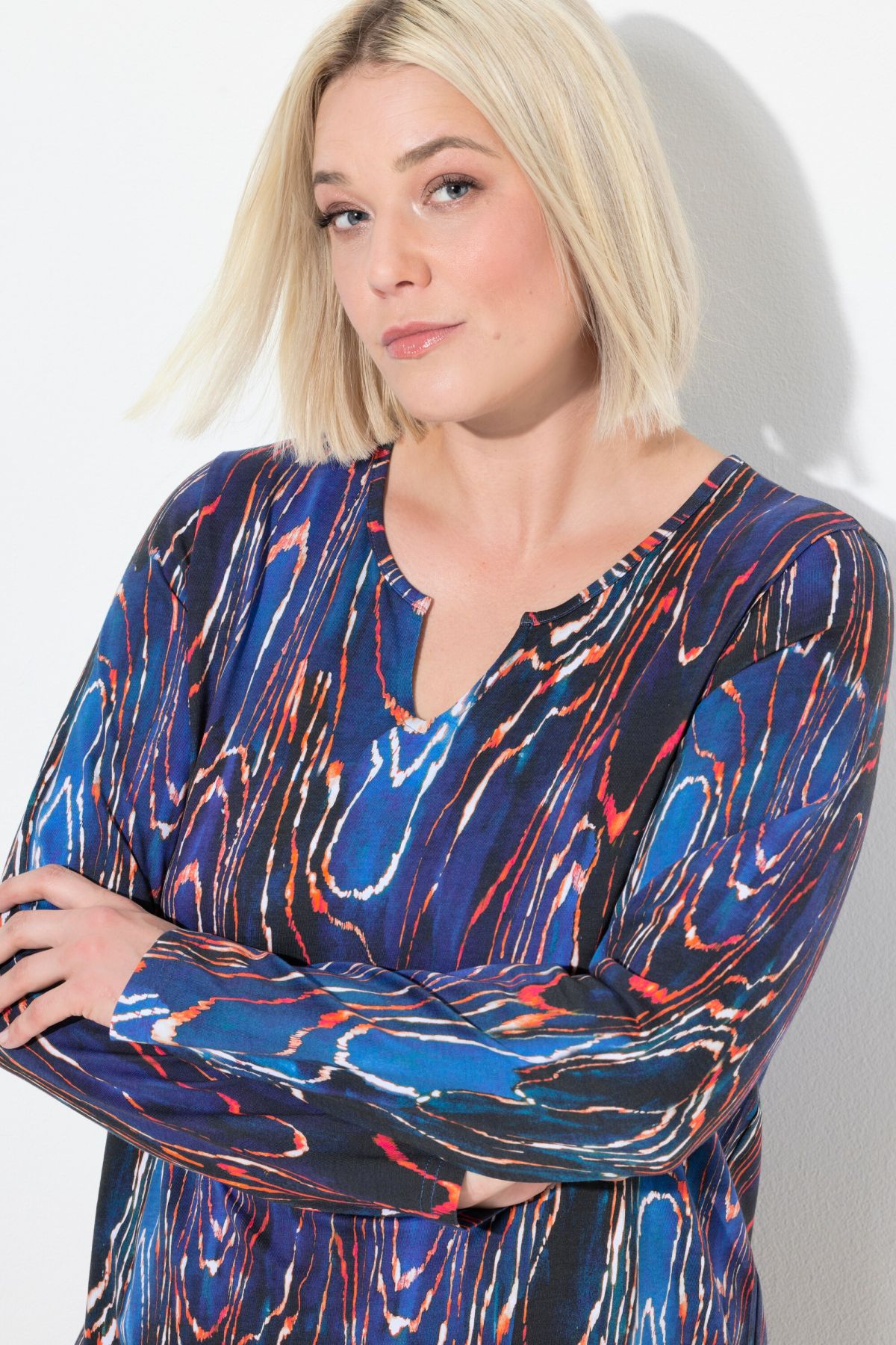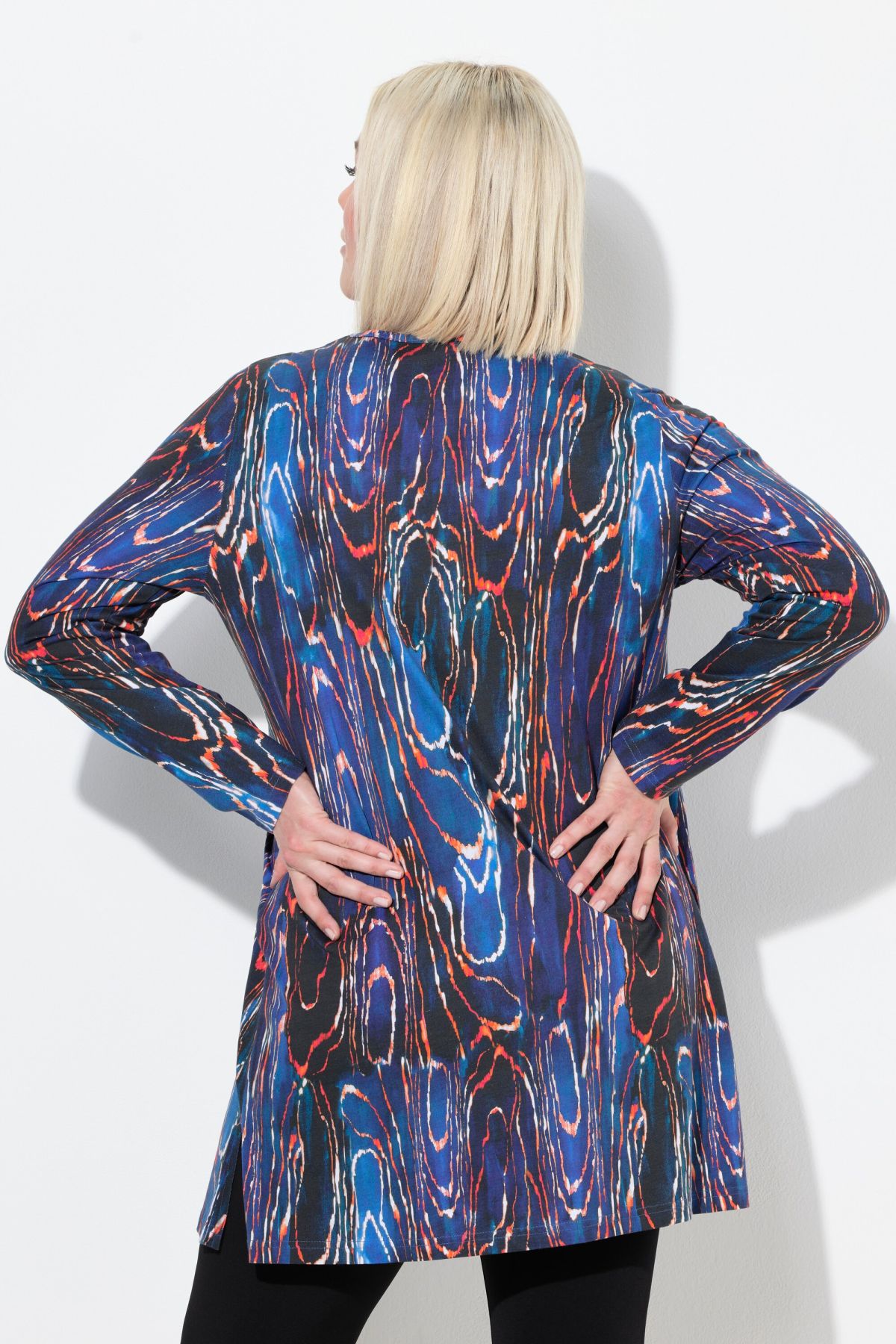 Туника с електриков, завъртян принт. С кръгло деколте с цепка. С А - линия на силуета и дълги ръкави. Любима кройка на всеки.