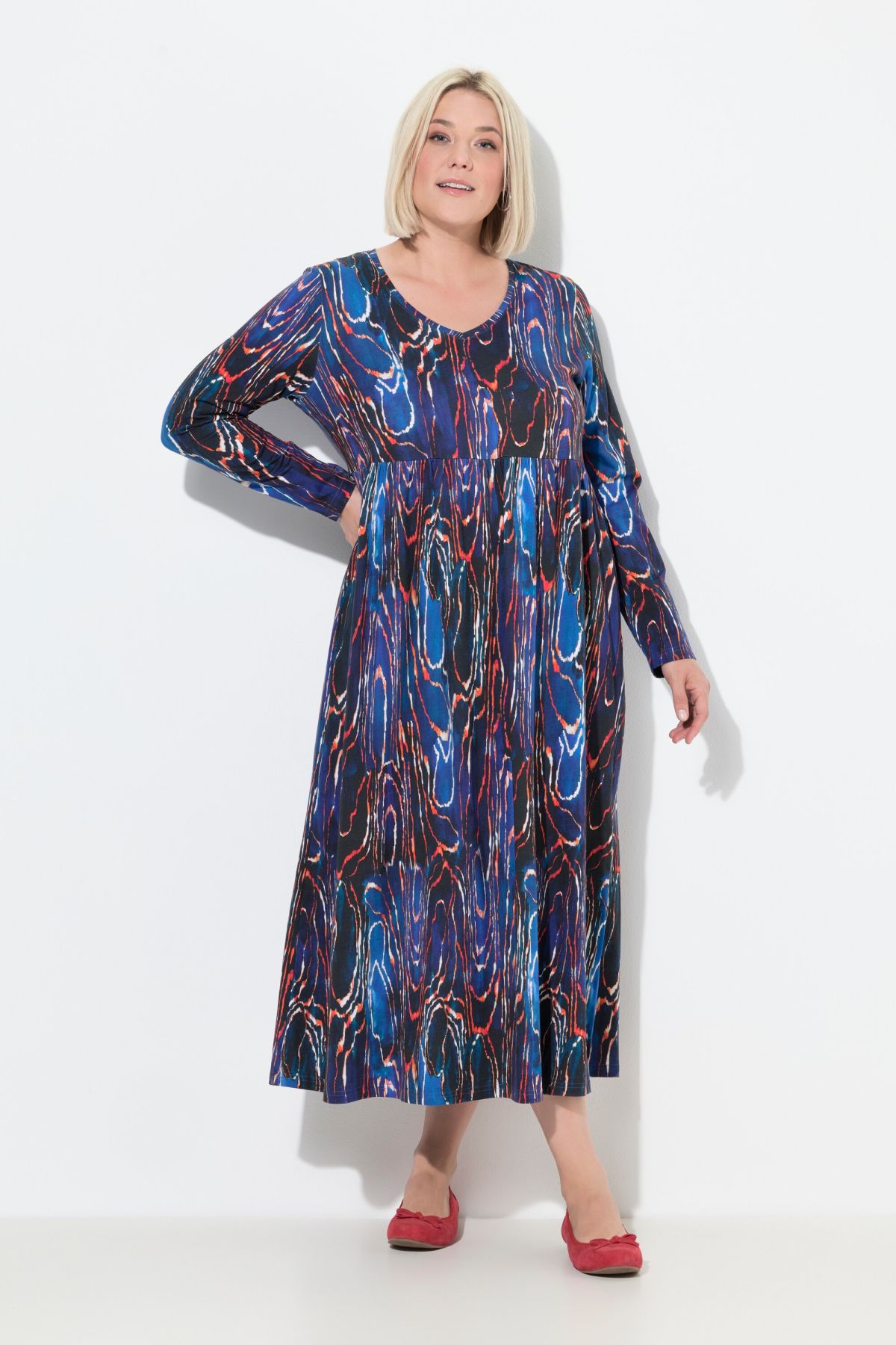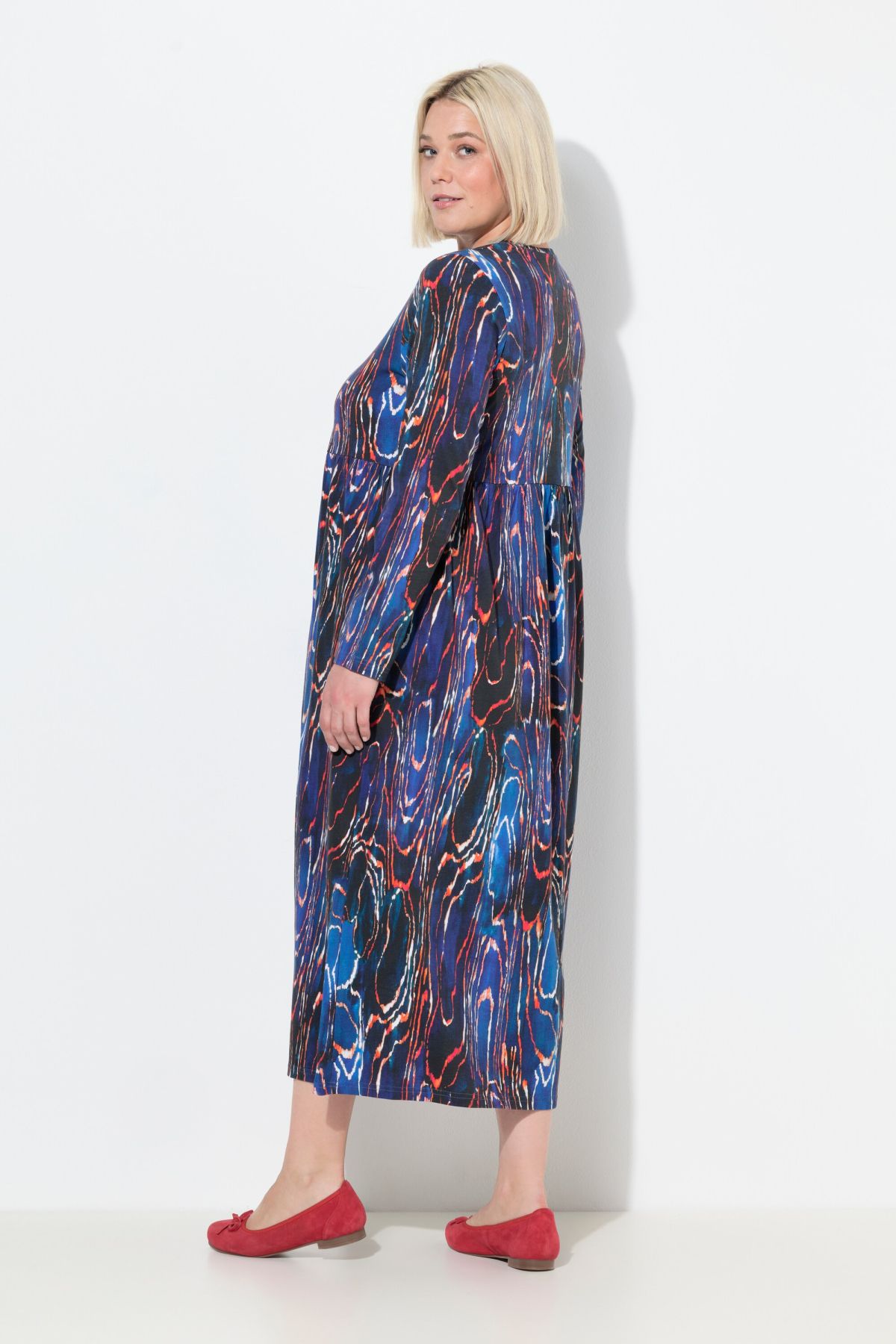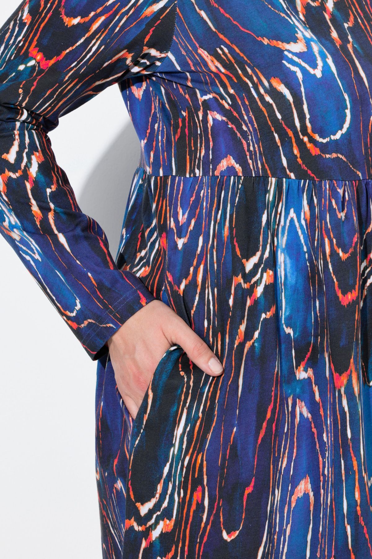 Рокля с електриков завъртян принт. С А - линия на силуета, комфортни странични джобове, шевов акцент на талията и дълги ръкави. От мека памучна материя.