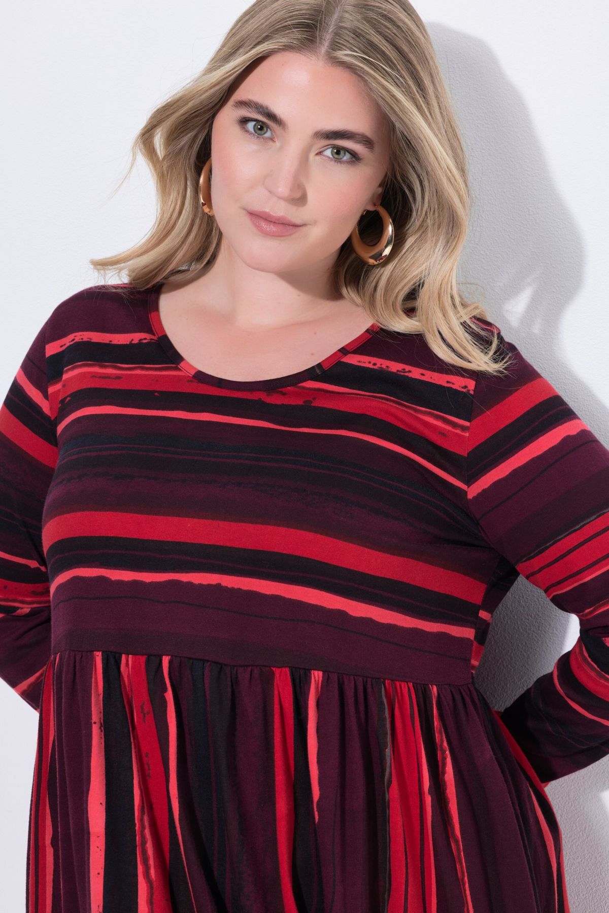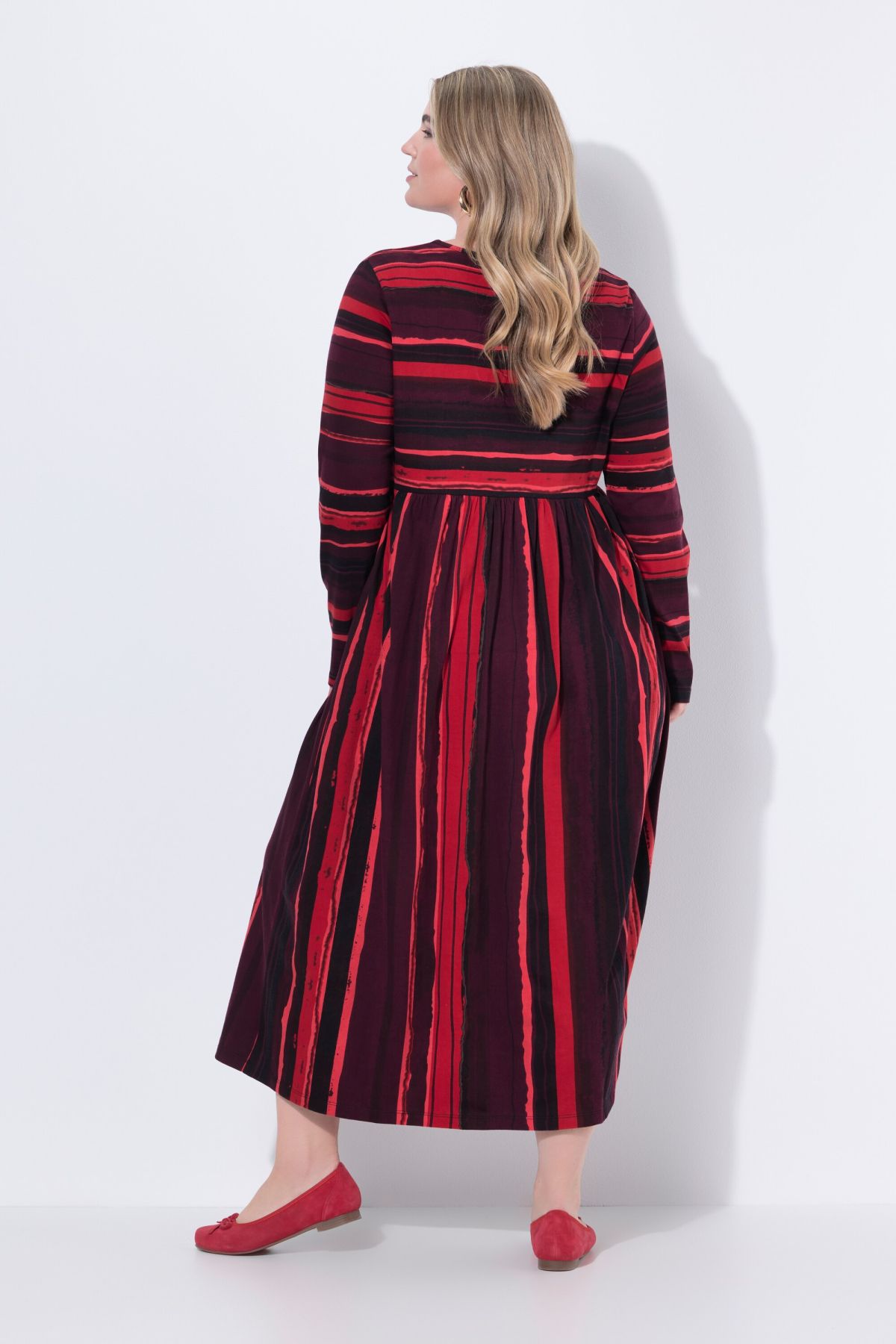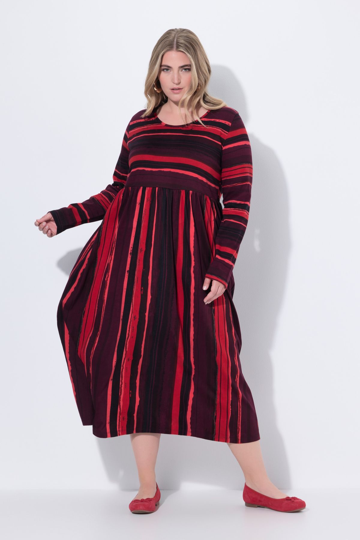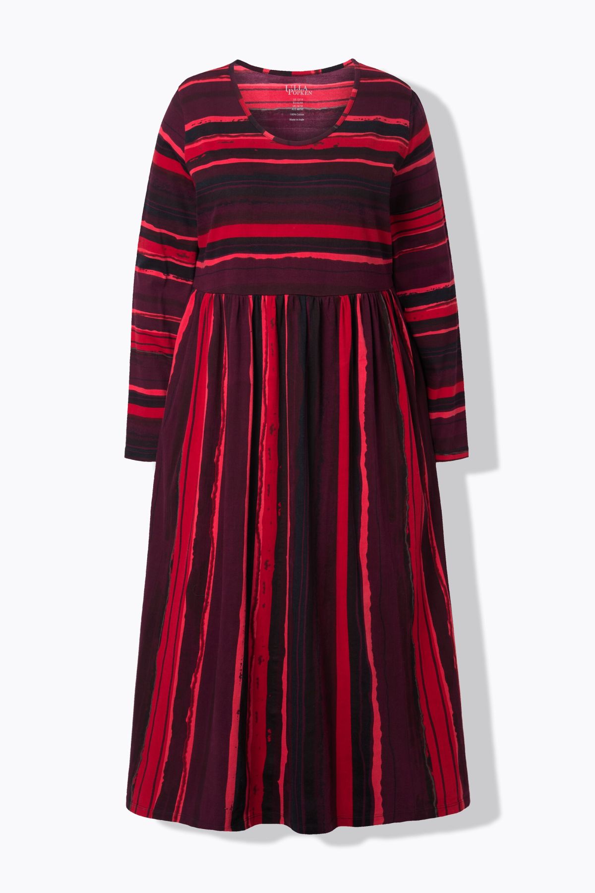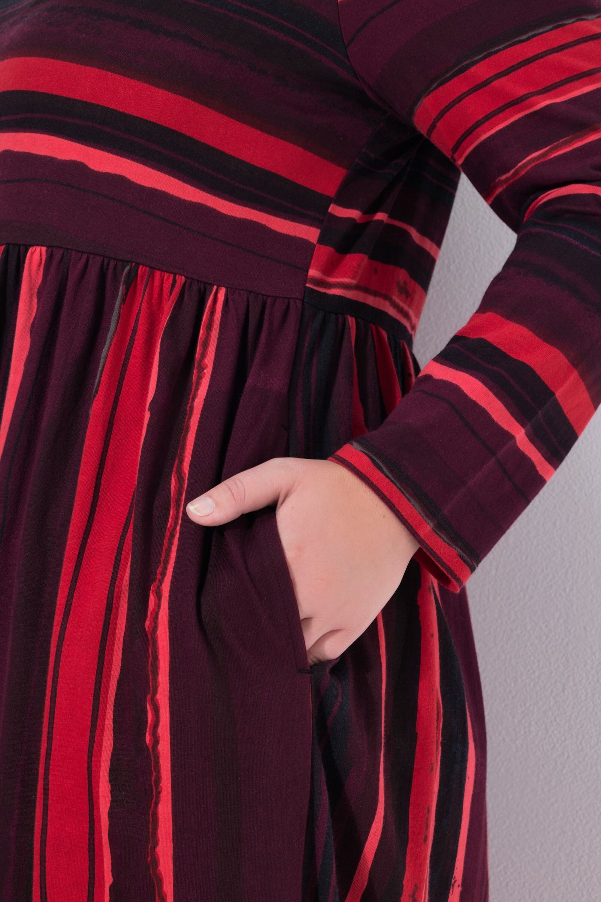 Рокля с несиметрични райета с акцент на талията. С кръгло деколте, дълги ръкави и странични джобове. С А - линия на силуета и мека, памучна материя.