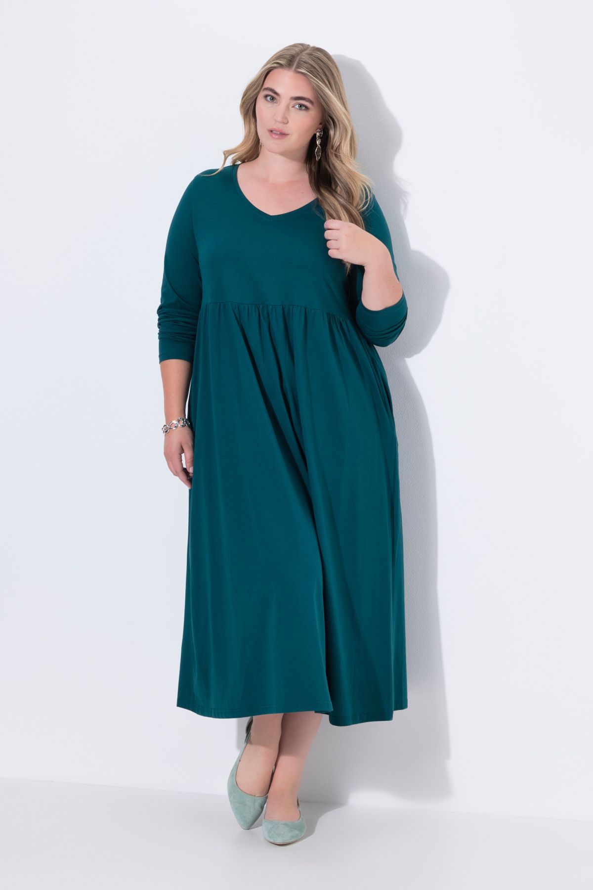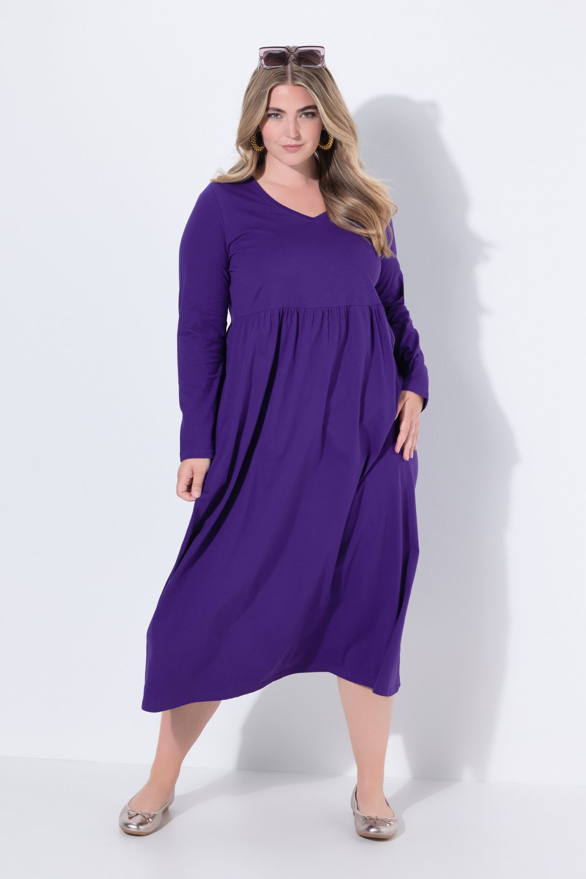 Рокля от мека, памучна материя с кръгло деколте. С шевов акцент на талията и набрани детайли. С дълги ръкави и странични джобове.