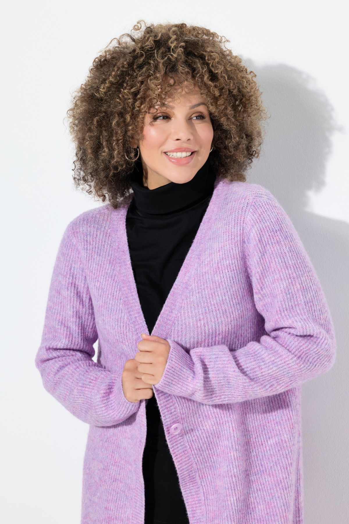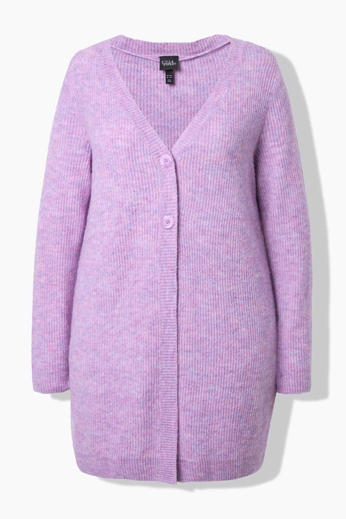 Дълга жилетка от вълнена материя - топла, лека и пухкава. Отворена отпред и с дълги ръкави.