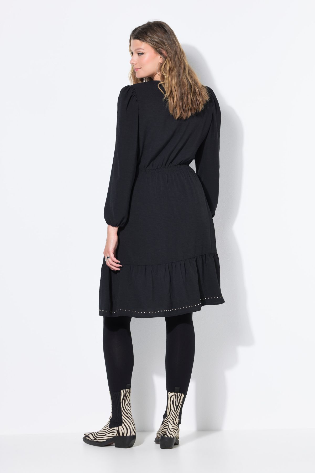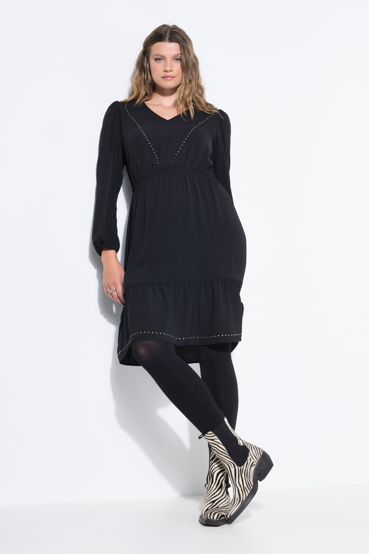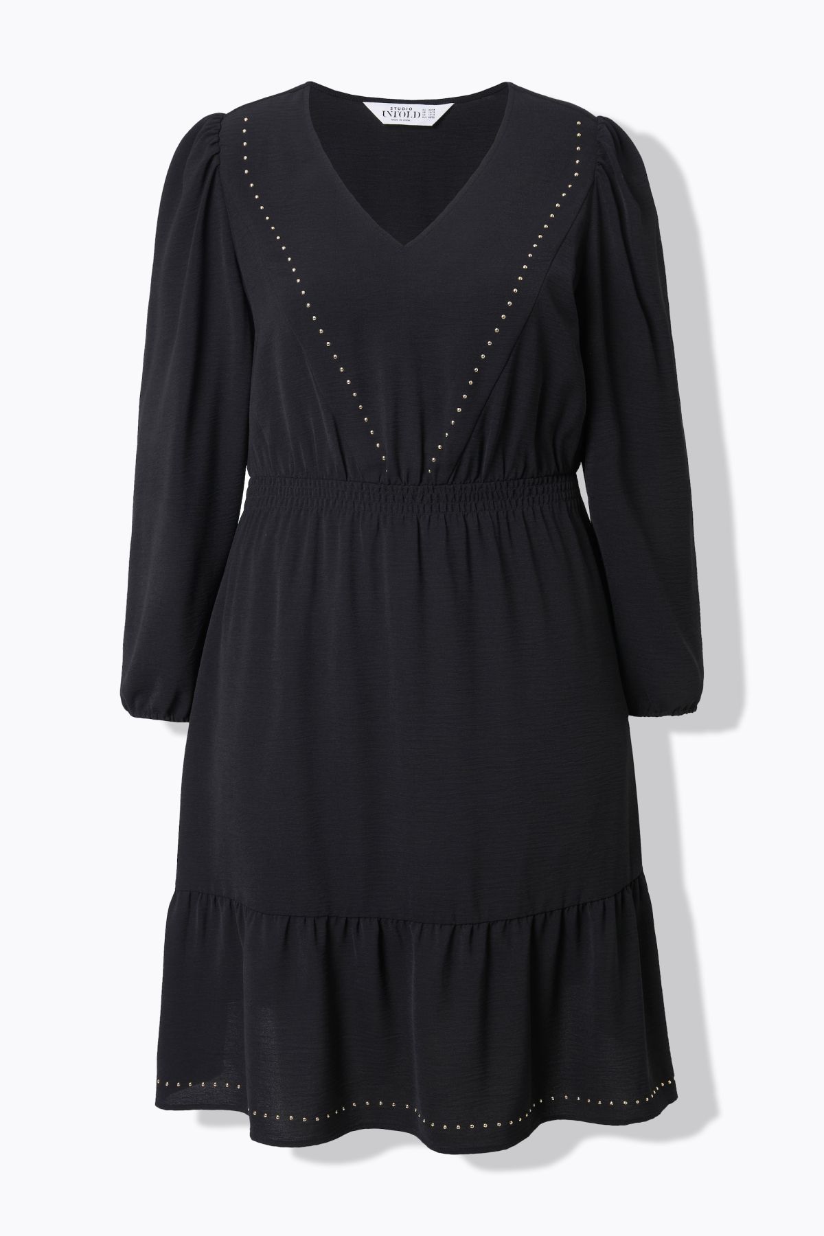 Рокля с акцент от метални капси на деколтето и полата. С V - образно деколте, еластичен, шевов акцент на талията и разкроена пола. С перфектна дължина до коляното.