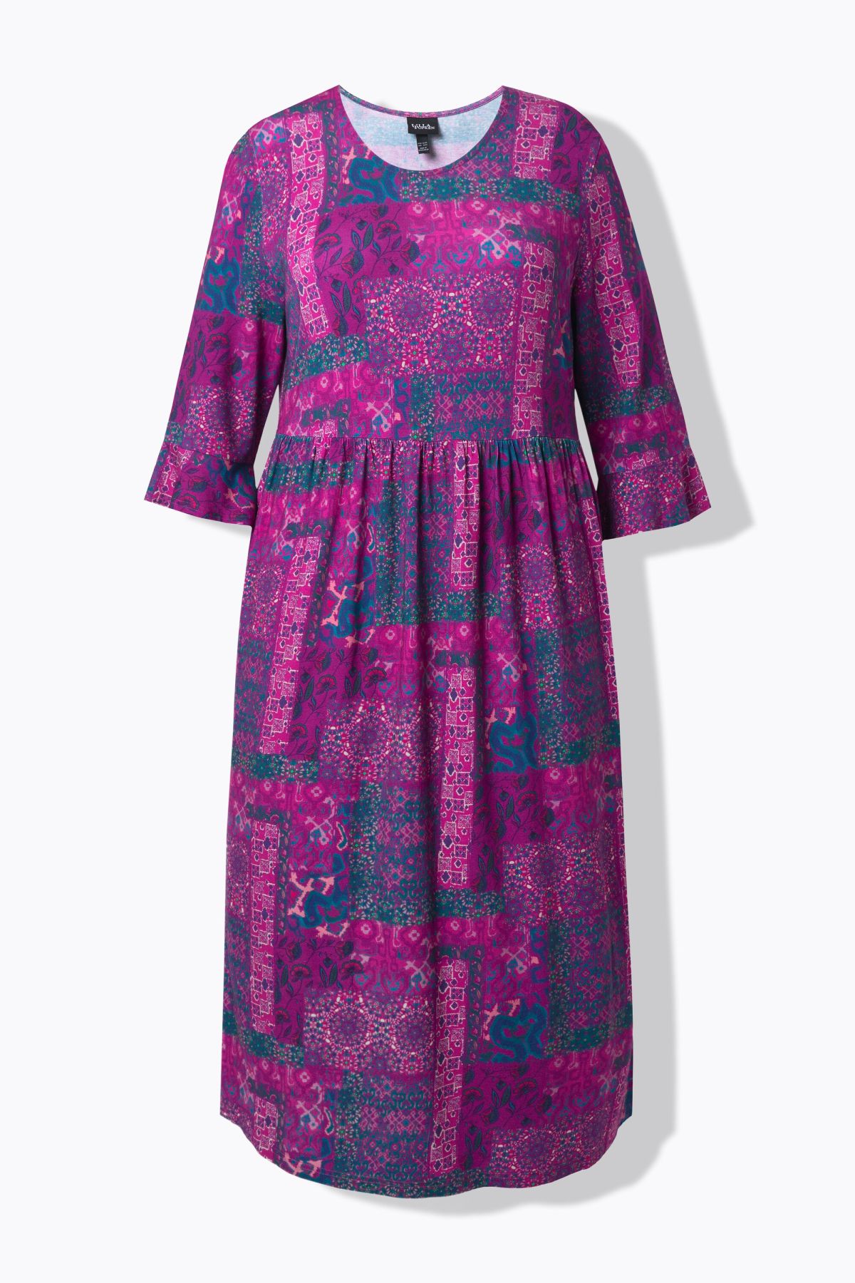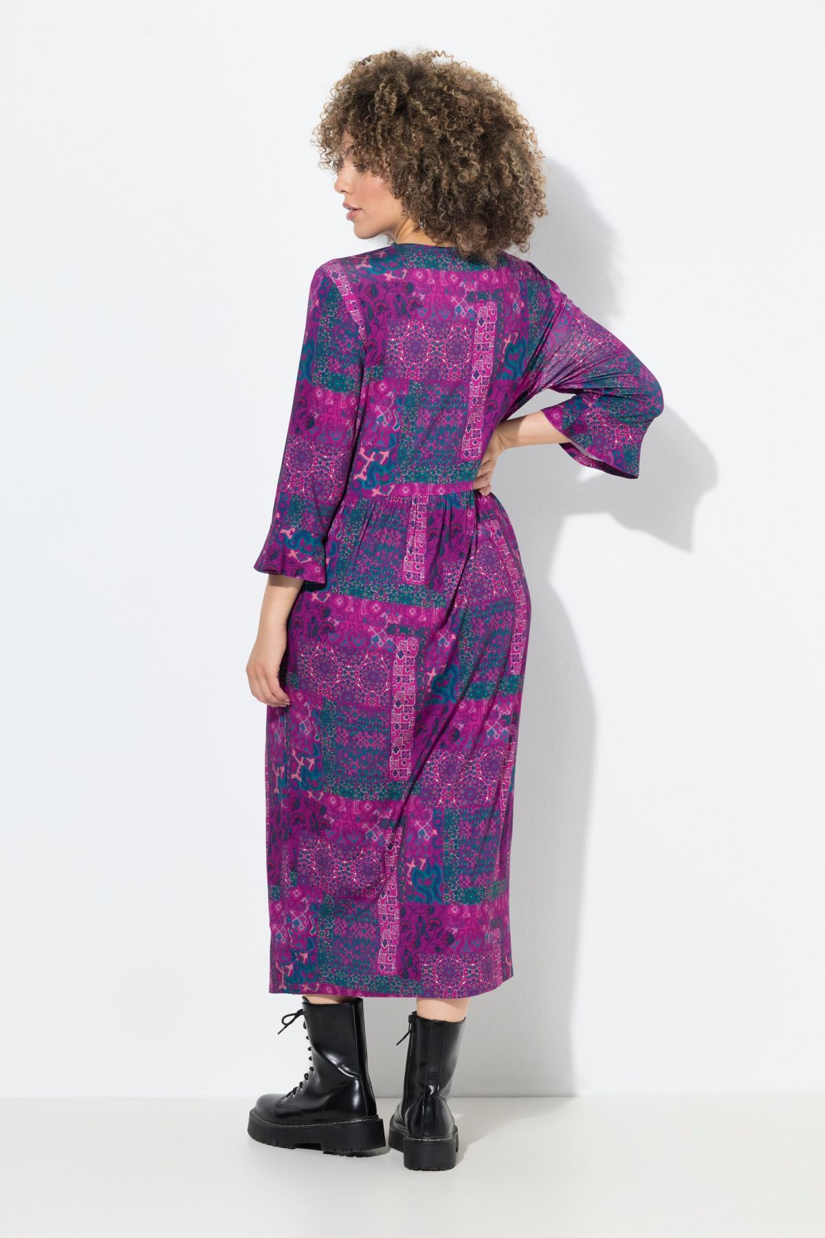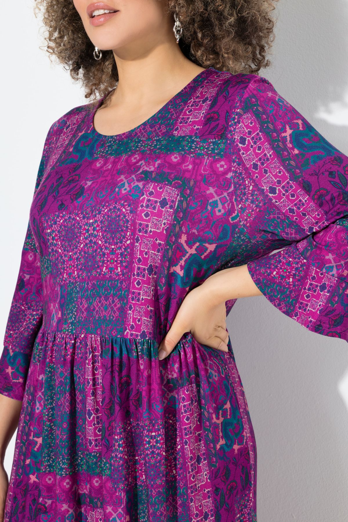 Рокля с модерен пач принт бохо акценти. Еластична и комфортна за ежедневието. С кръгло деколте и 3/4 ръкави с широки акценти.