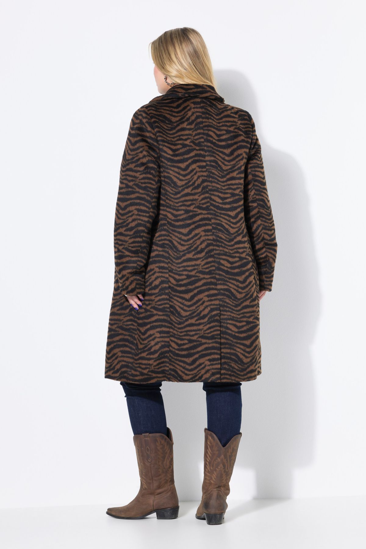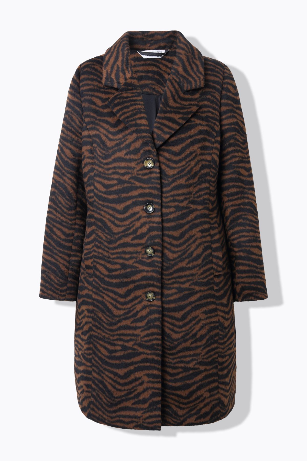 Палто със зебров принт. С копчета отпред, ревери на яката и странични джобове. С дълги ръкави и подплата.