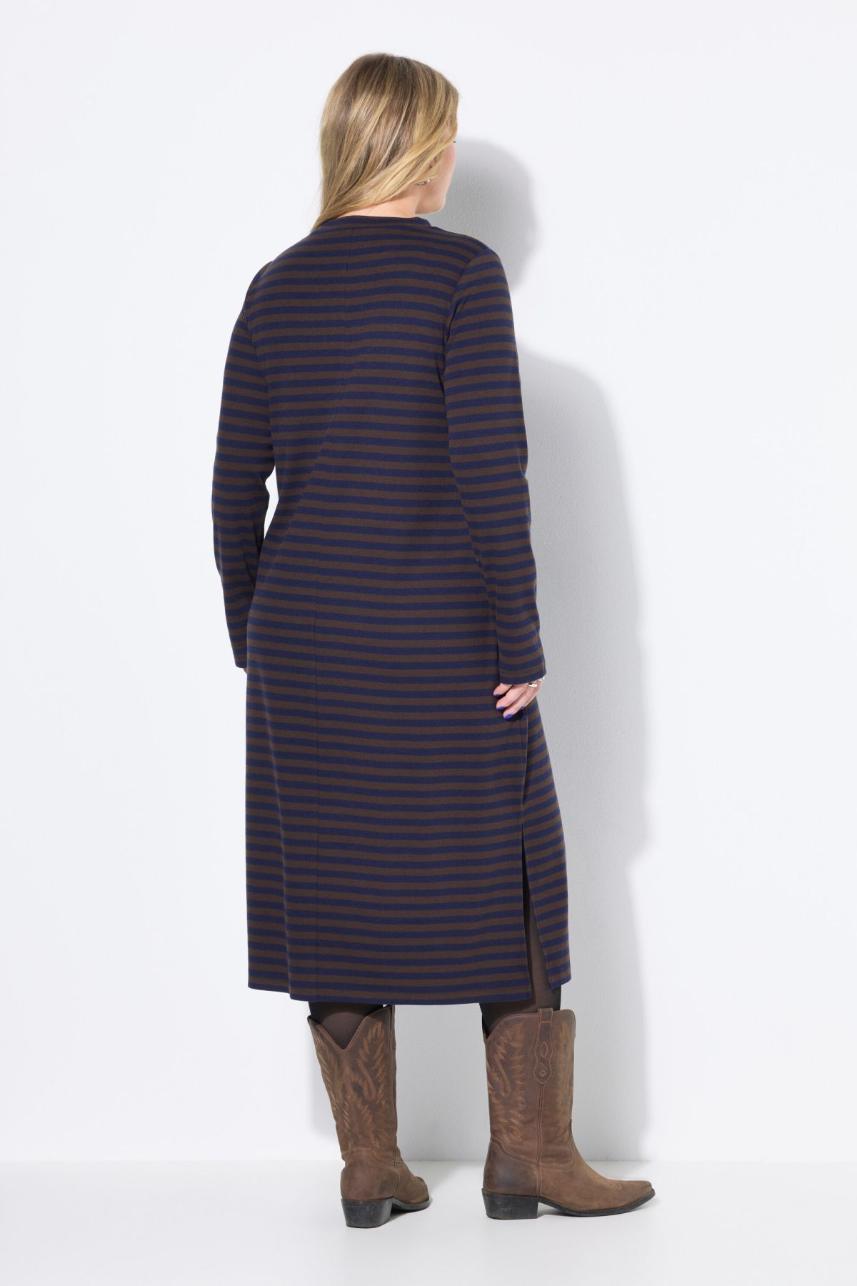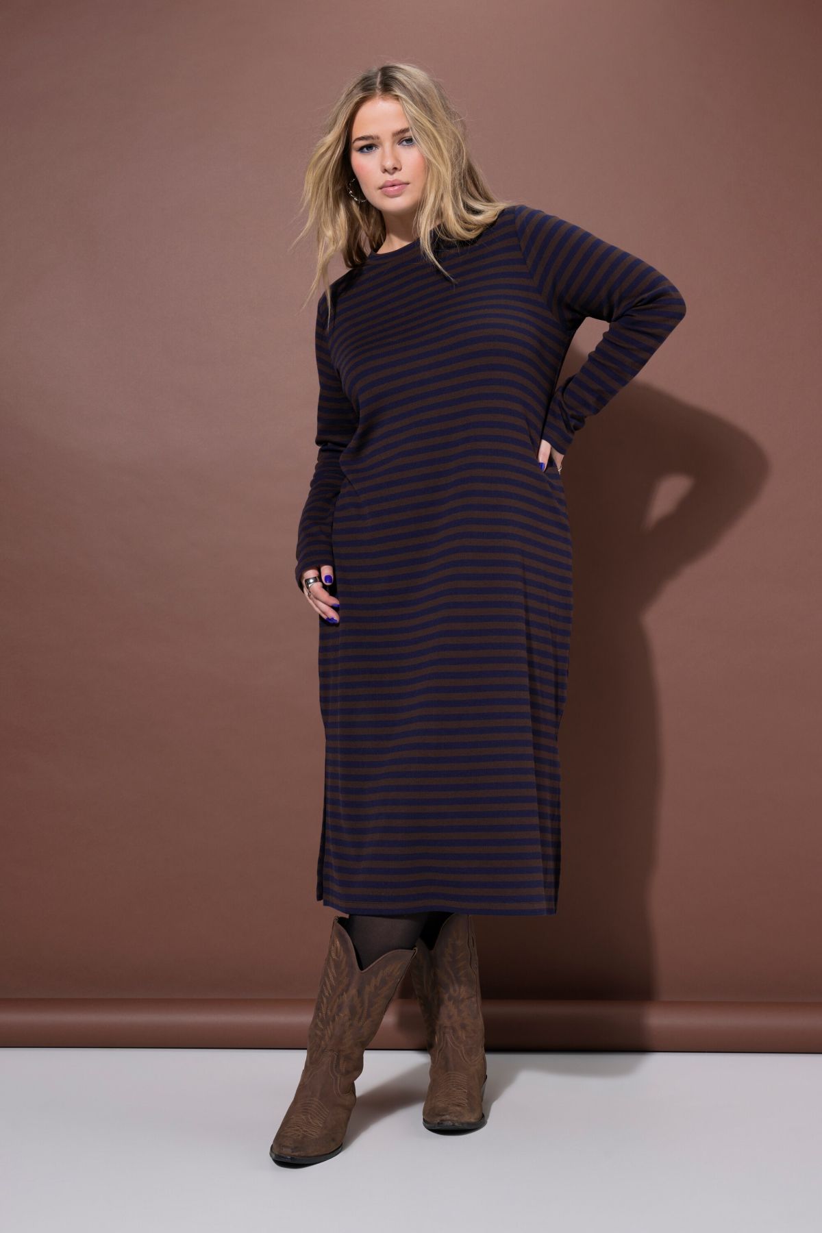 Рокля с раиран принт от рипсено трико. Комфортна еластична материя, перфектна за ежедневието. С кръгло деколте и дълги ръкави. С цепки на подгъва.