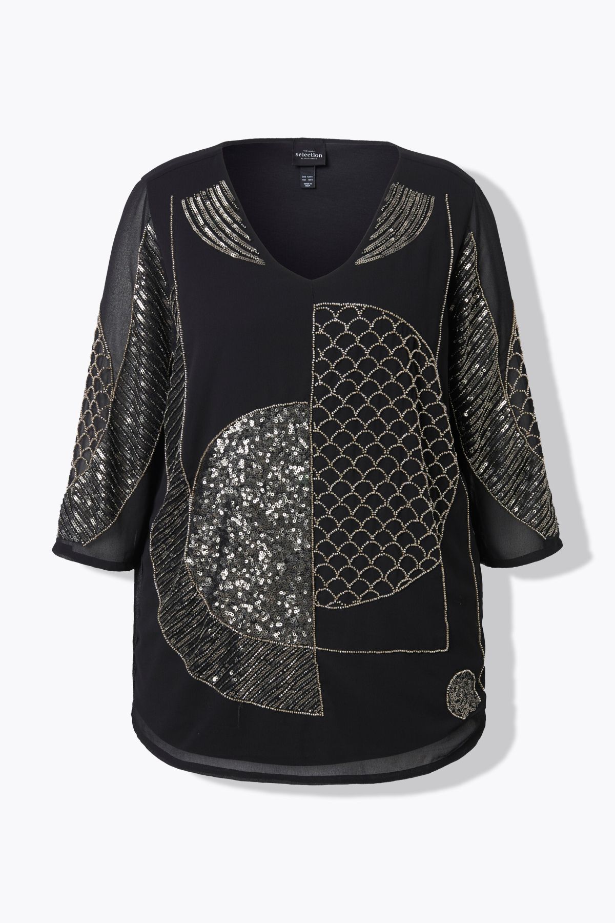 Блуза с шифон и пайетени перли. С V - образно деколте и 3/4 ръкави. От мека и удобна материя за ежедневието.