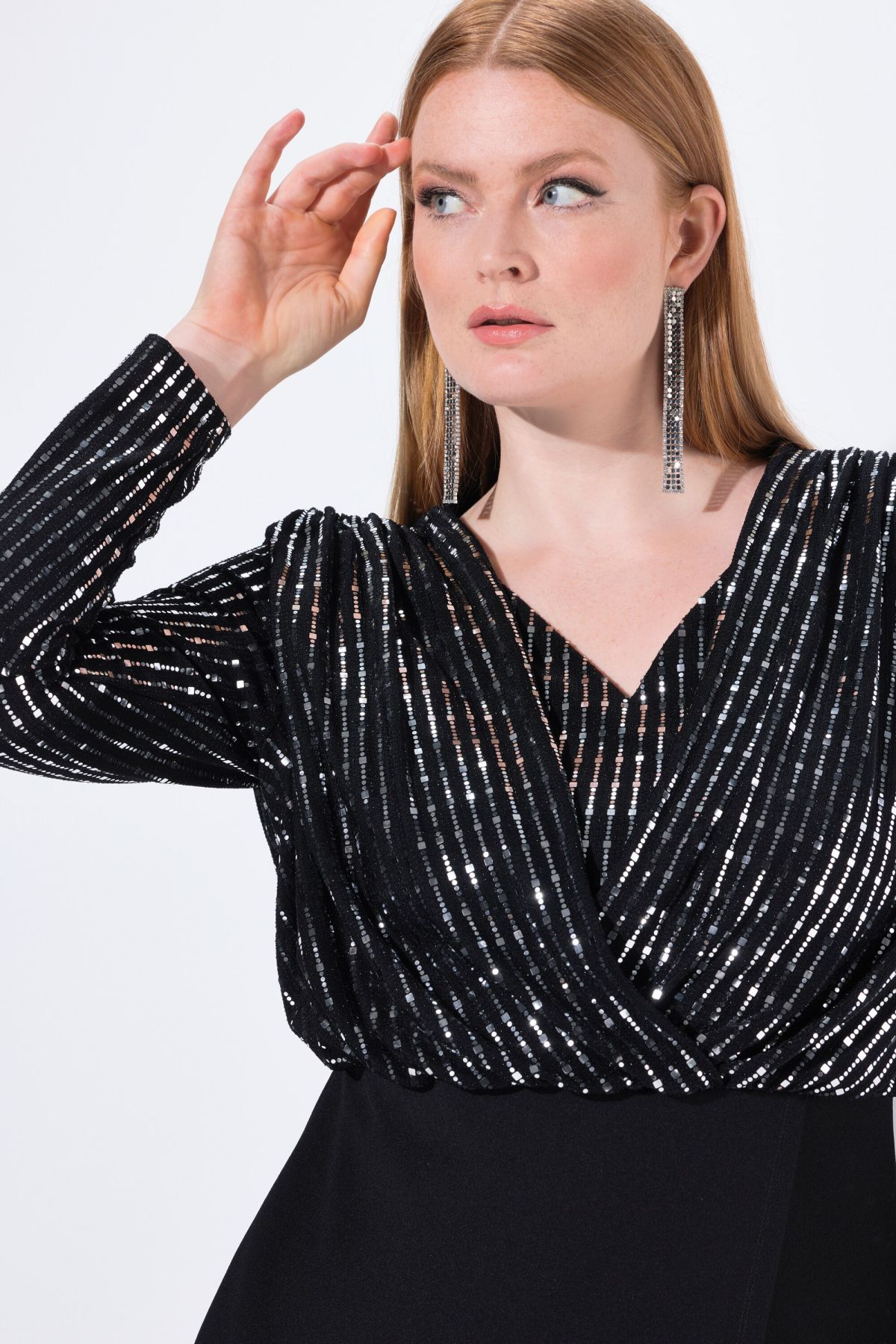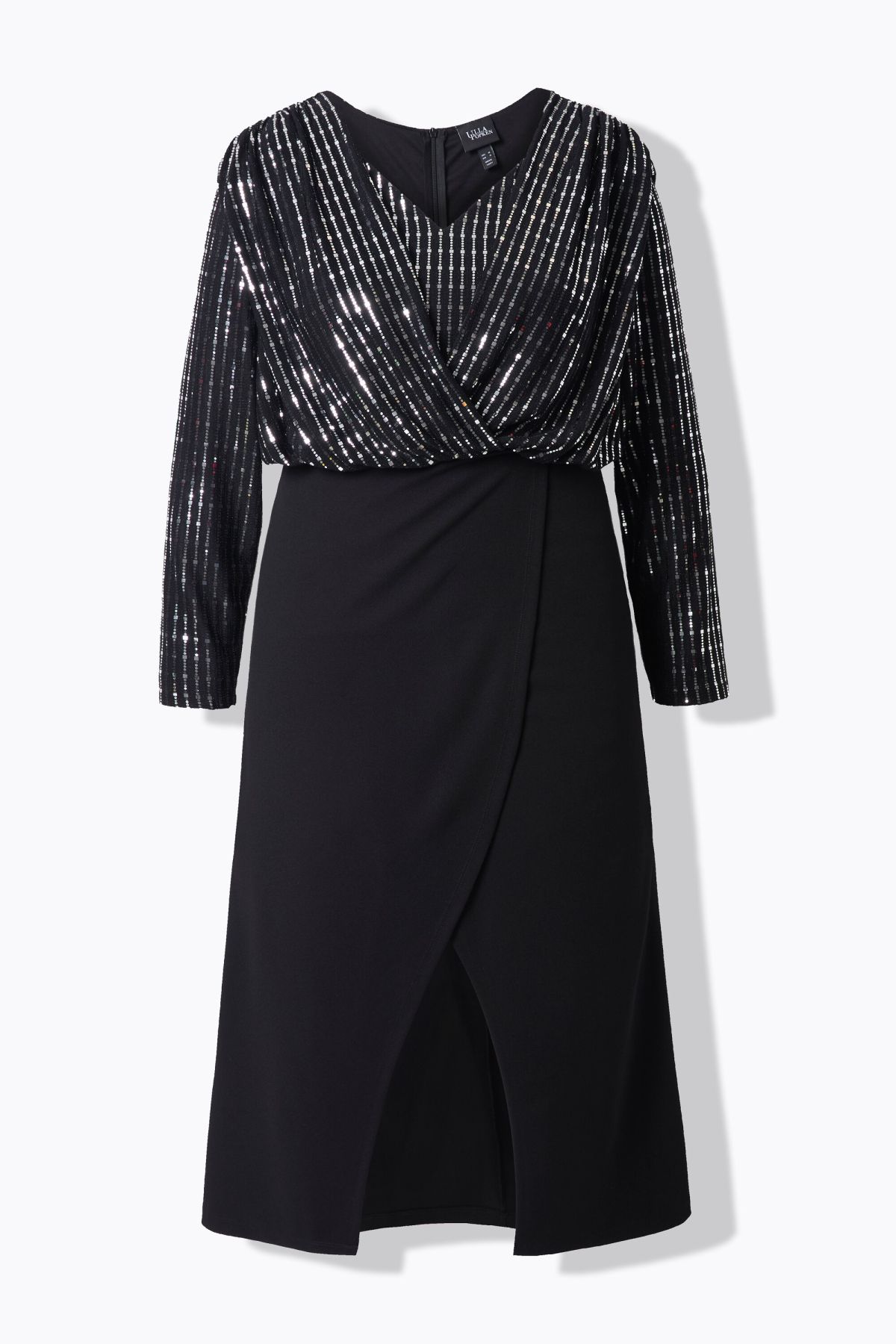 Рокля с принт на бляскави райета в горната част и на дългите ръкави. С V - образно деколте, шевов акцент на талията и акцент тип прегърни ме на полата отпред.