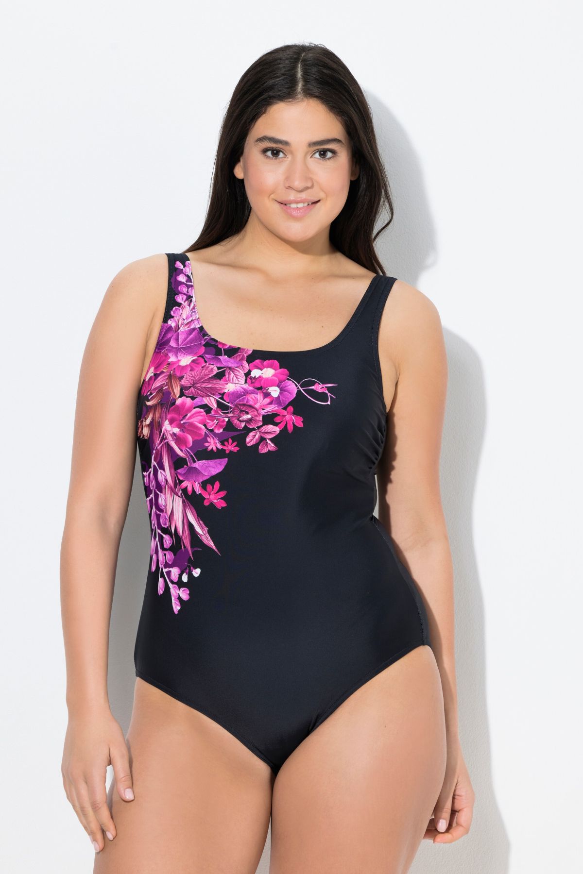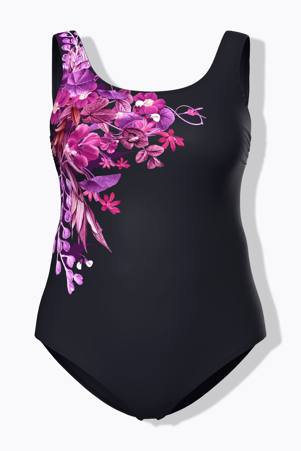 Бански с флорален принт отпред. С широки, комфортни презрамки, оформени чашки, еластична лента под бюста и подплата отпред
