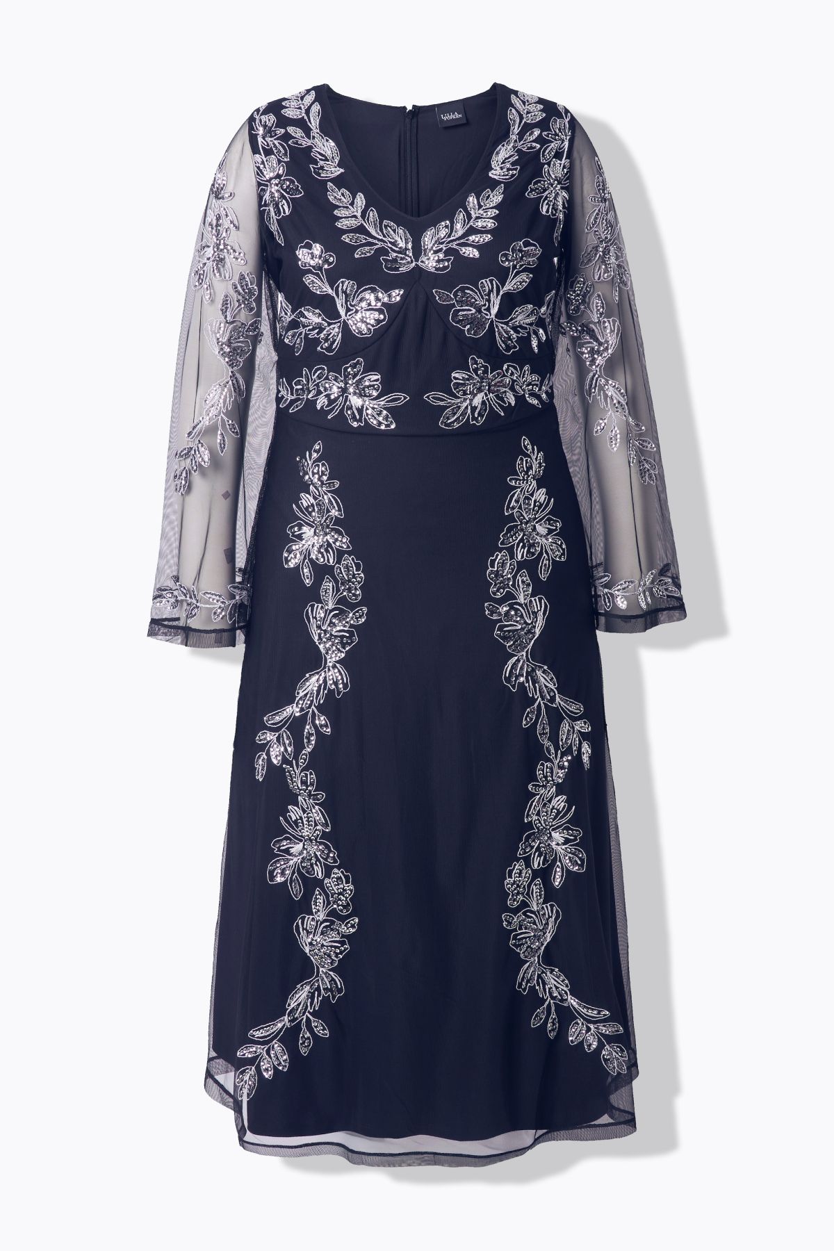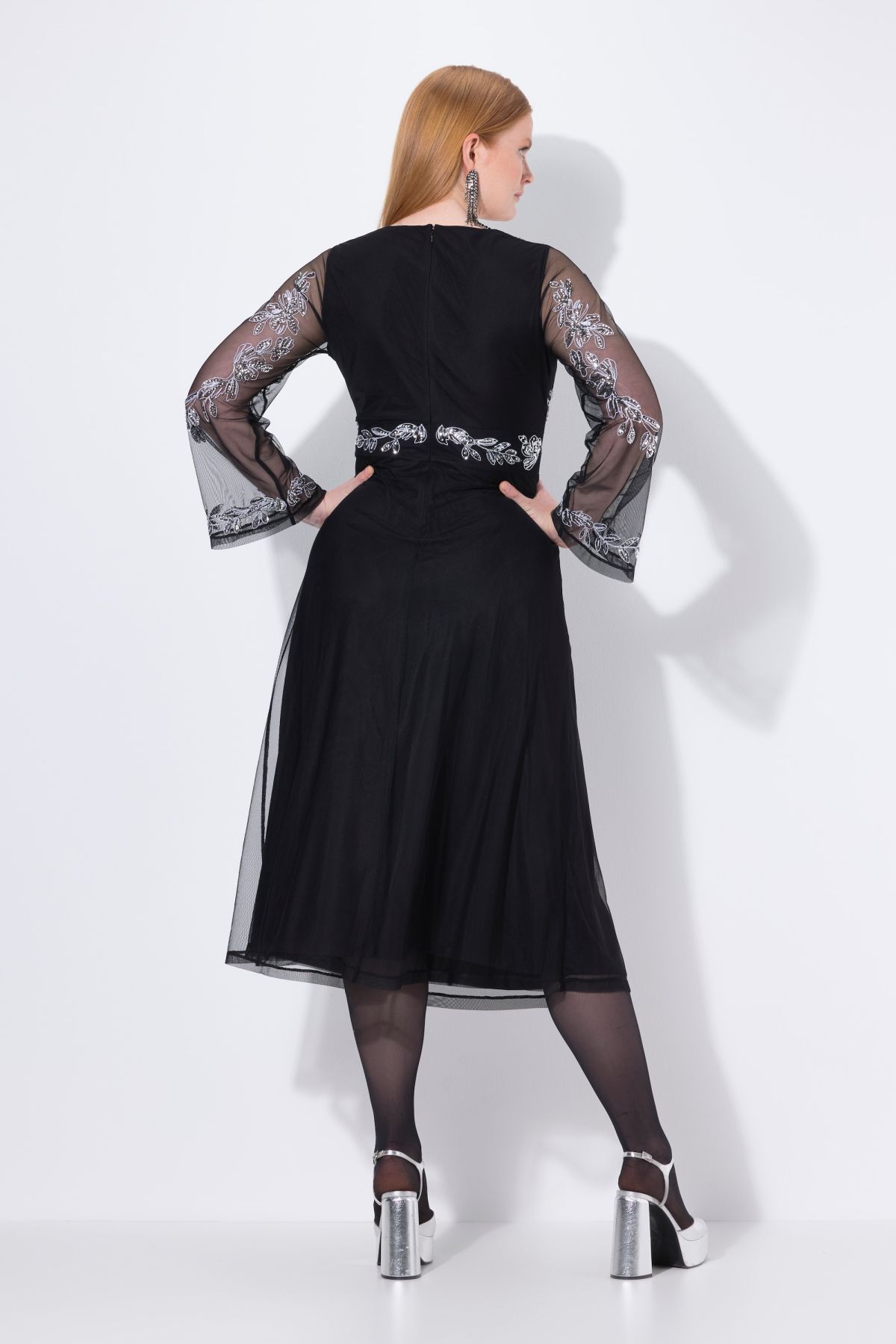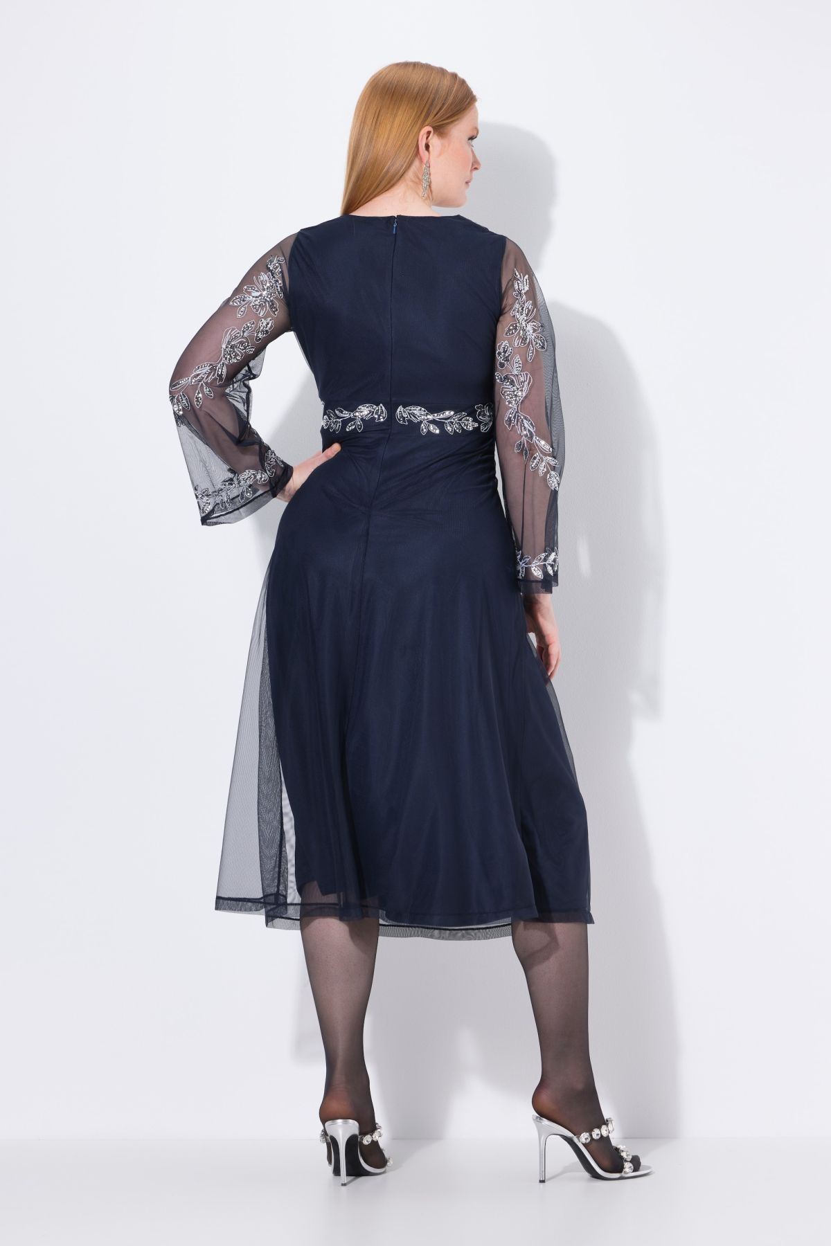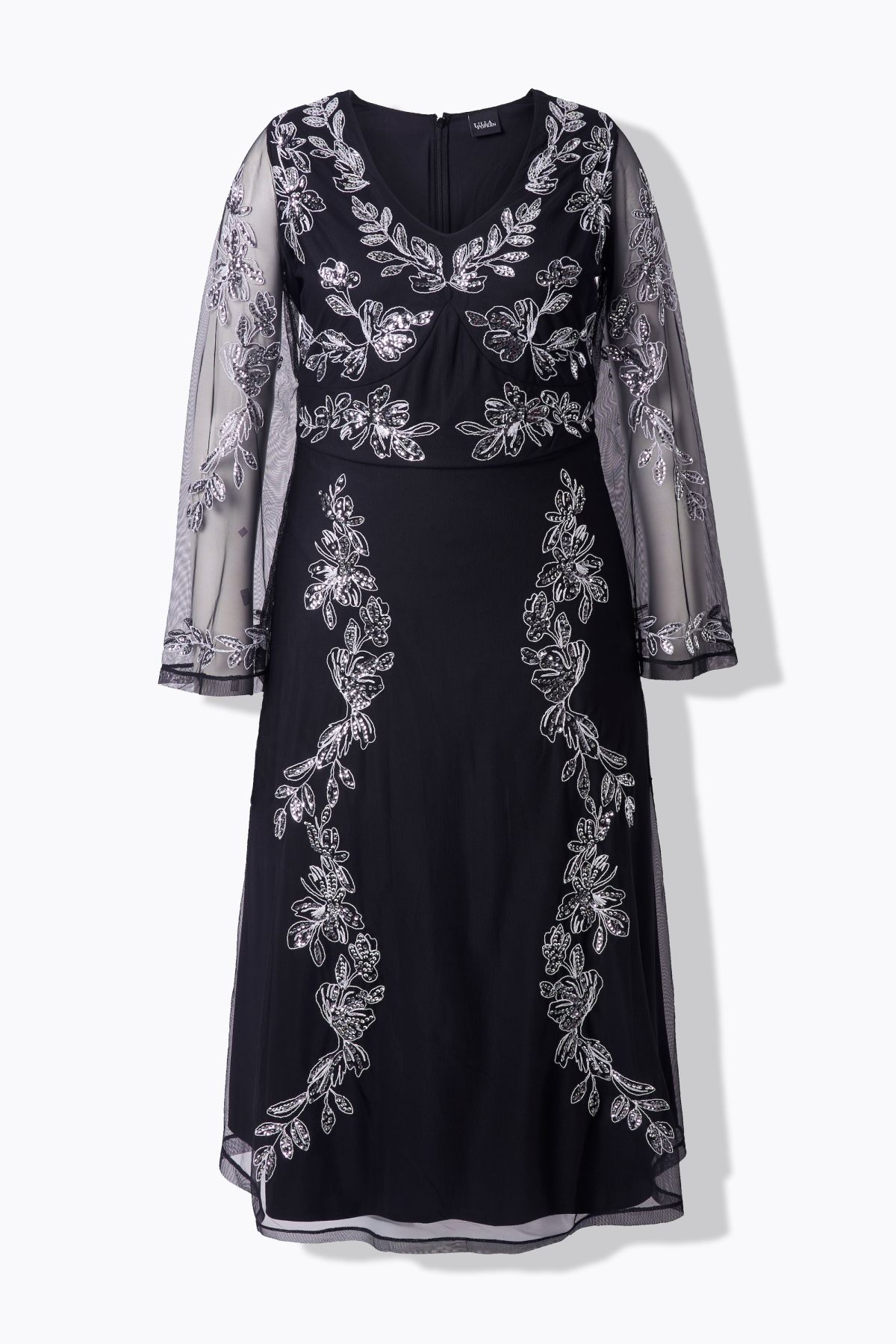 Рокля с модерни пайетени акценти и бродерии. С прозрачна мрежа и бляскави детайли на листа. С дълбоко кръгло деколте, прозрачни дълги ръкави с акцент и непрозрачна подплата