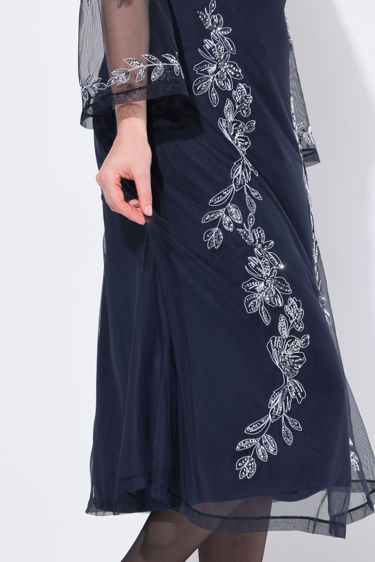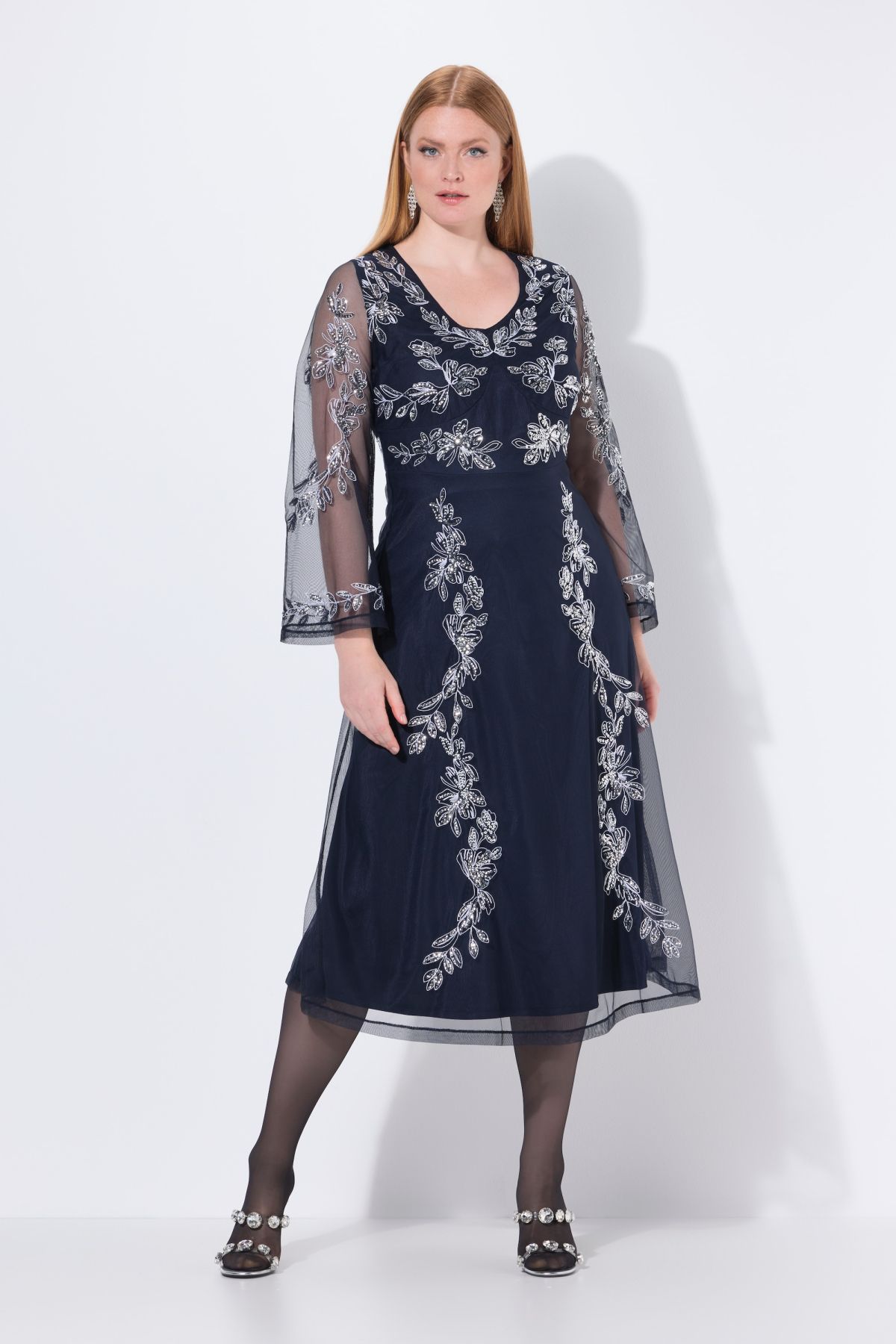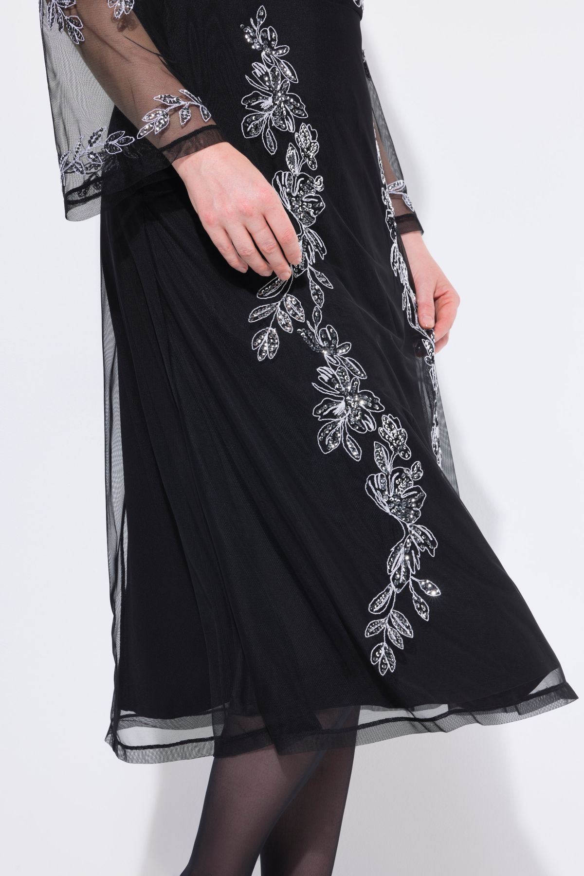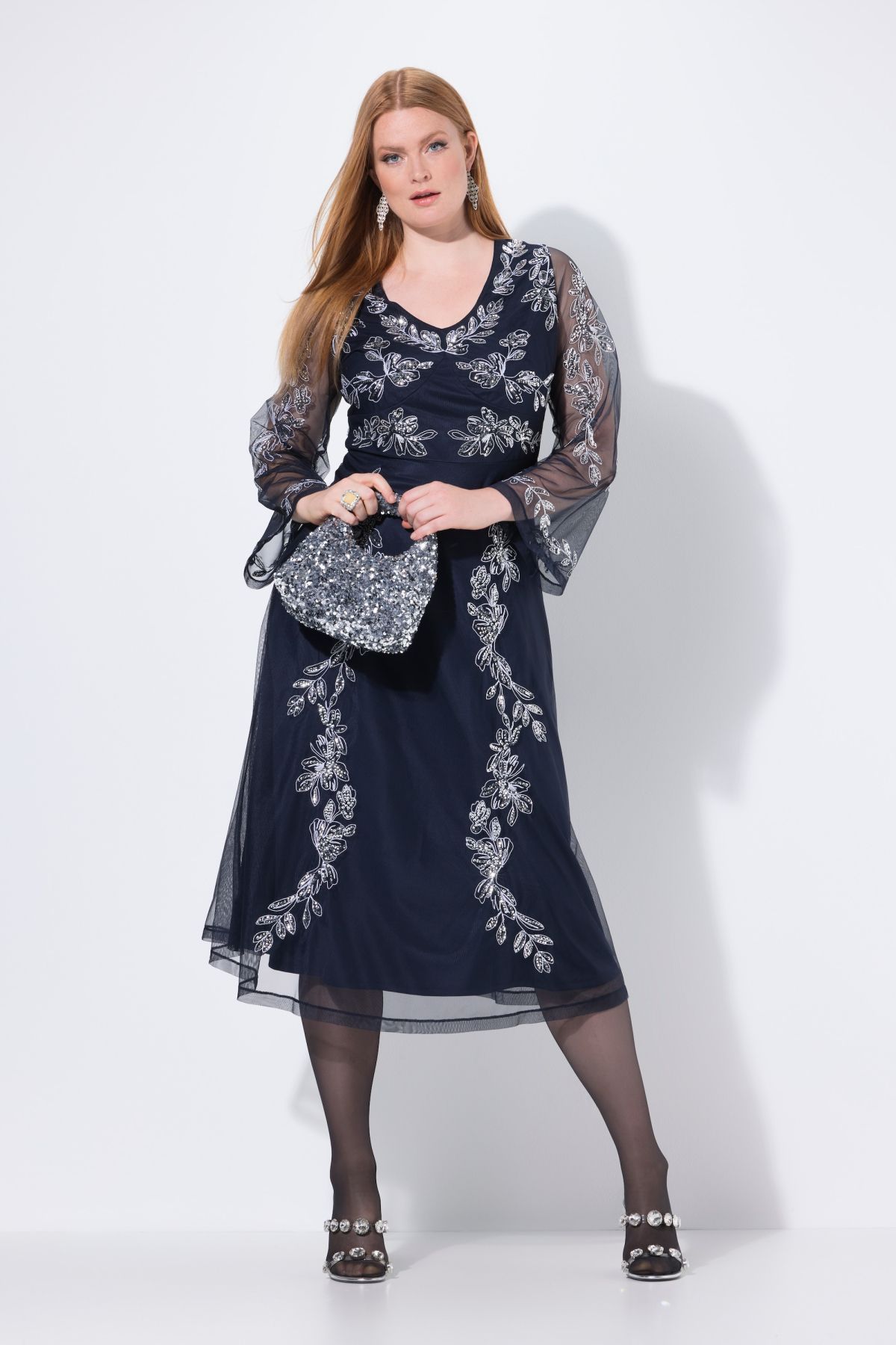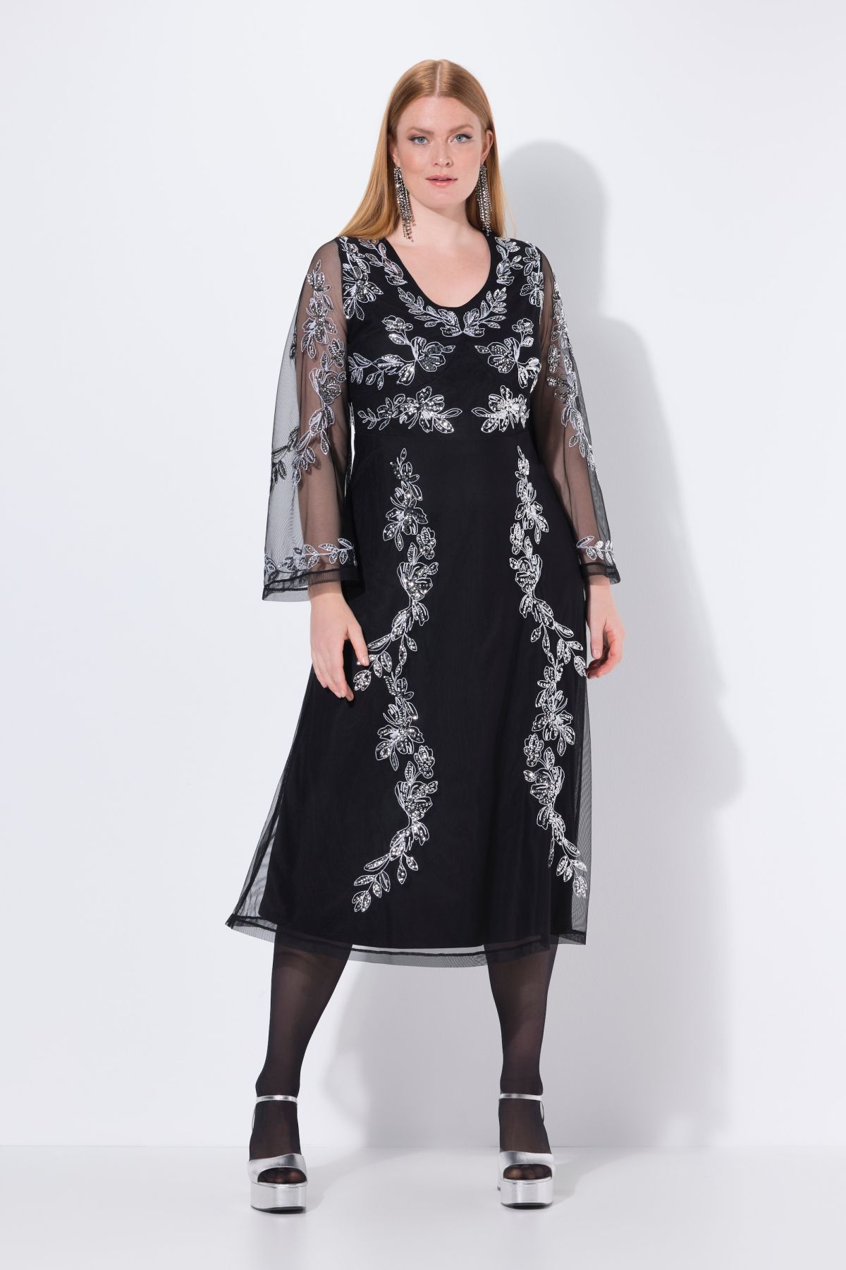 Рокля с модерни пайетени акценти и бродерии. С прозрачна мрежа и бляскави детайли на листа. С дълбоко кръгло деколте, прозрачни дълги ръкави с акцент и непрозрачна подплата