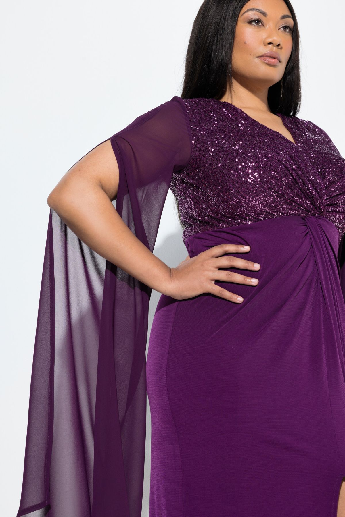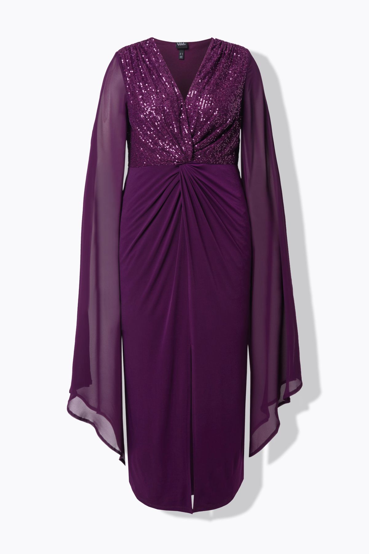 Елегантна вечерна рокля с дълги, ефирни ръкави. С V - образно деколте с пайетени акценти и изчистена пола. С перфектна дължина.
