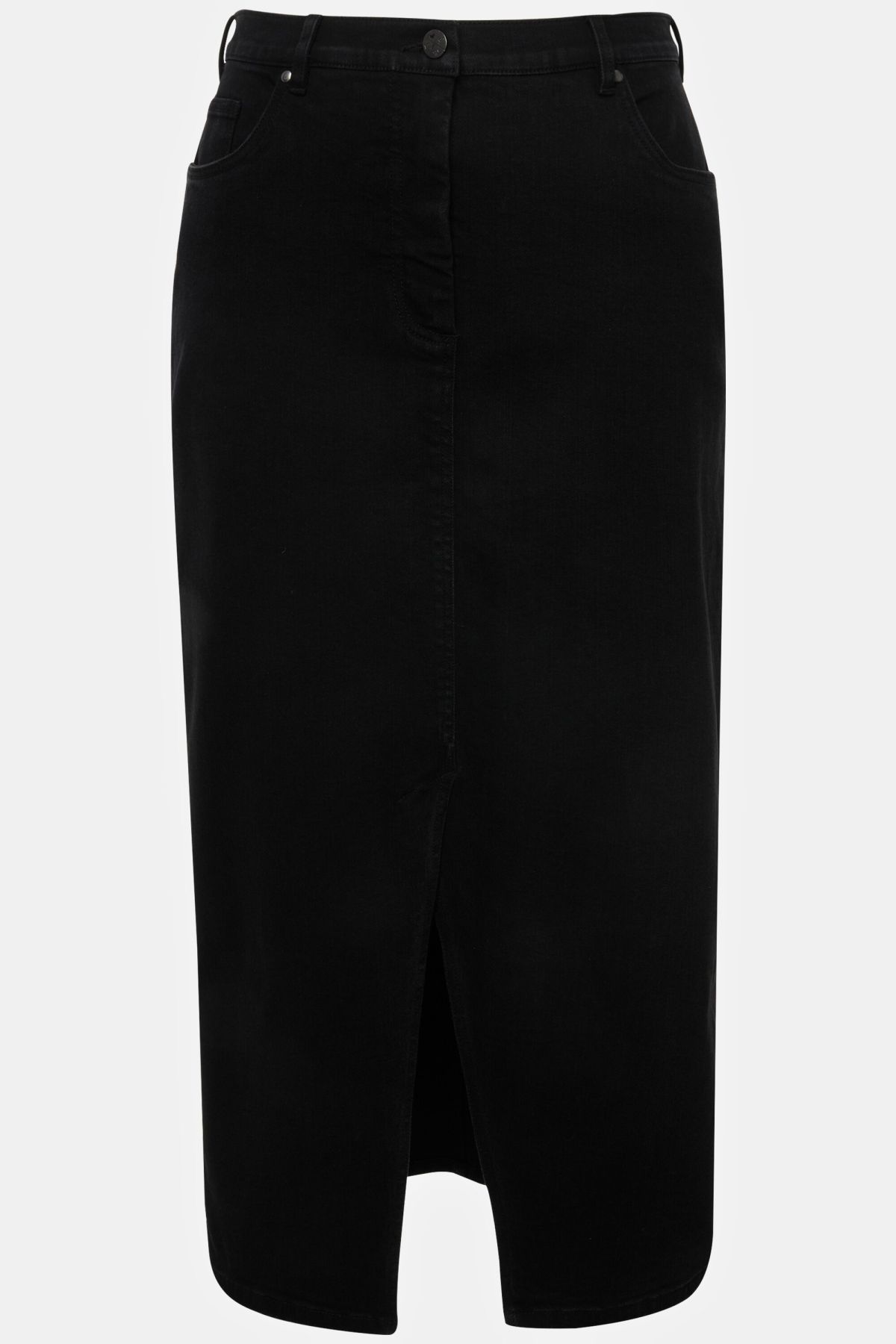 Дънкова пола с класическа визия с ресни на подгъва. Дизайн с 5 джоба и цепка отпред.