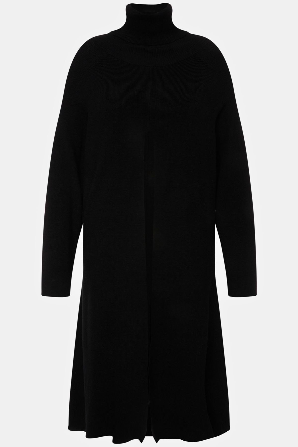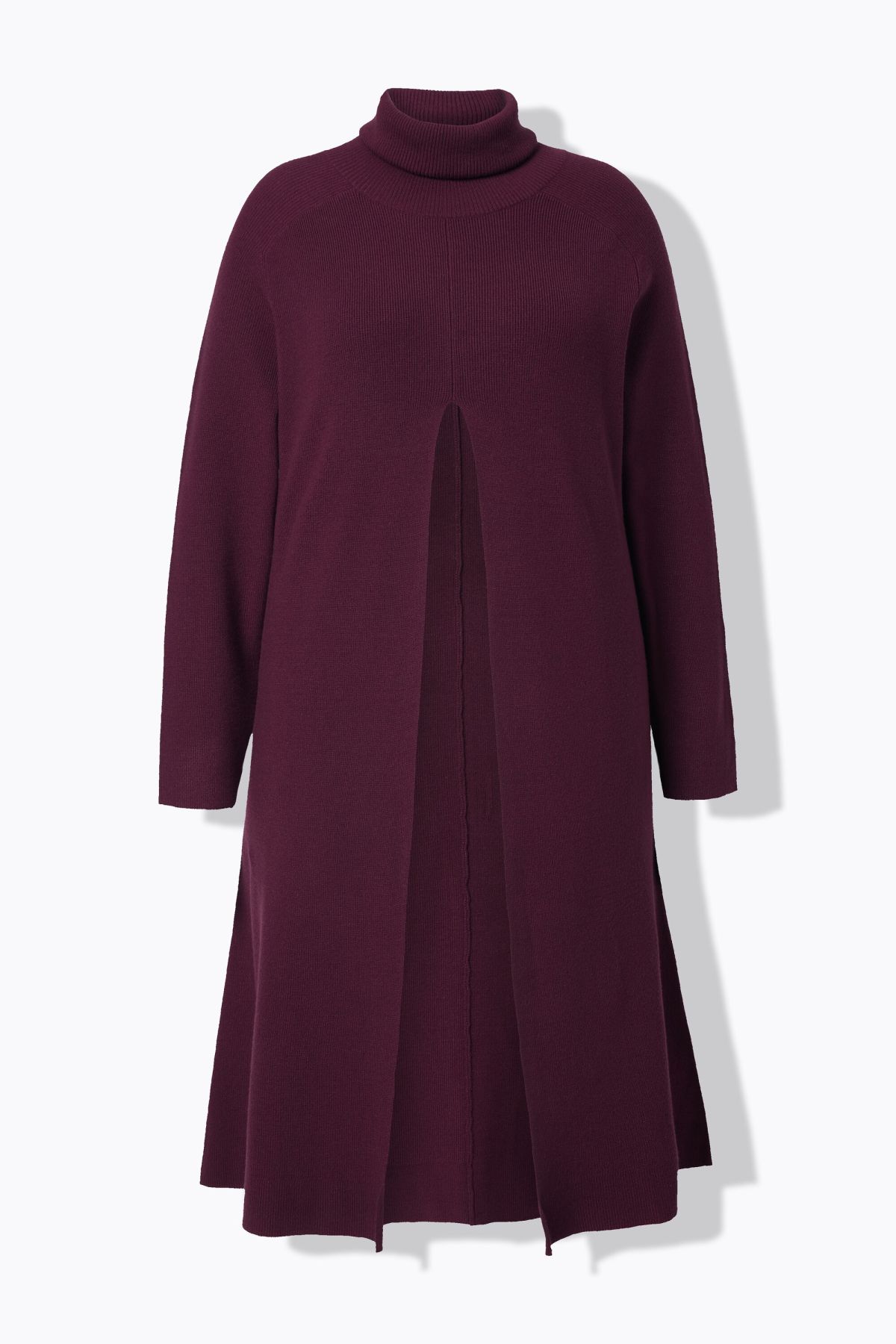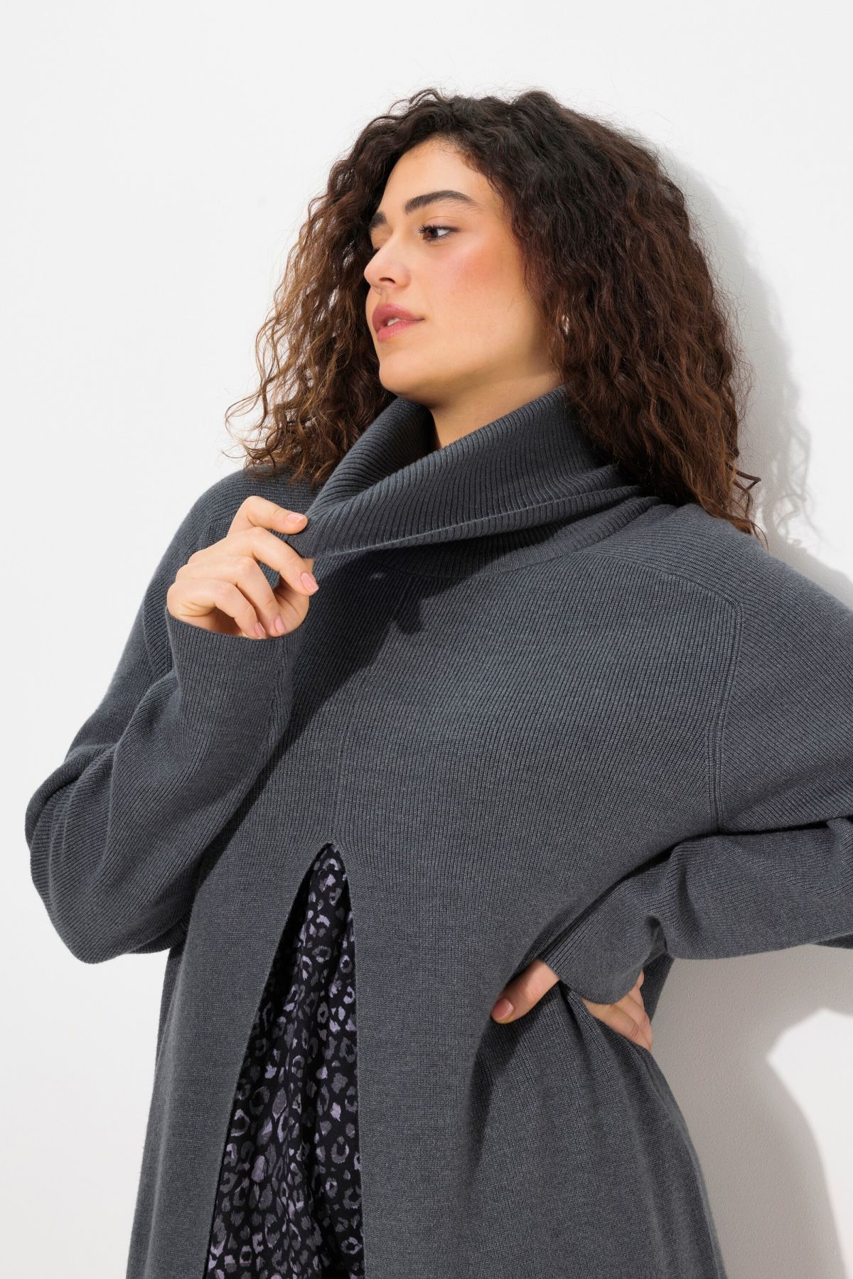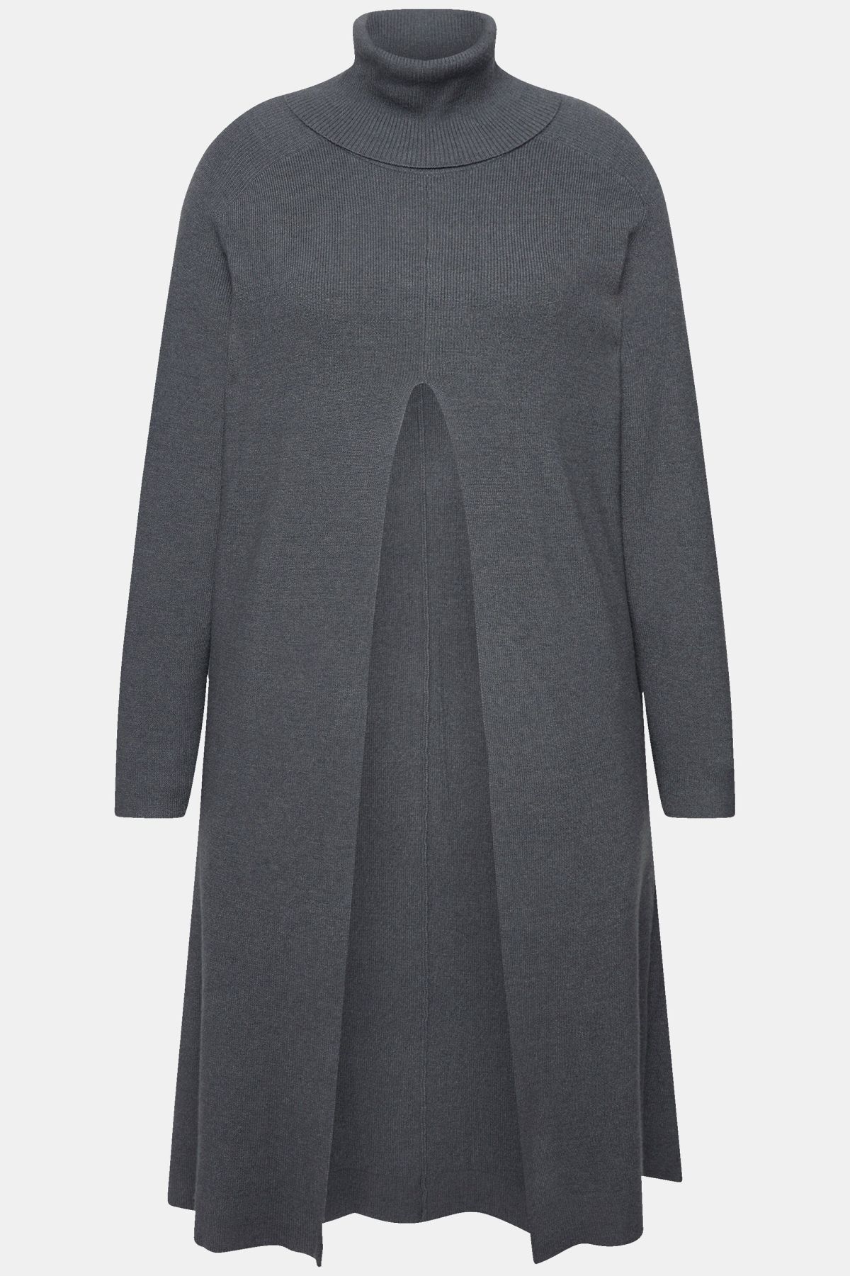 Пуловер с поло яка с изключителна дълга дължина. С дълбока цепка отпред- перфектна за носене върху рокля. С дълги ръкави.