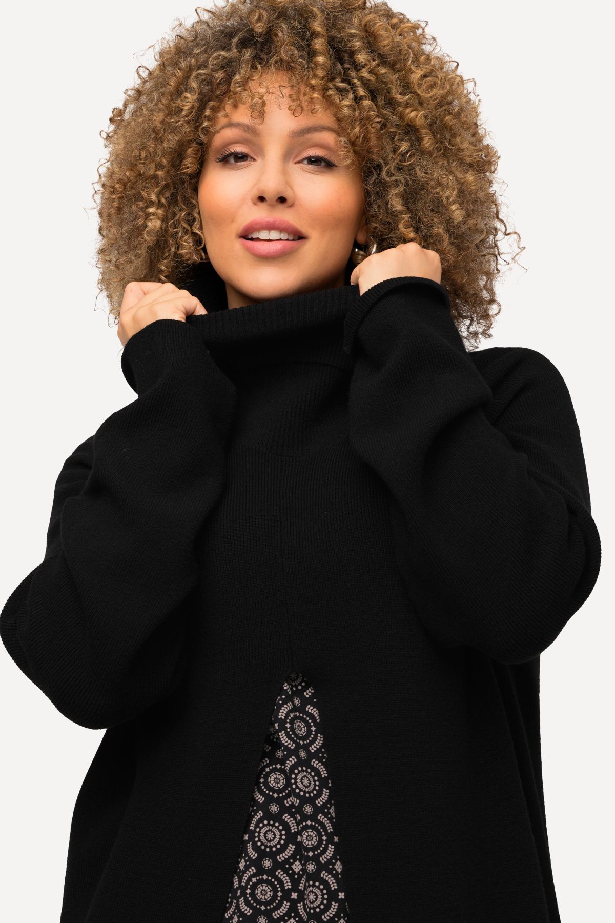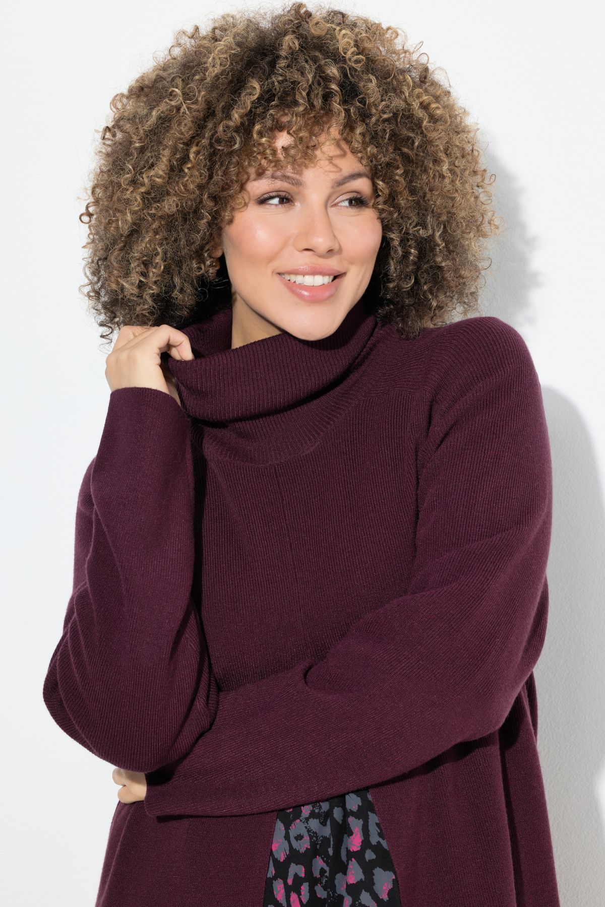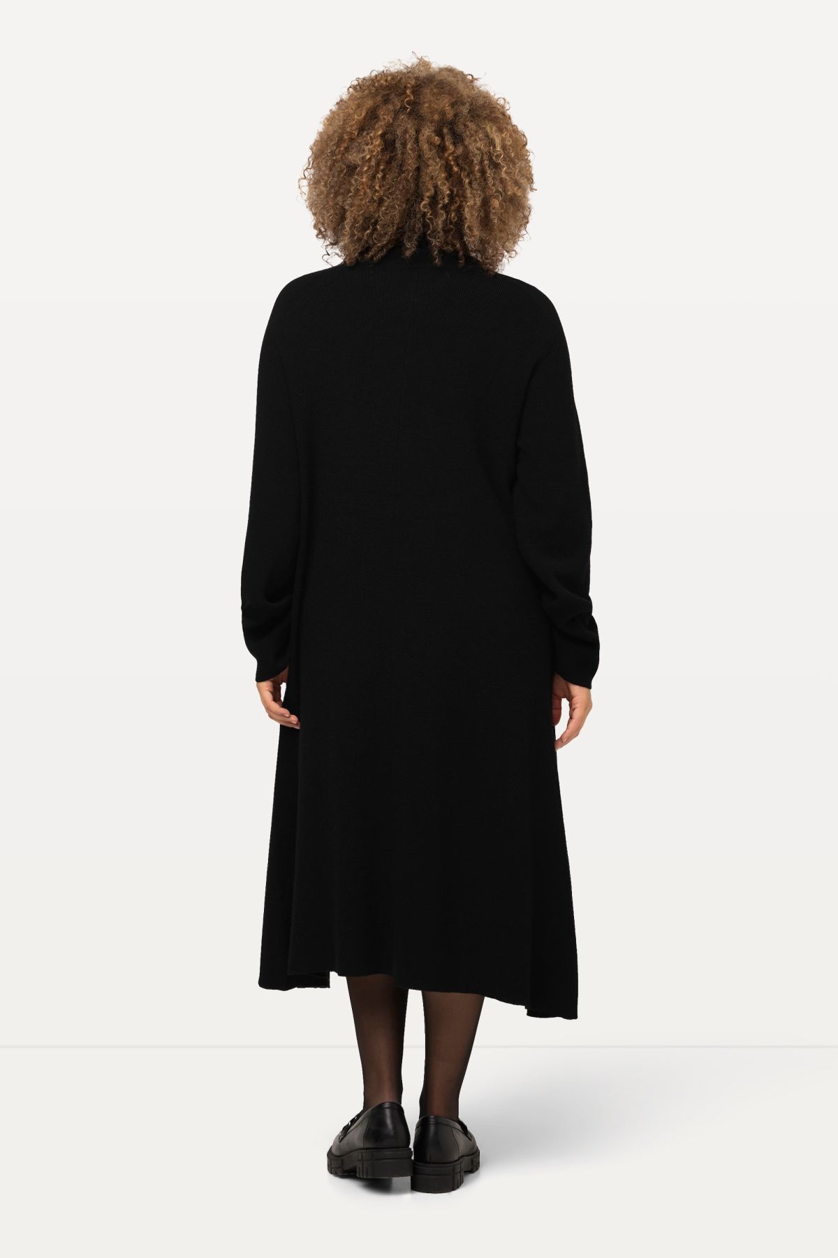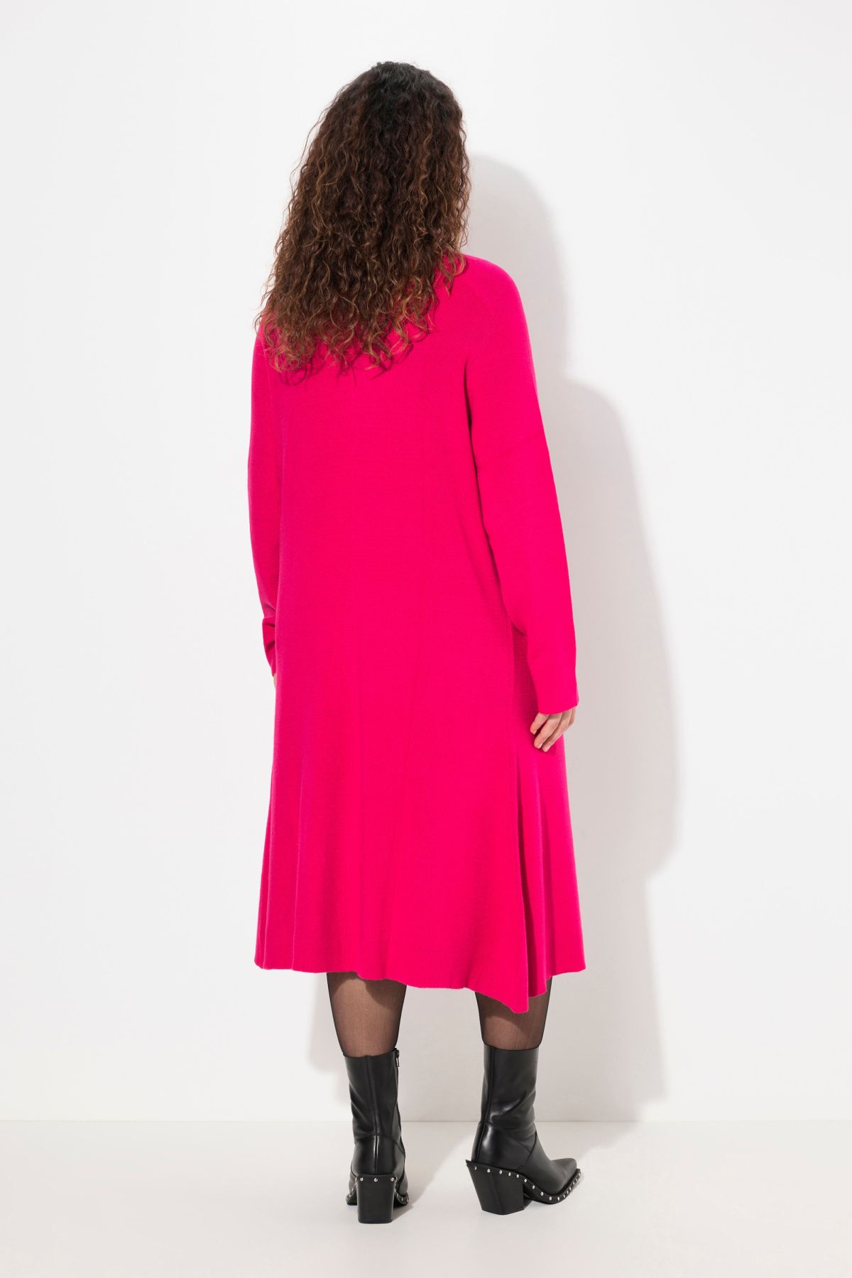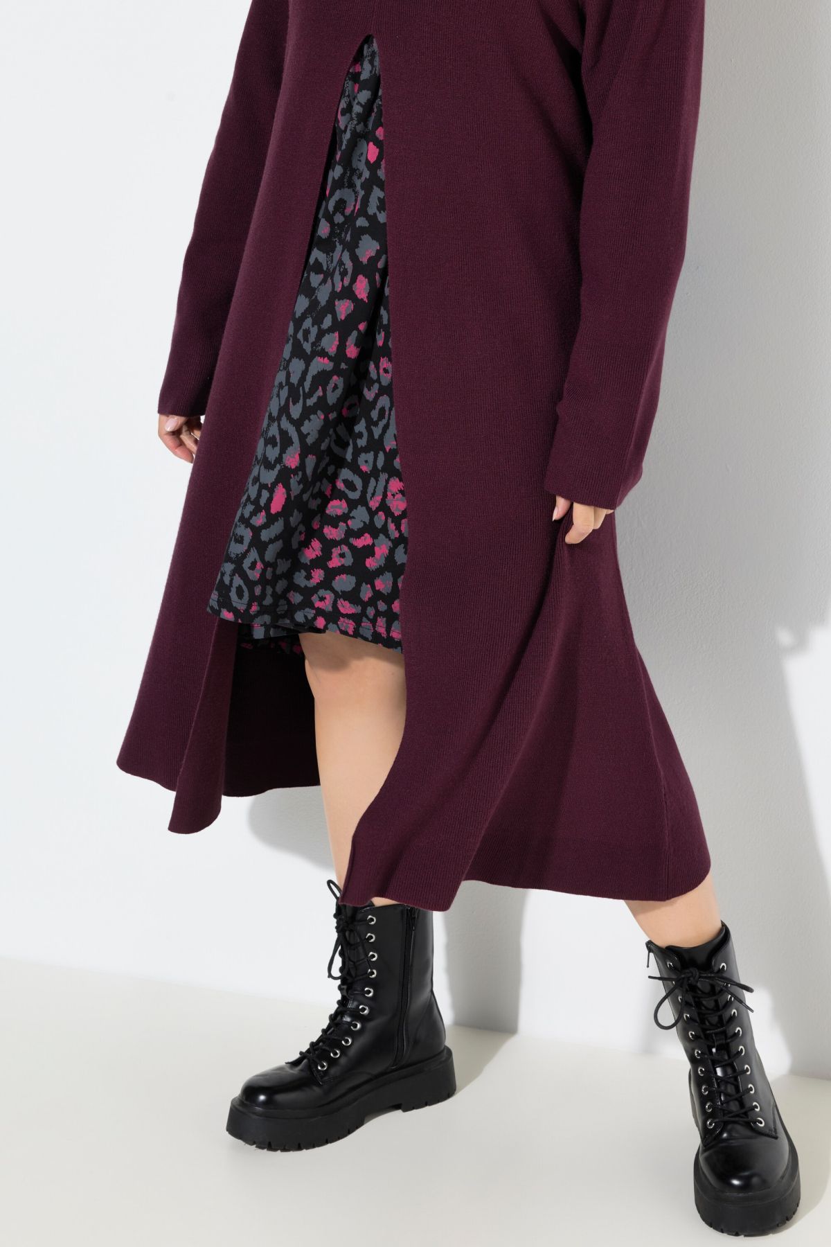 Пуловер с поло яка с изключителна дълга дължина. С дълбока цепка отпред- перфектна за носене върху рокля. С дълги ръкави.