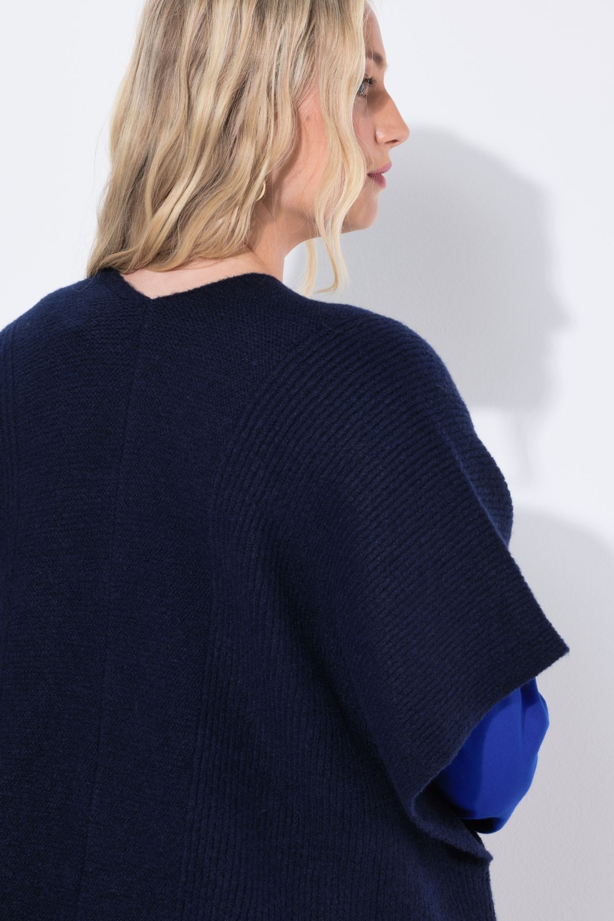 Жилетка от фина рипсена и плетена материя. Перфектно допълнение към всяка рокля или ежедневен сет с дънки. Отворена отпред с къси ръкави.
