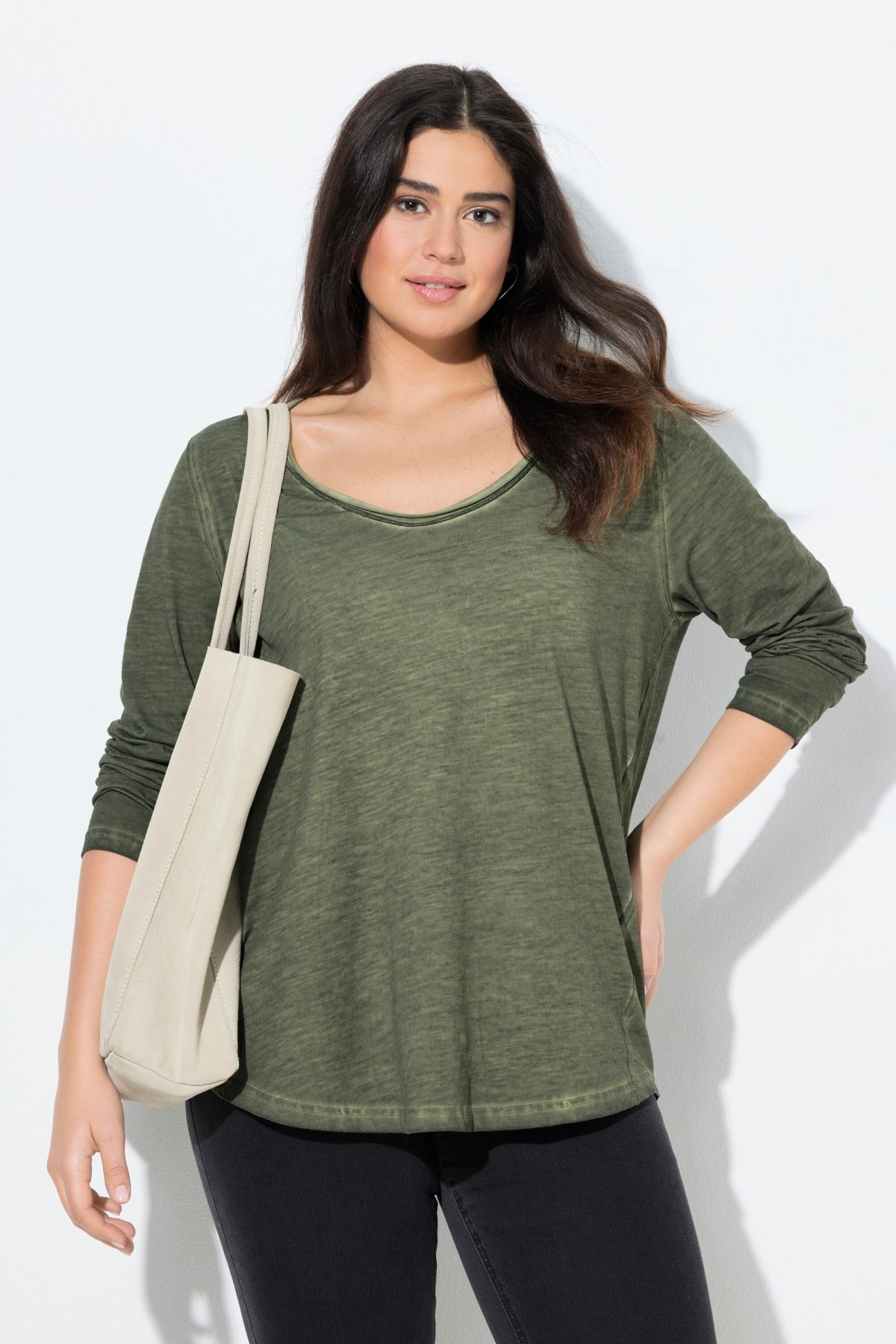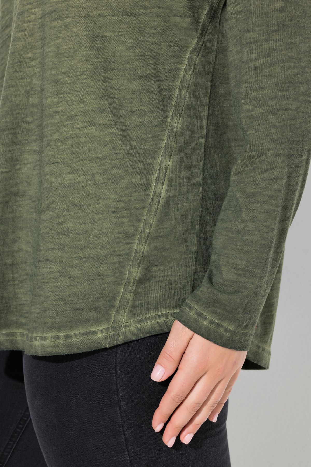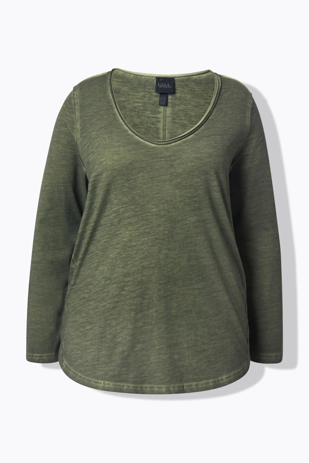 Тениска със заоблени подгъви. От мека, памучна материя. С дълбоко кръгло деколте и дълги ръкави.