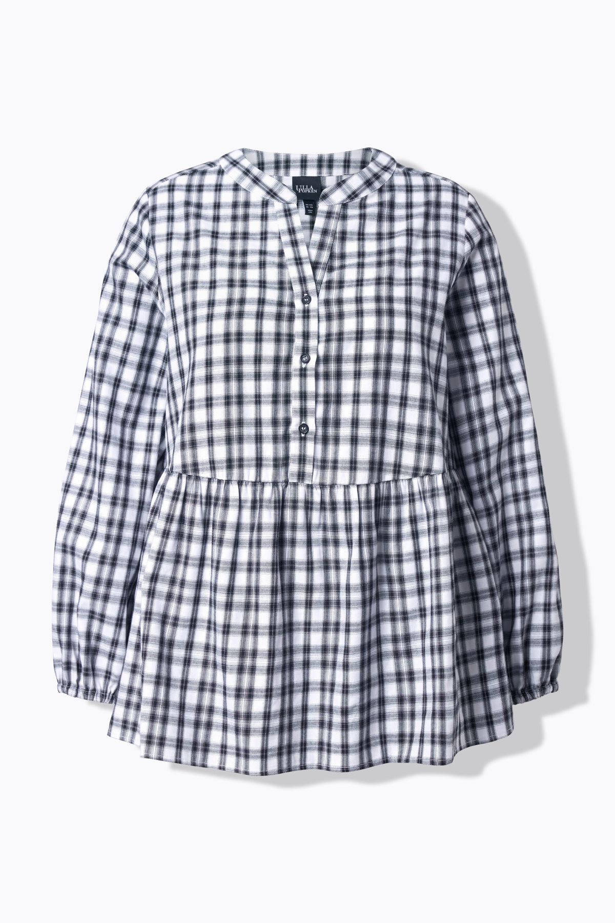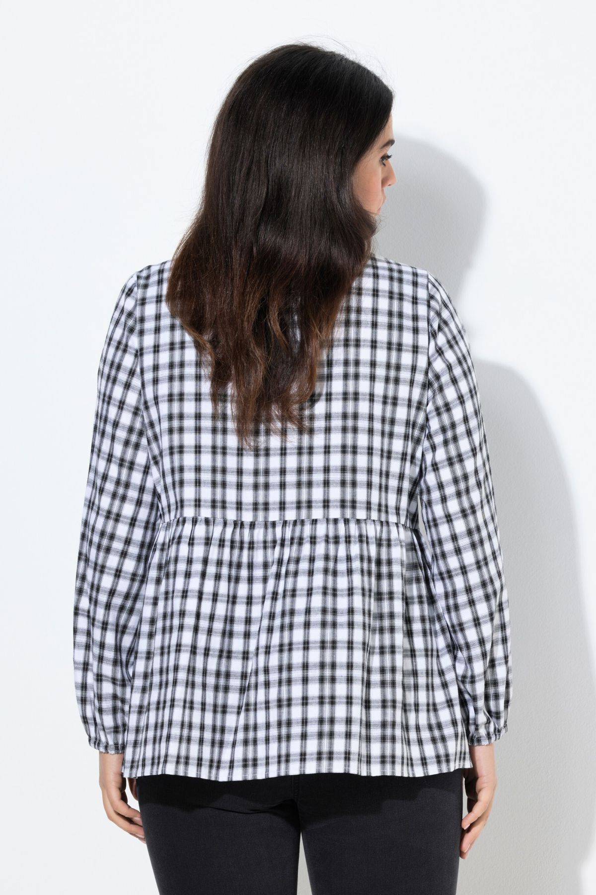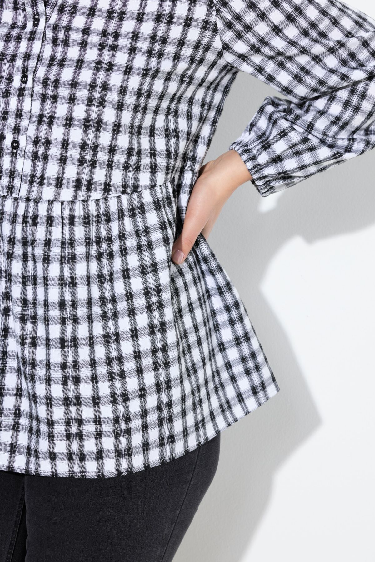 Блуза с кариран принт в градски стил. С шевов акцент под талията, V - образно деколте с копчета и дълги ръкави с маншет с копче.