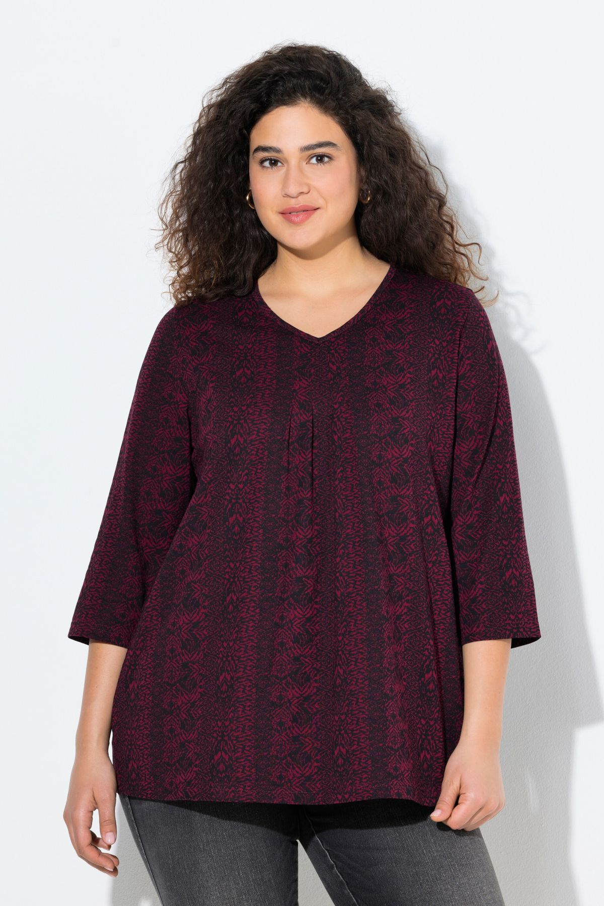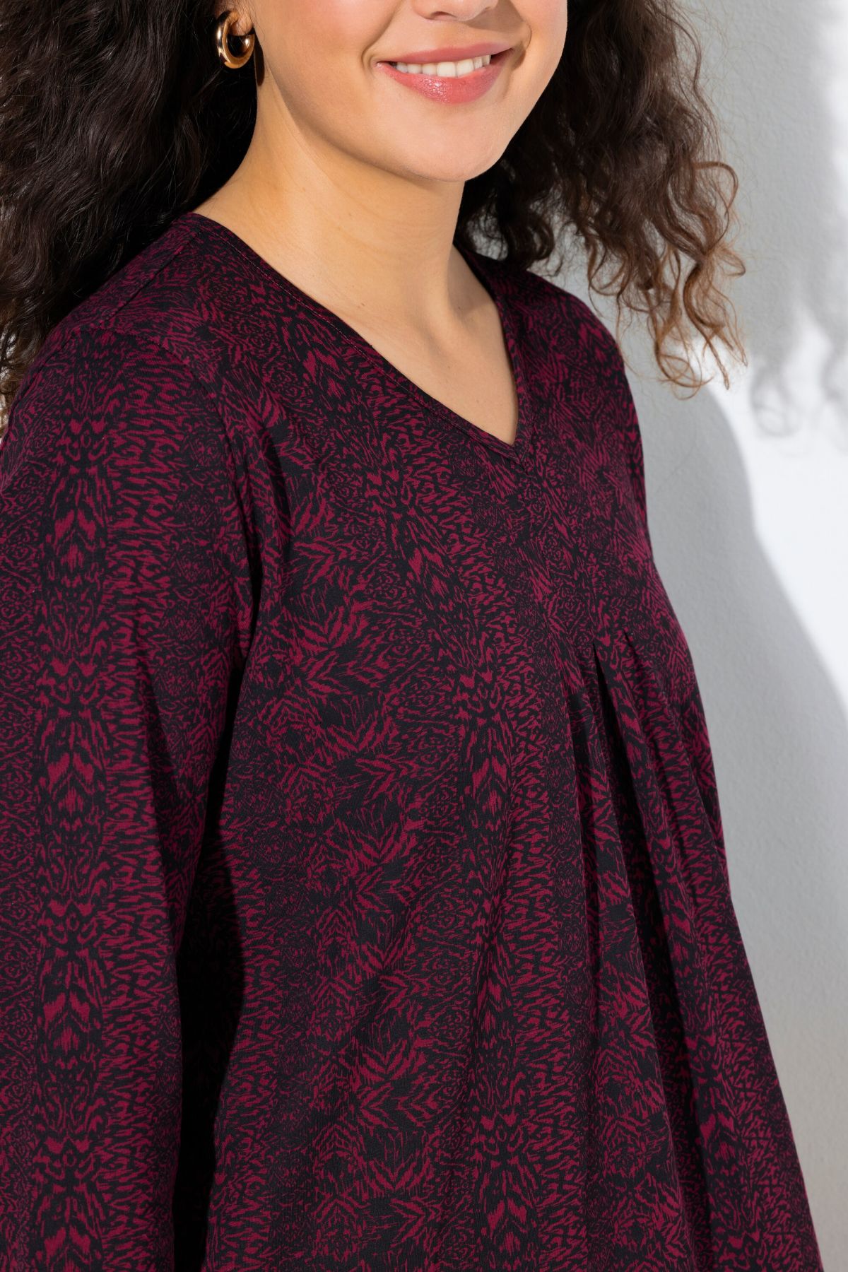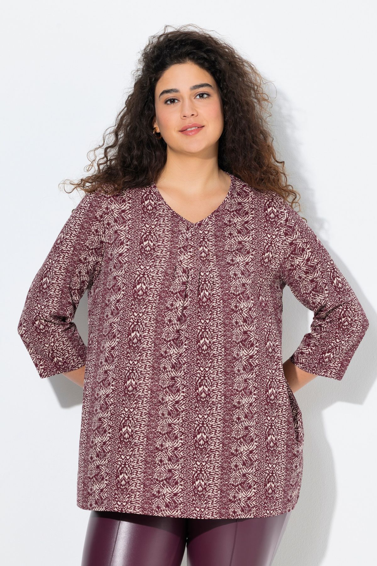 Тениска с микс от раирани принтове. С електрикови акценти. С V - образно деколте и 3/4 ръкави.