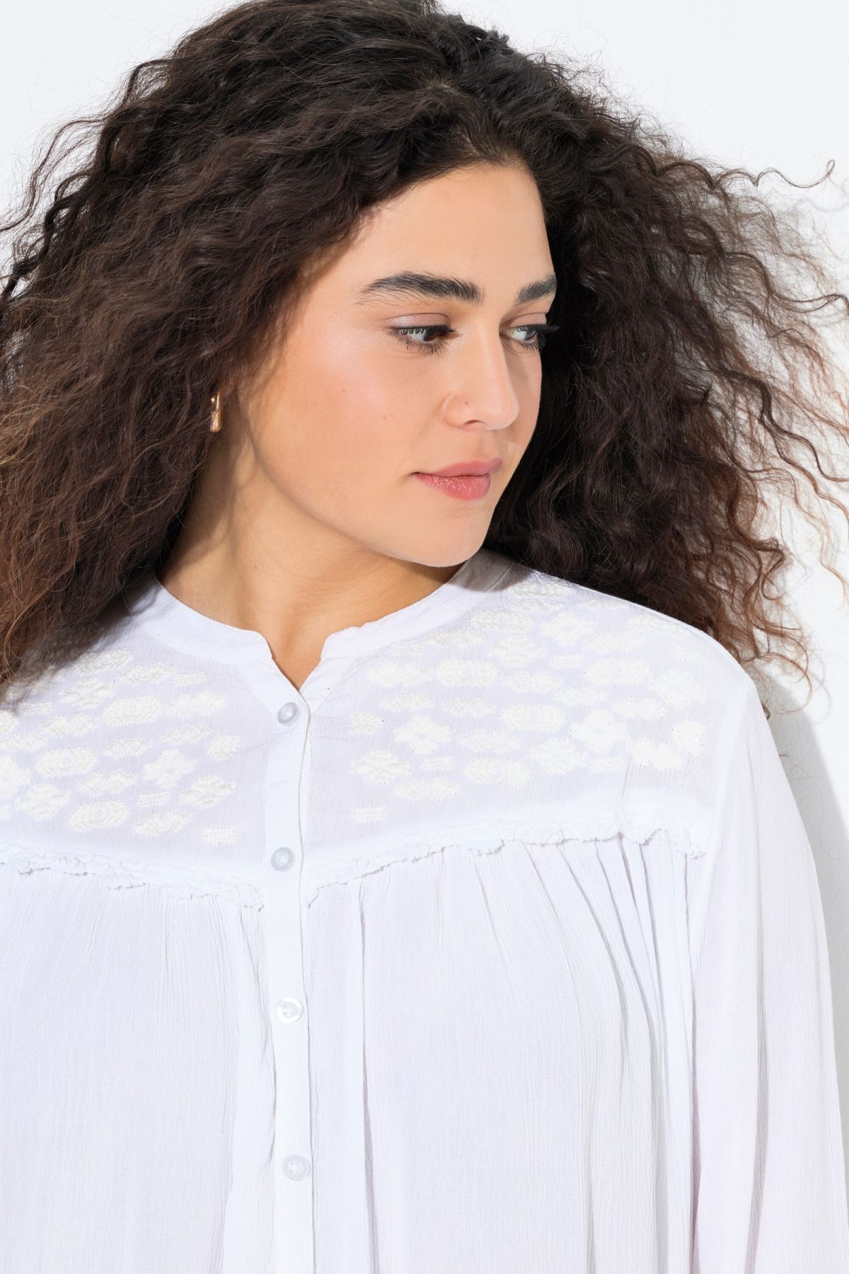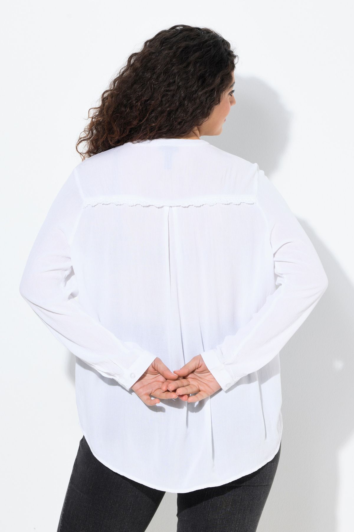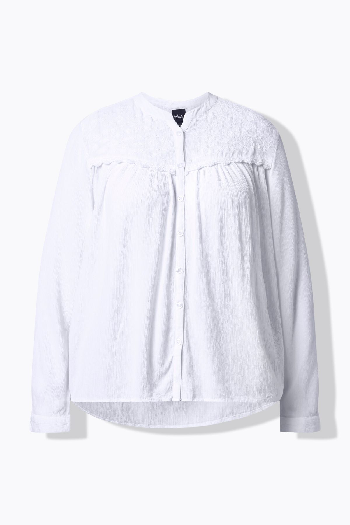 Блуза с деликатна флорална дантела на гърдите. С малка яка, копчета отпред, кръстосани шевови акценти с разкроен детайл. С дълги ръкави и стилна визия.