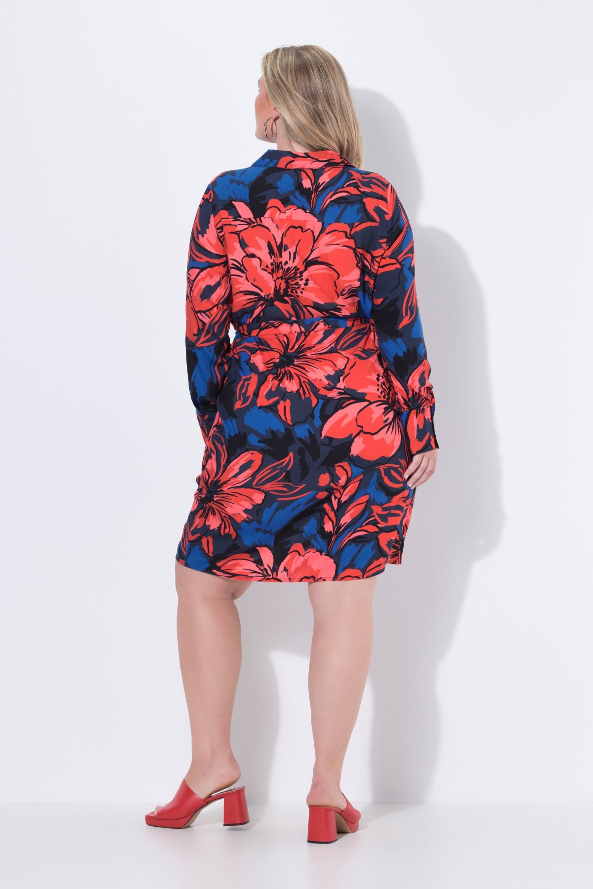 Рокля с флорален принт в контрастни цветове. С колан на талията за придаване на перфектната кройка за всеки. С яка и V- образно деколте. С дълги ръкави.