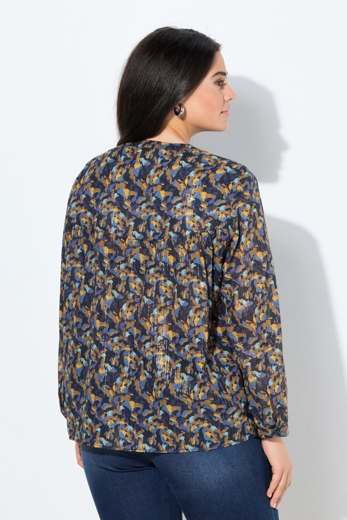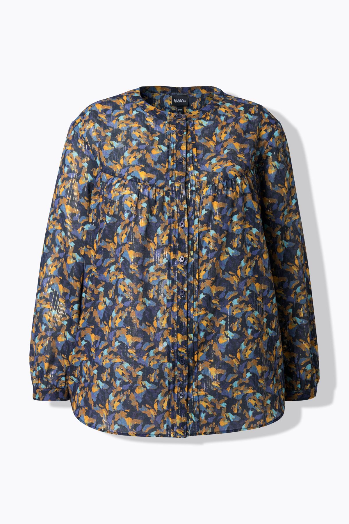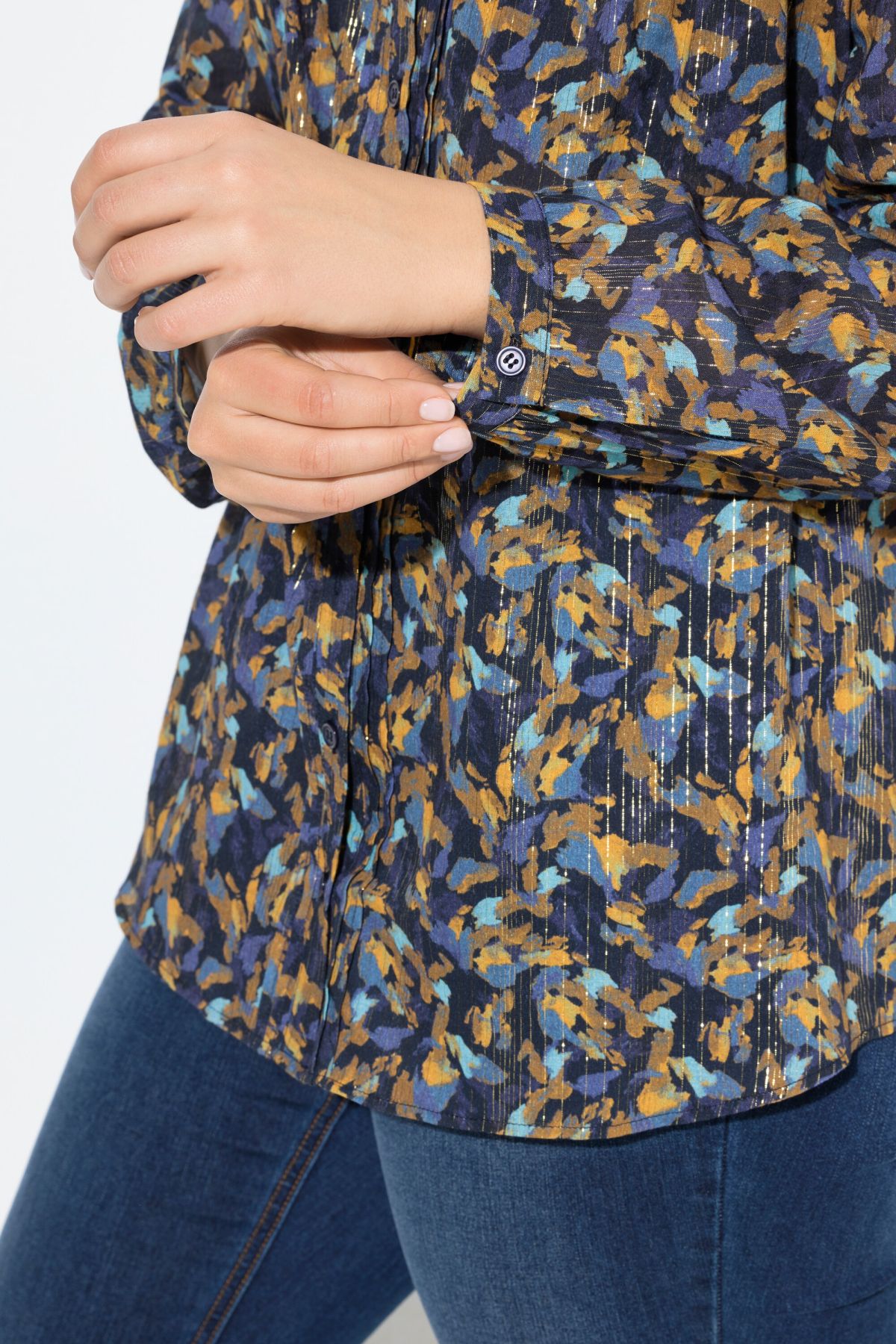 Блуза с раиран принт и акцент от бляскави райета с метални ивици. С кръгло деколте, копчета отпред, драпирани акценти и дълги ръкави с маншет.