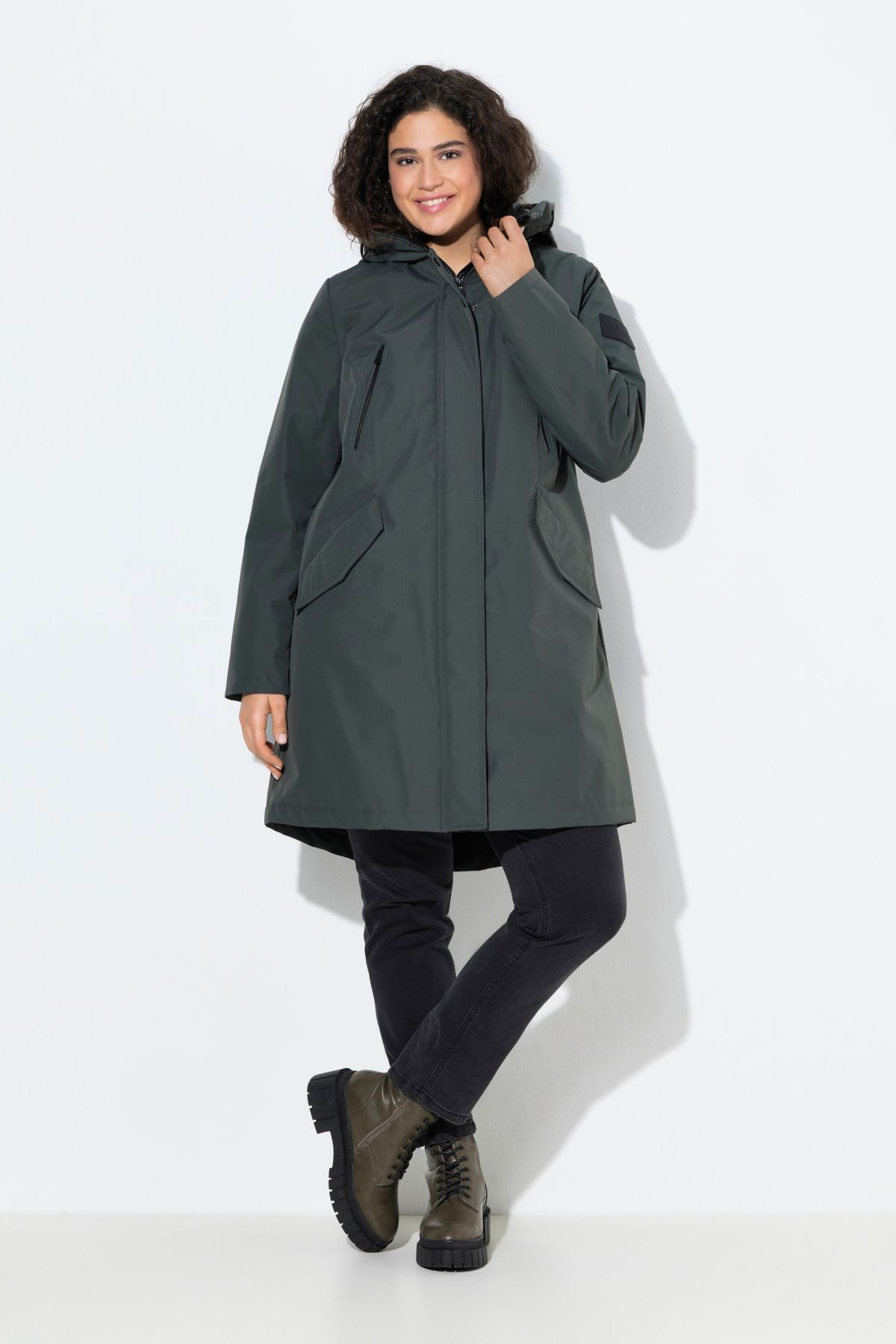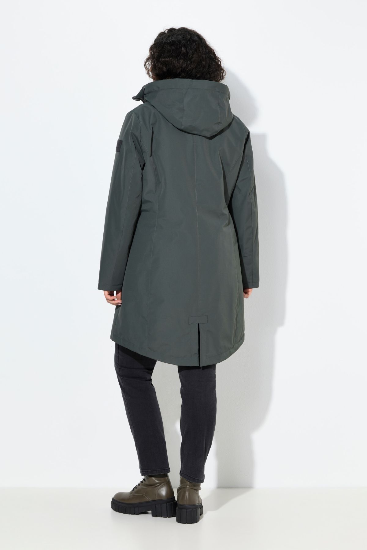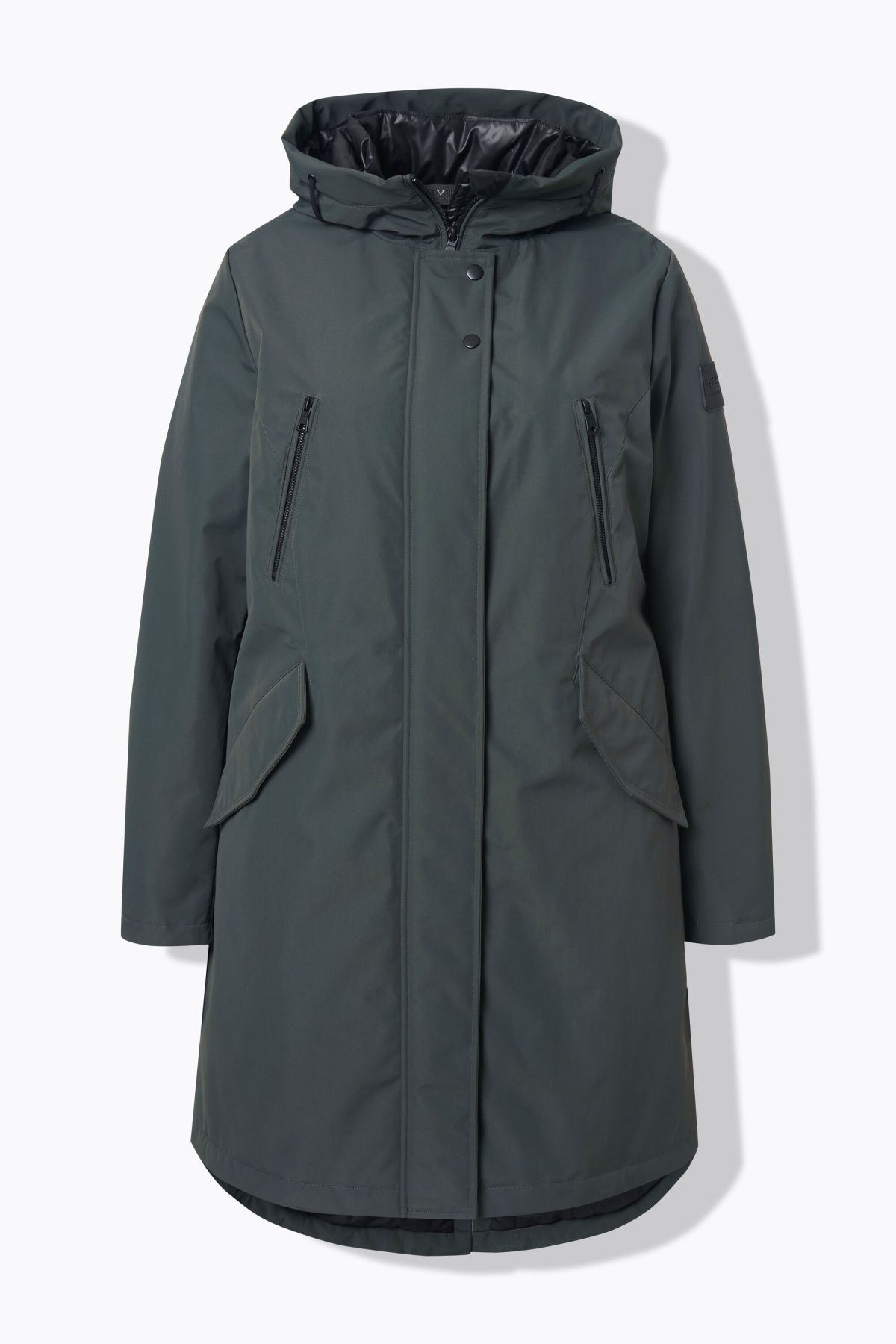 Дълго яке HYPRAR тип палто. От водонепромокаема материя. Дизайн с качулка с връзка, странични джобове с капаци, скрит цип отпред с копчета, дълги ръкави и А -линия на силуета.