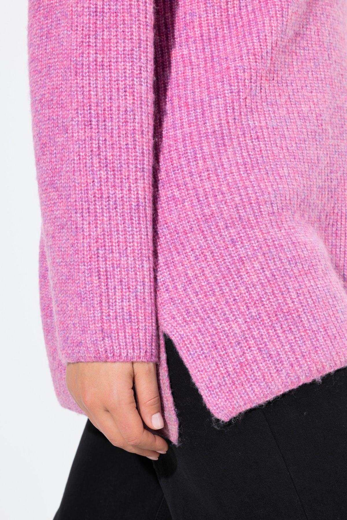 Пуловер с рипсена плетка от супер мека, пухкава материя. С изправена поло яка и дълги ръкави. Със странични цепки на подгъва.