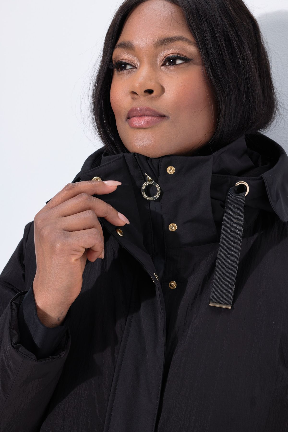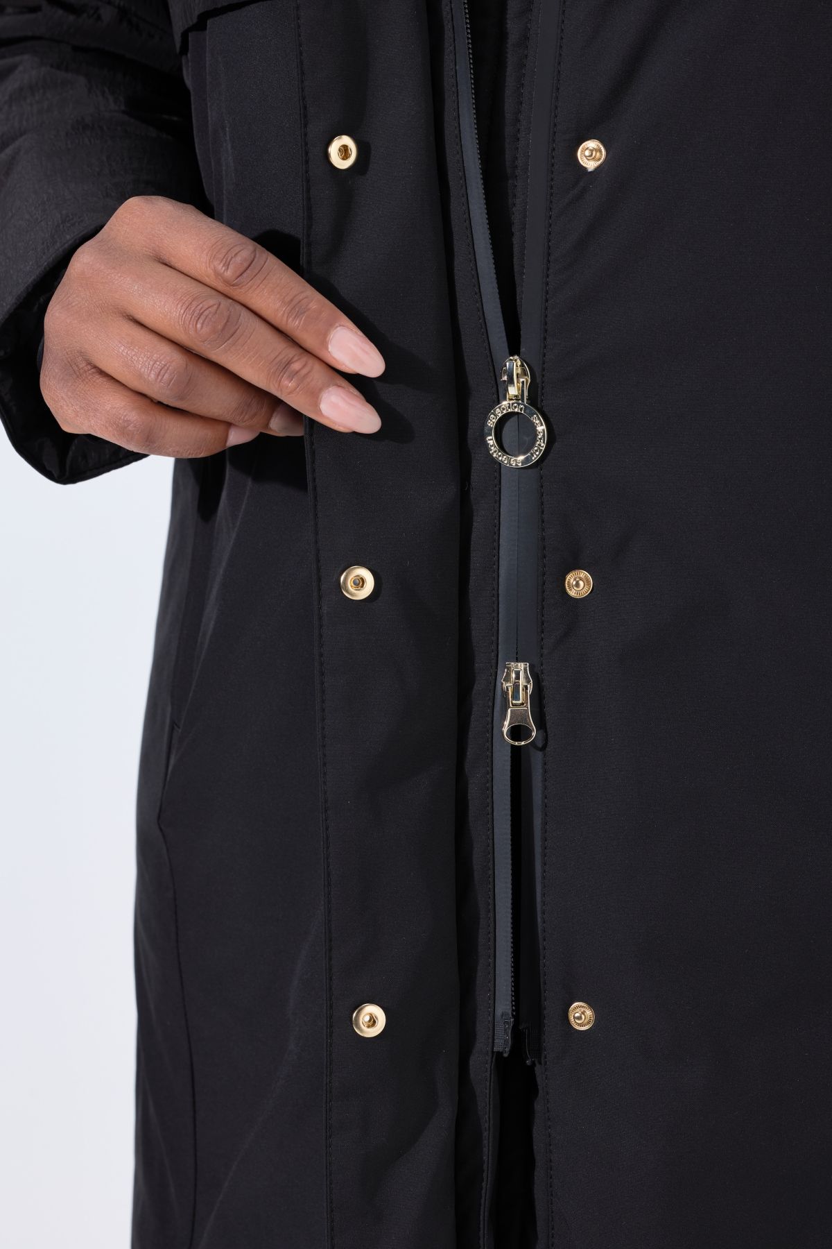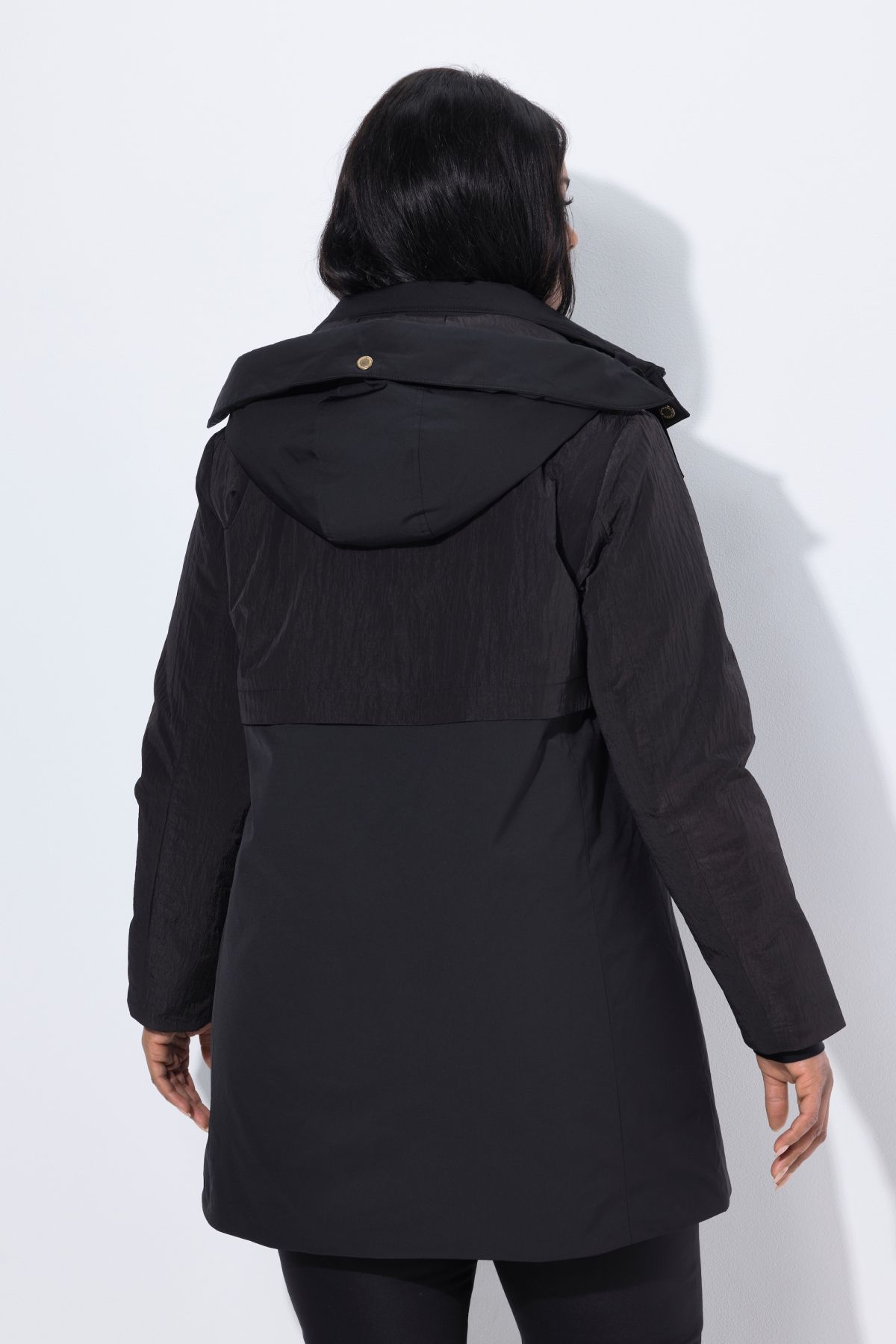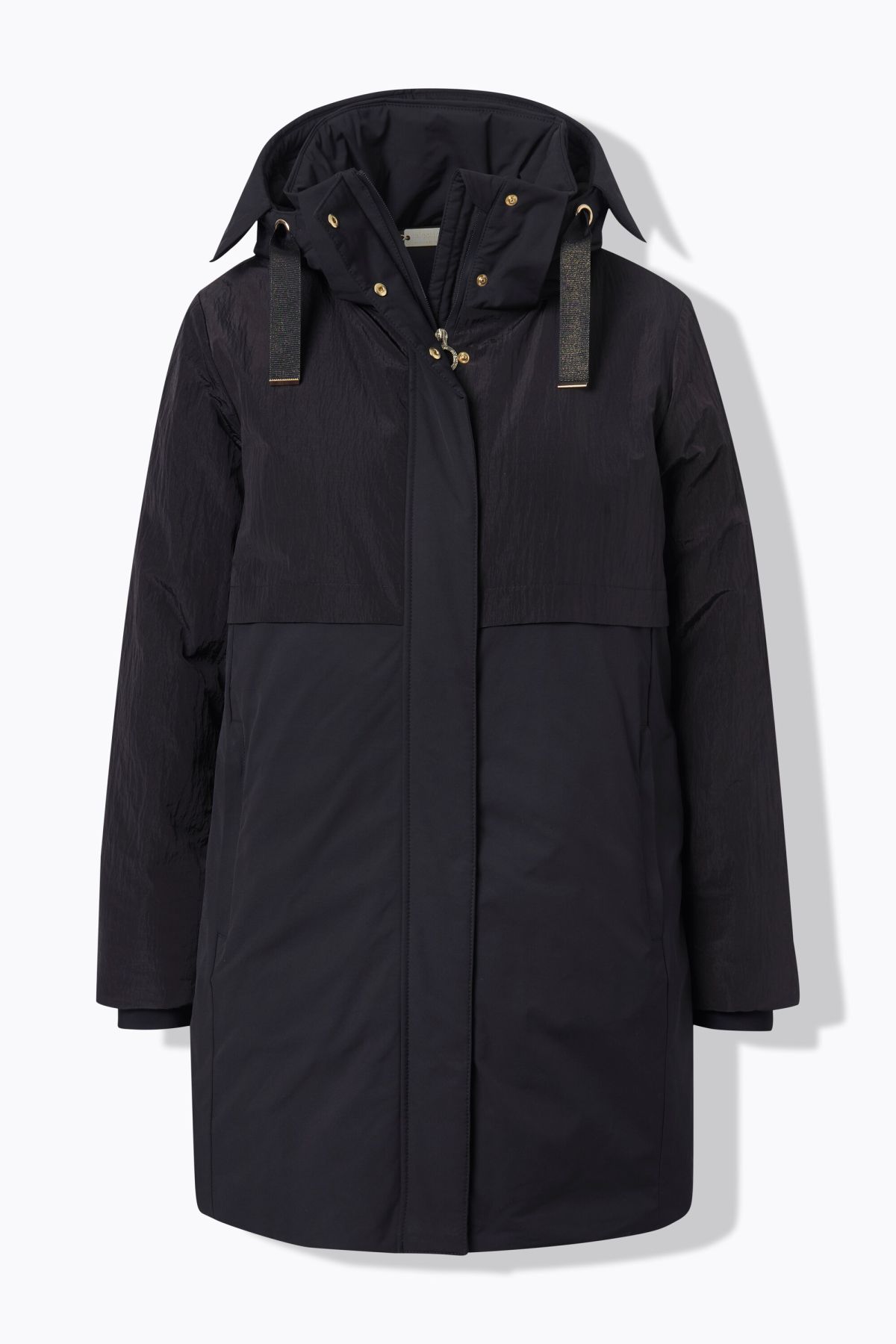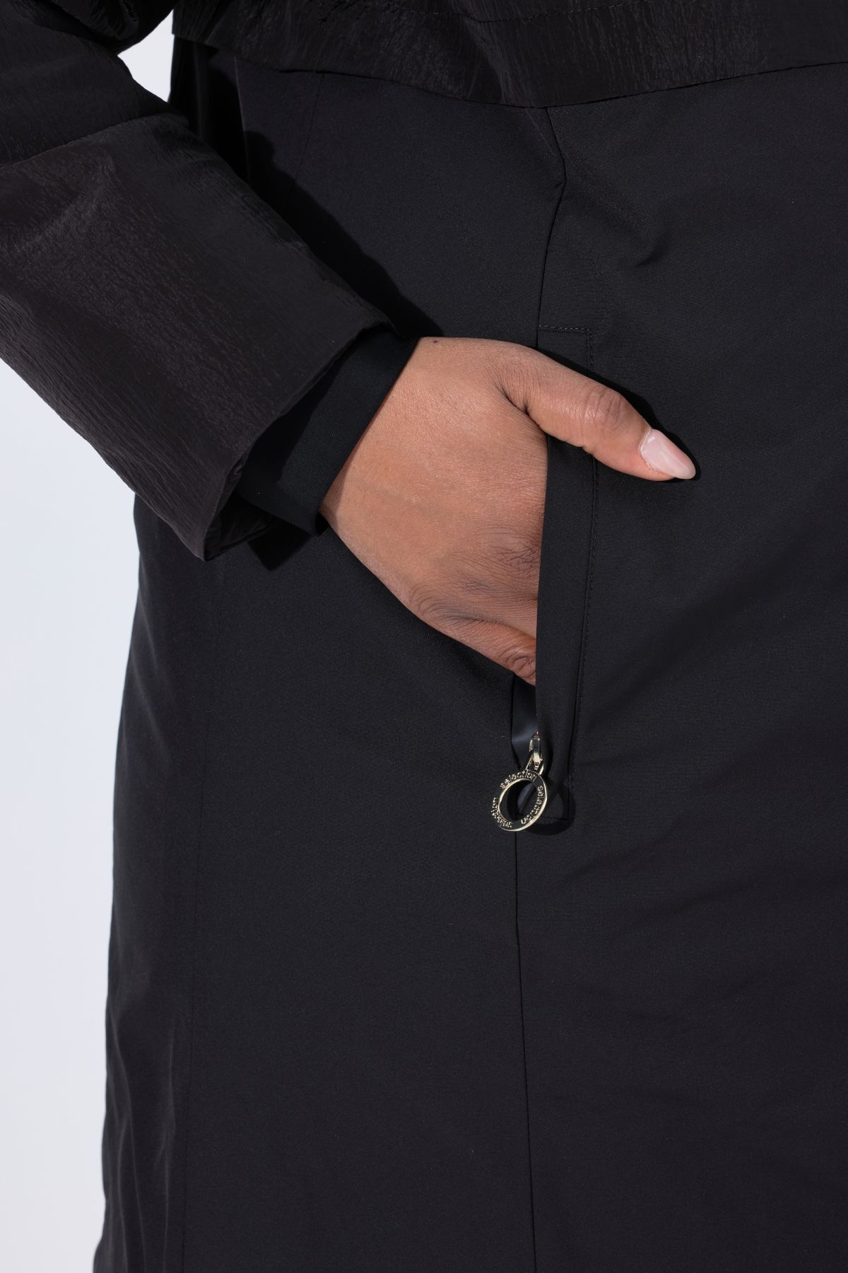 Водоустойчива, ветроустойчива, дишаща, яка с висока талия и сваляща се, регулируема качулка, А-силует със скрит, водоустойчив цип, дълги ръкави с ветроустойчива защита, джобове с цип, изцяло подплатена с джоб с цип, дължина приблизително 90-92 см.