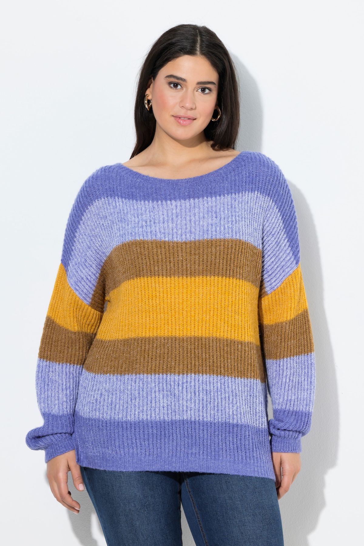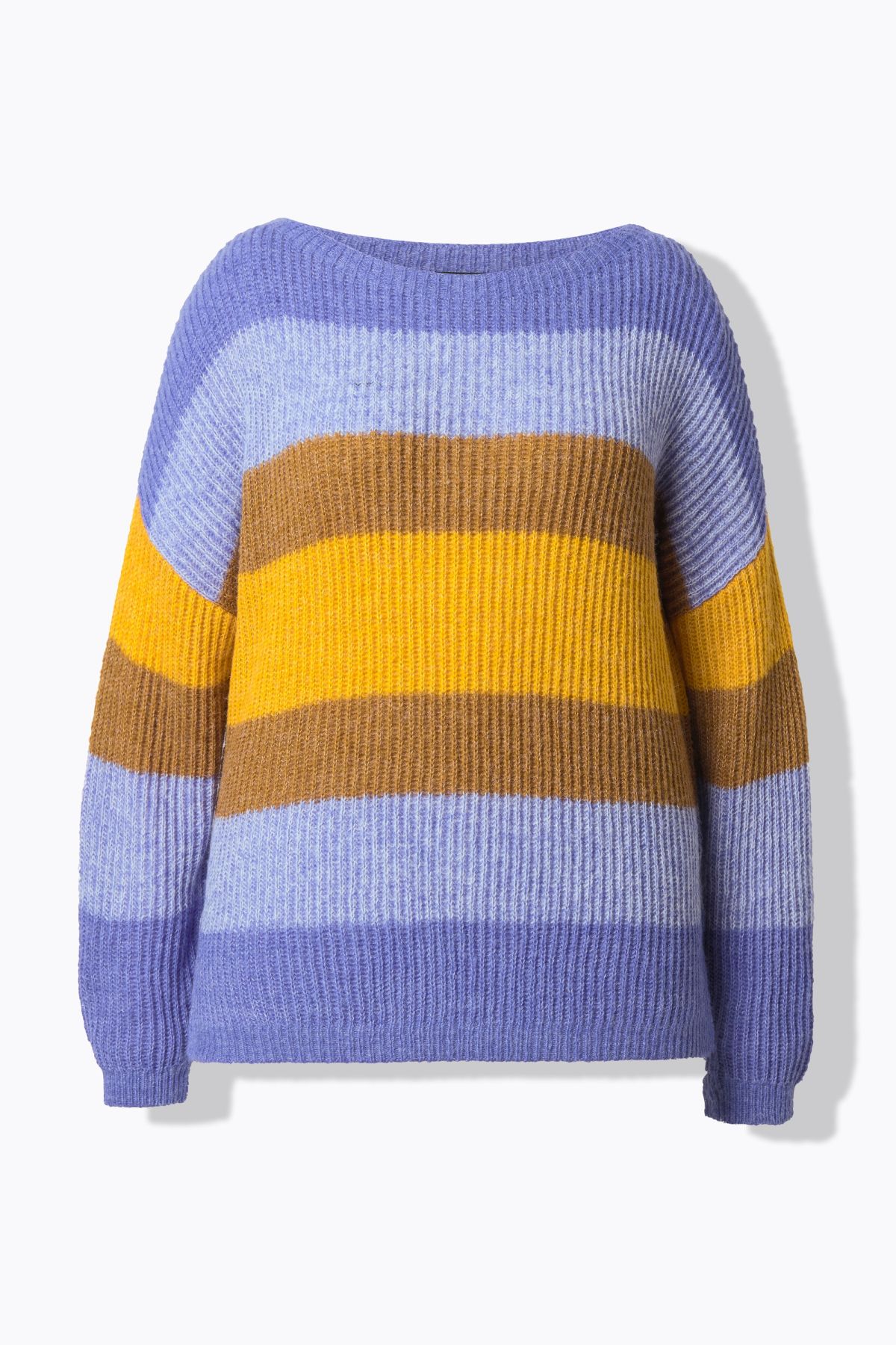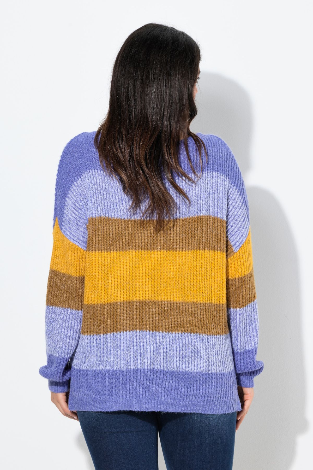 Градиентни райета, кръгло деколте, небрежно голям размер, дълги ръкави, мека фина плетка със съдържание на вълна, дължина, регулирана по размер, приблизително 64-72 см.