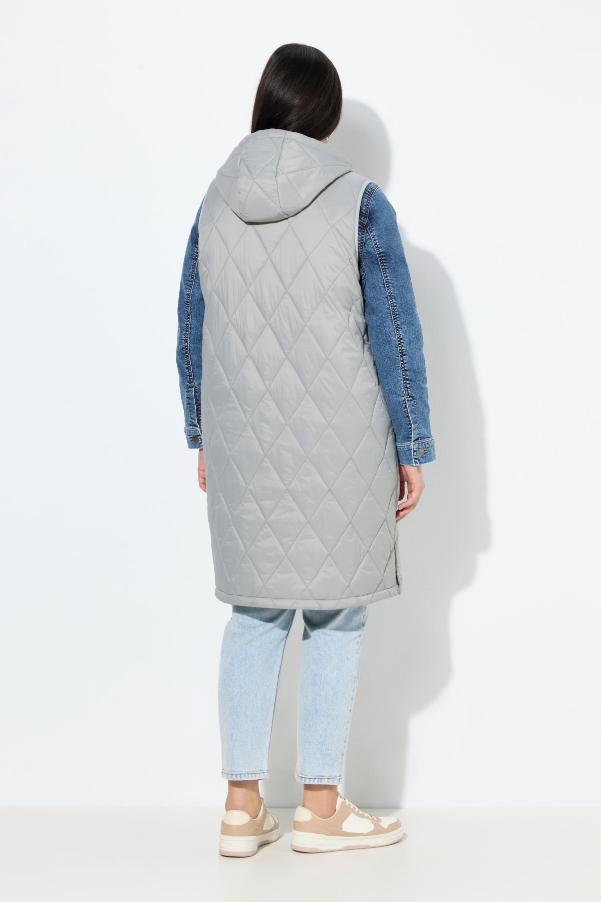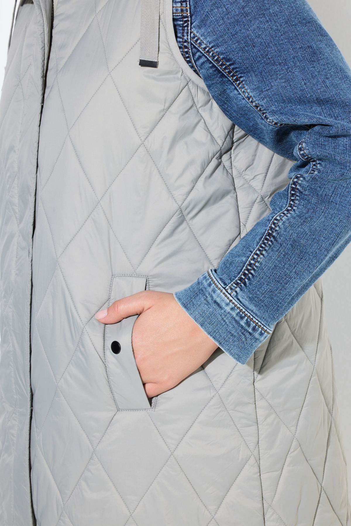 Елек ватиран водонепромокаем от изключително комфорт дълга кройка. С качулка с връзка, изправена яка, скрит цип с капак с копчета и странични джобове. Лек и топъл