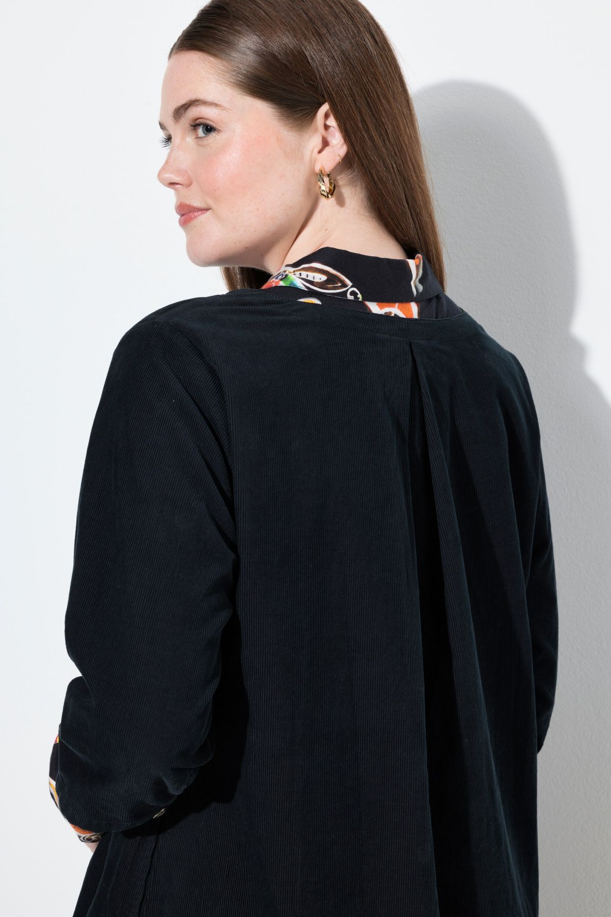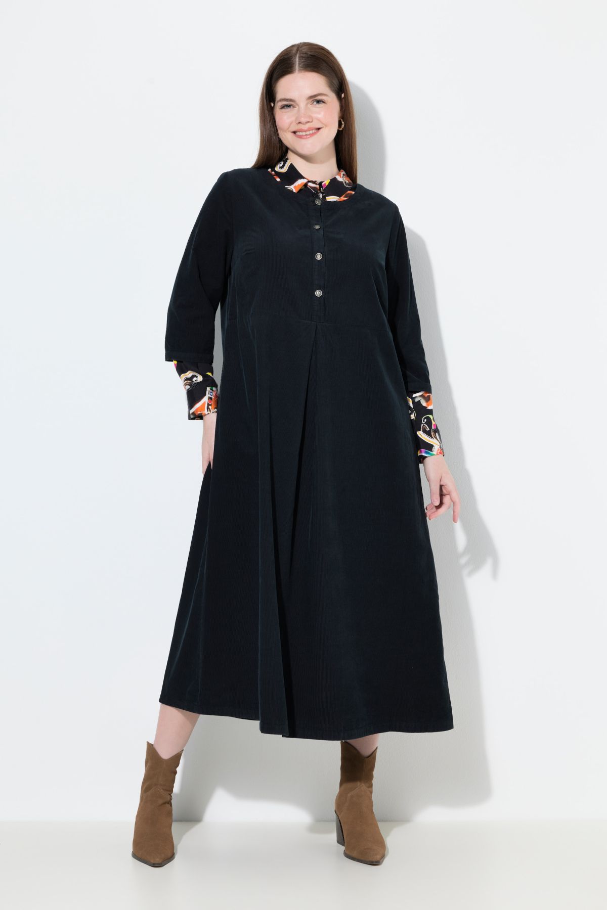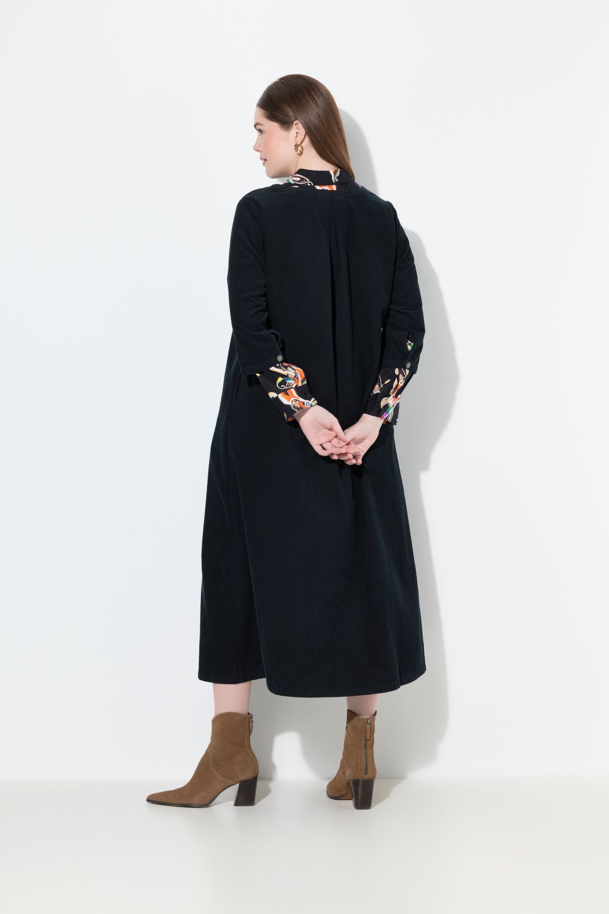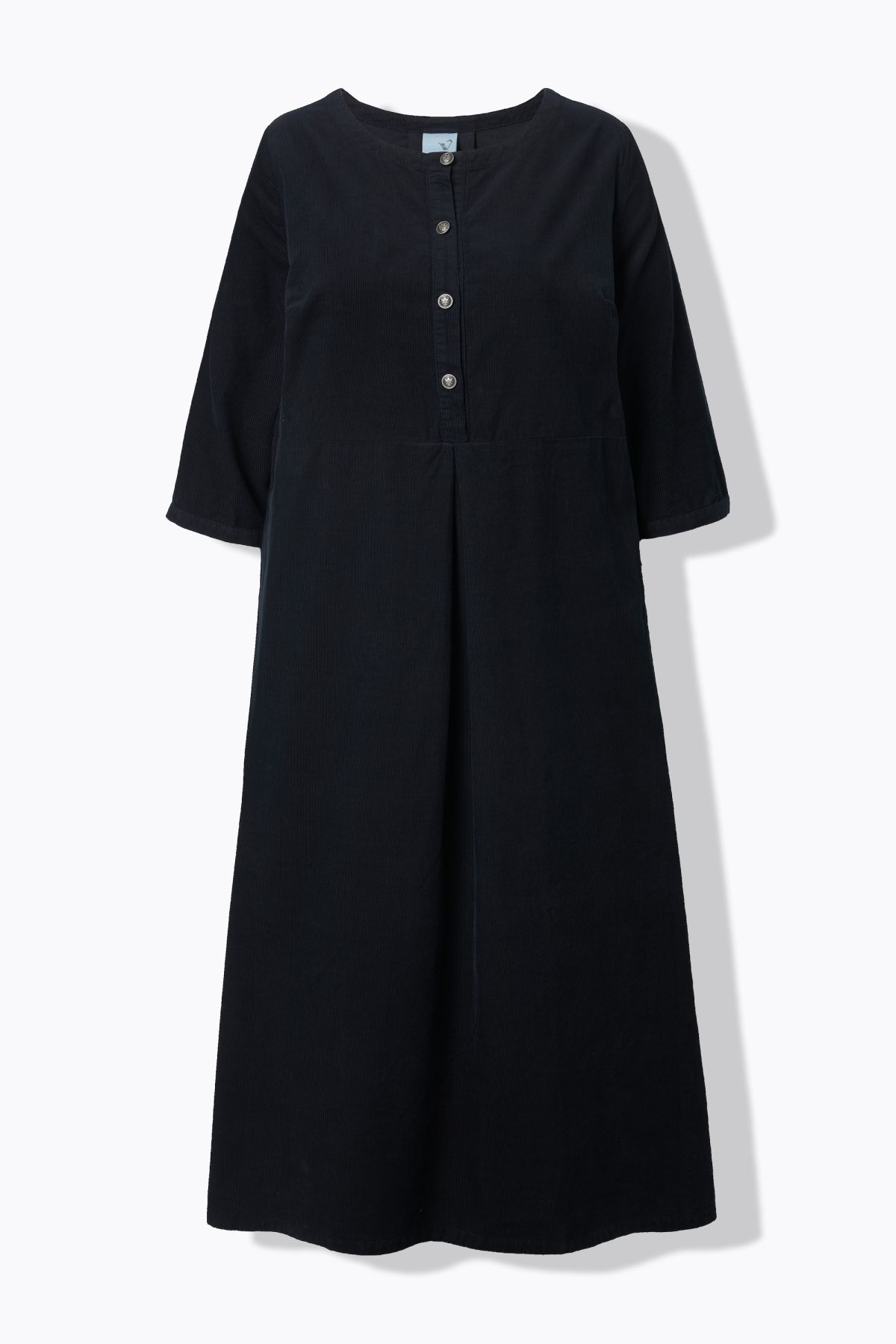 Рокля от рипсено кадифе с разкроени акценти. С деколте по врата с копчета, шевов акцент на талията и 3/4 ръкави. С женствен силует, подходящ за ежедневието.