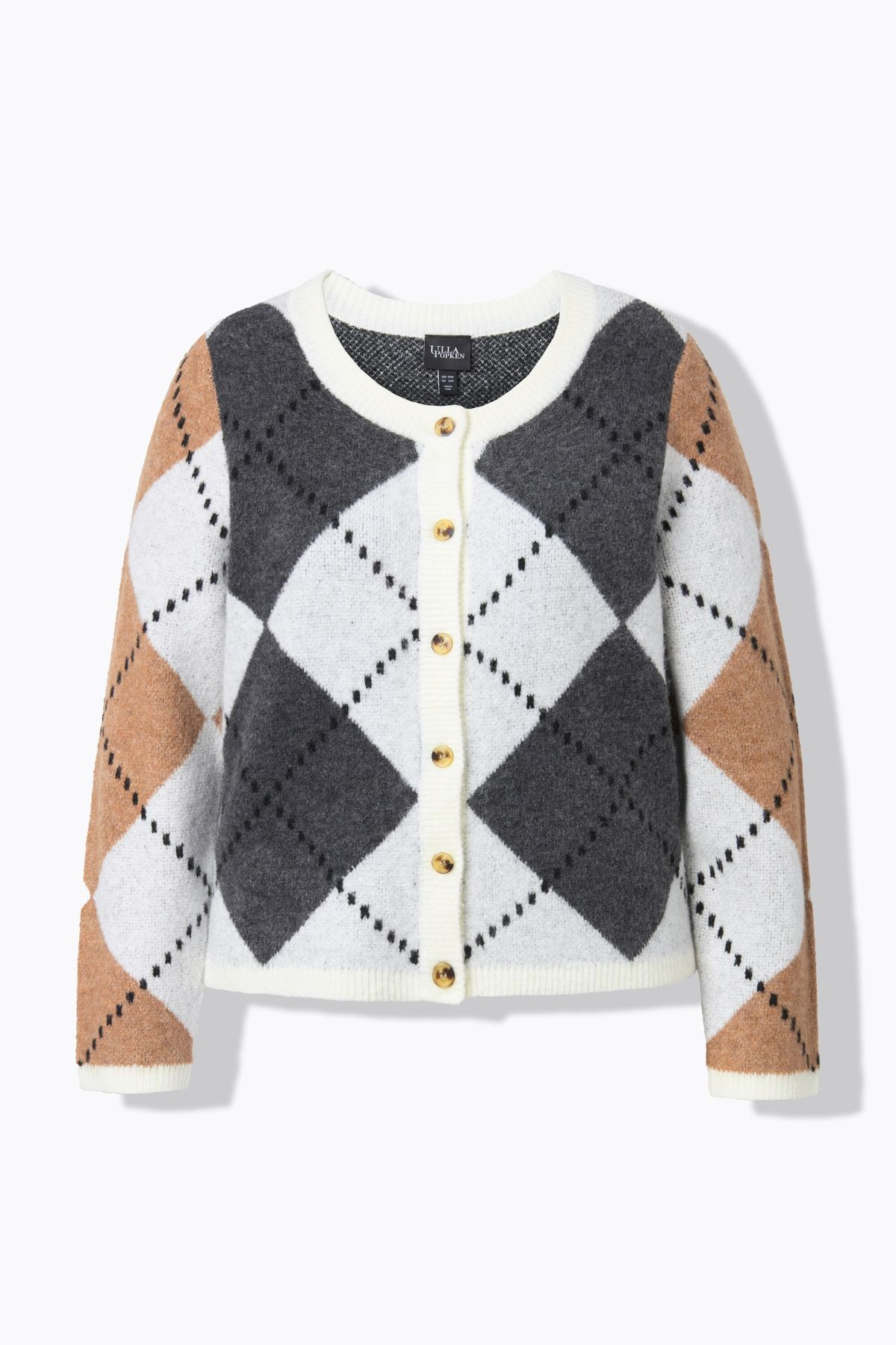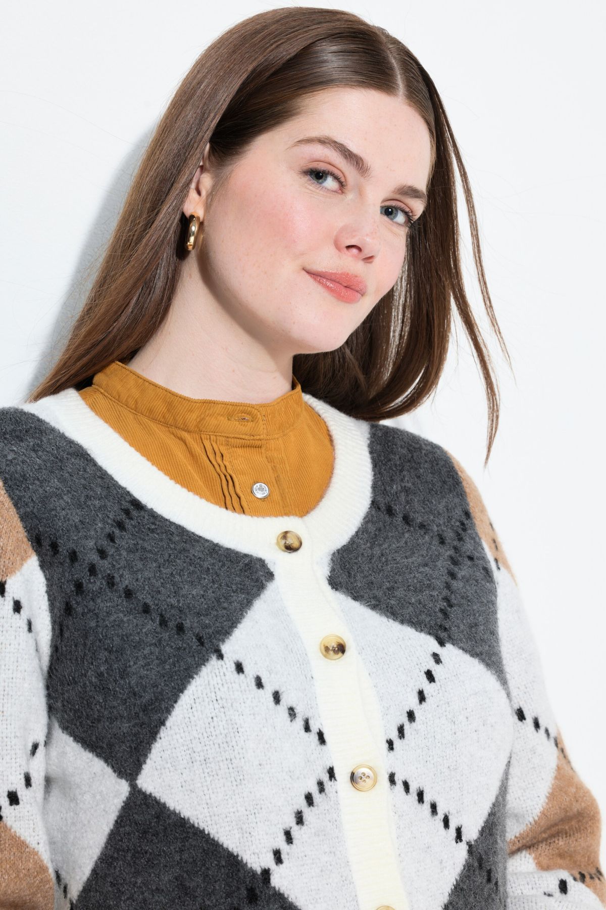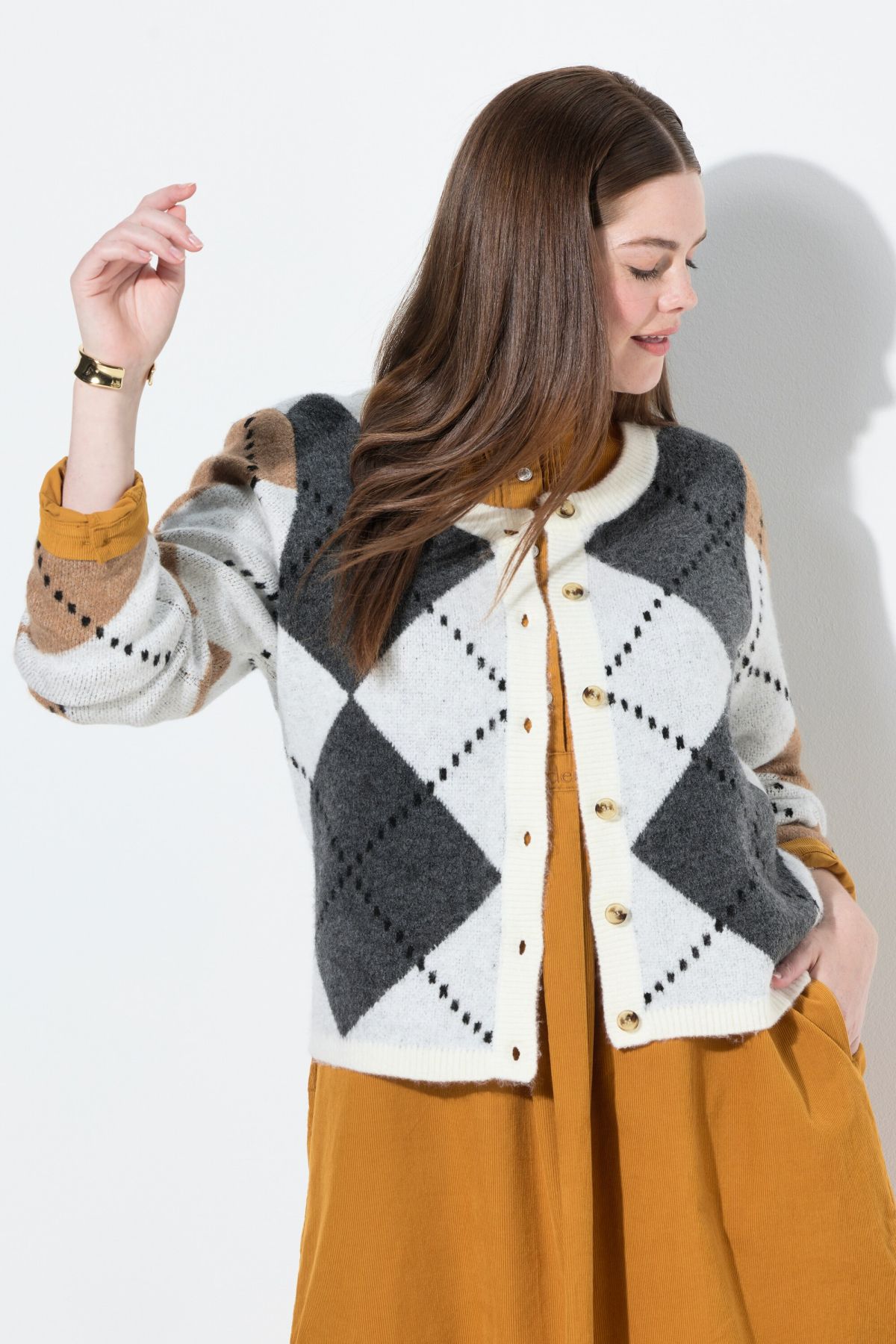 Жилетка плетена с ромбоидни акценти. Свежи и лесни за комбиниране цветове. С копчета отпред, кръгло деколте и дълги ръкави.