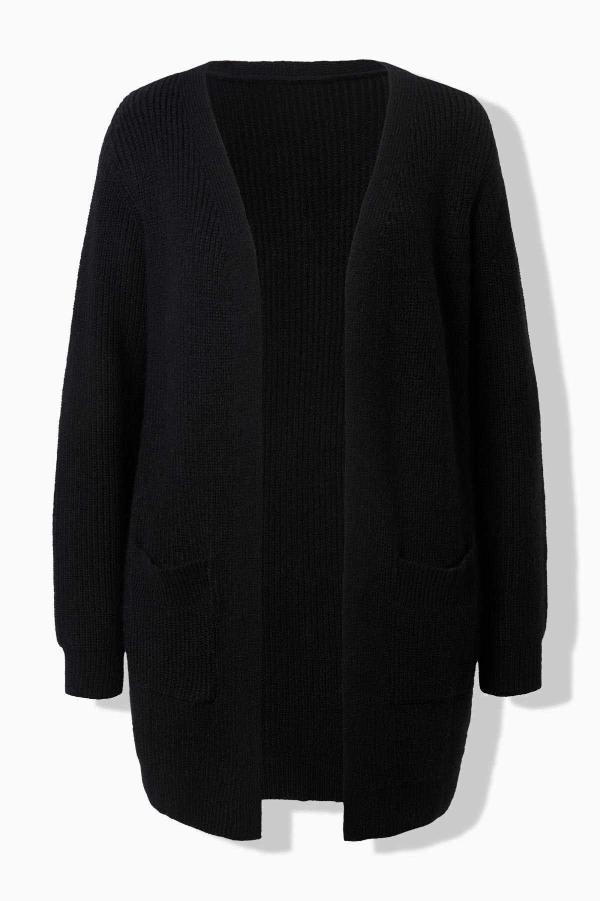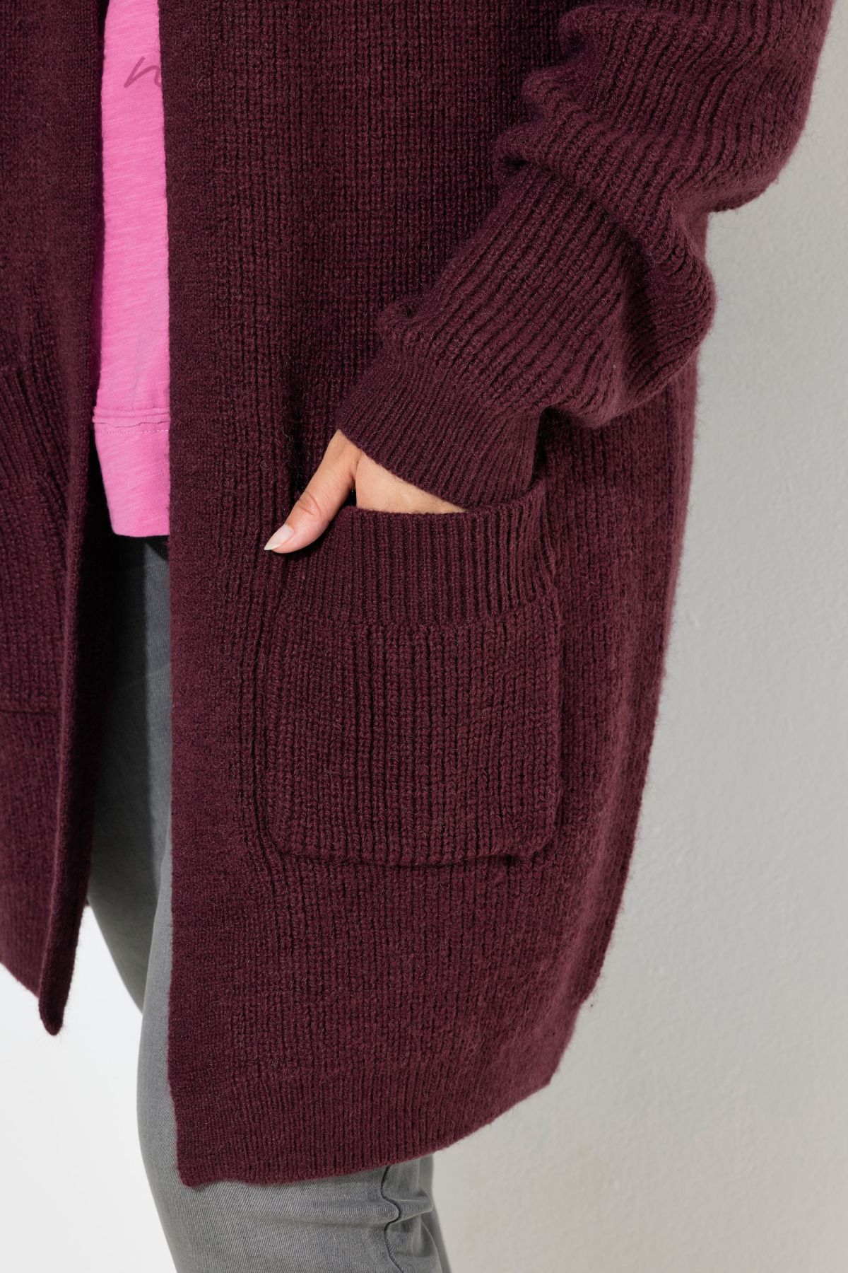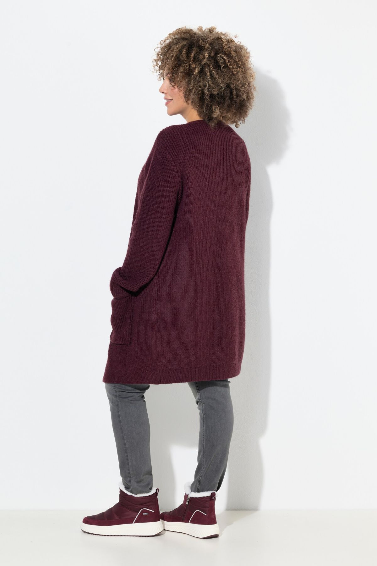 Нашивки с джобове, V-образно деколте, закопчаване с копчета, подгъв и дълги ръкави с оребрени маншети, мека фина плетка, дължина, регулирана по размер, приблизително 77-81 см.